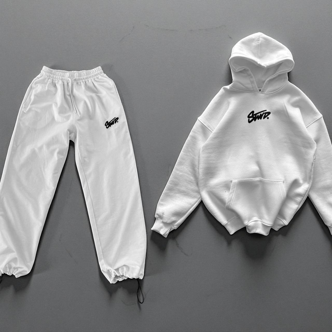 Мужской Хлопковый Белый Спортивный Костюм Оверсайз с Фиксаторами – Худи + Штаны
