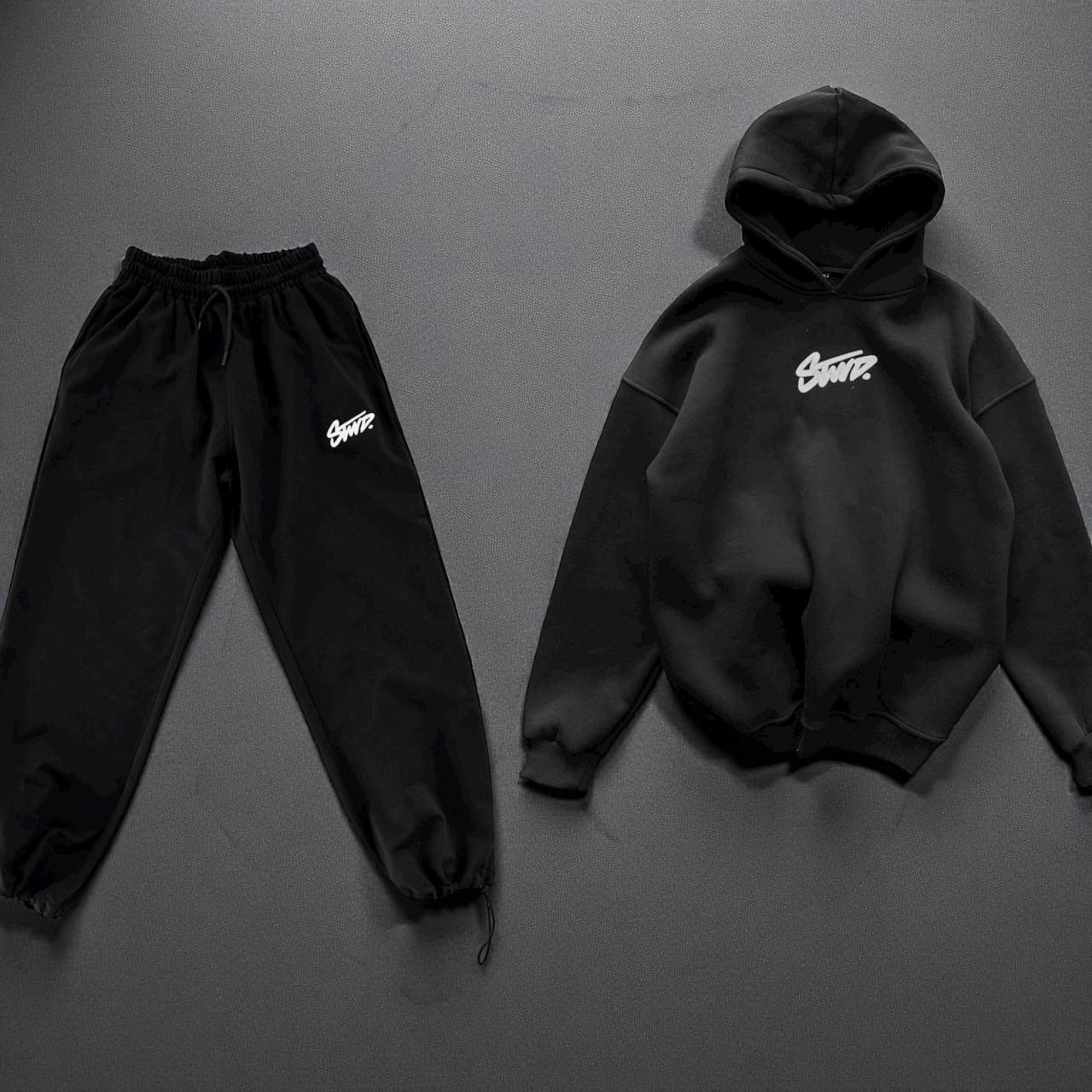 Мужской Хлопковый Черный Спортивный Костюм Оверсайз с Фиксаторами – Худи + Штаны