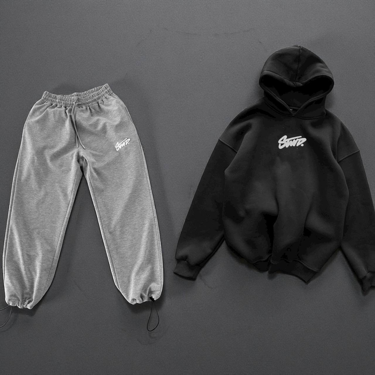 Мужской Хлопковый Спортивный Костюм Оверсайз с Фиксаторами – Черное Худи + Серые Штаны