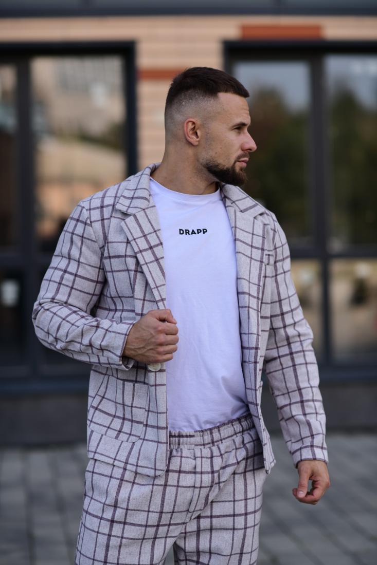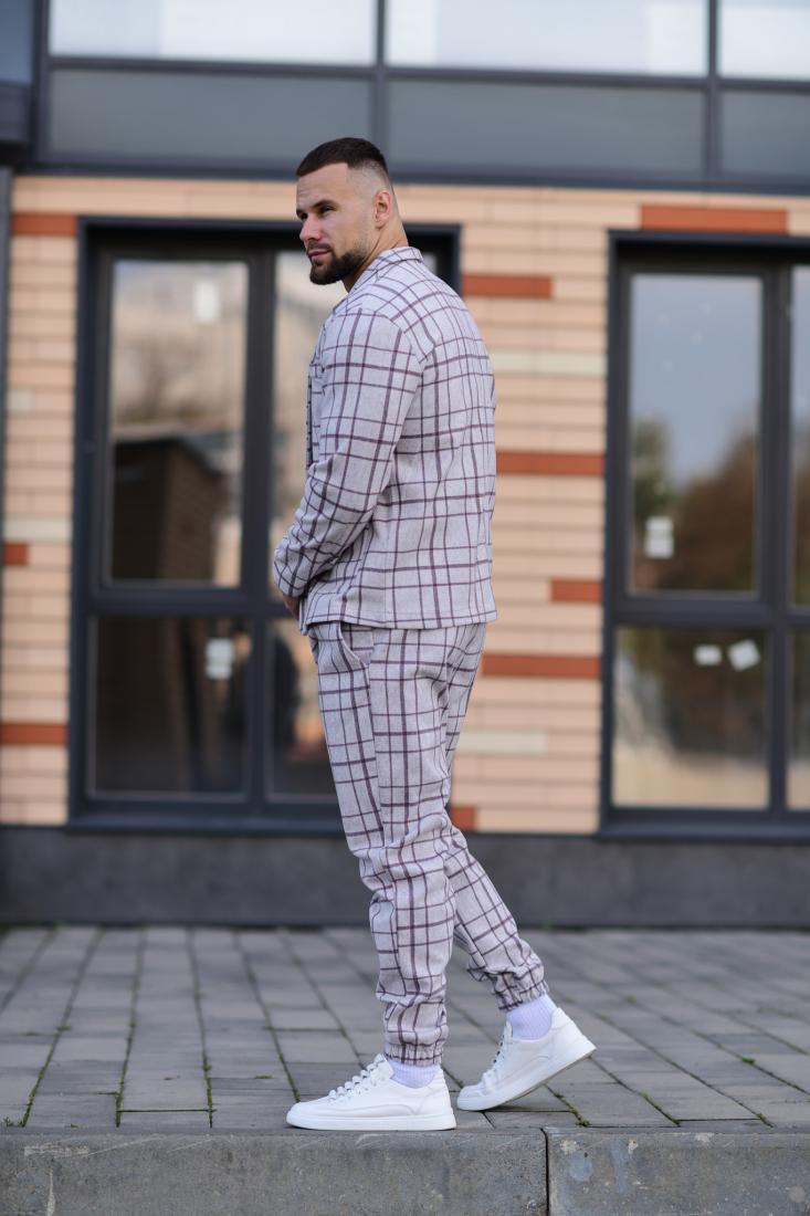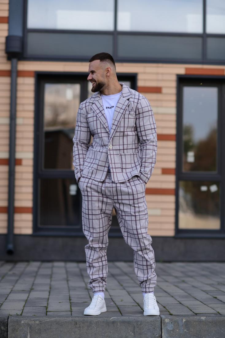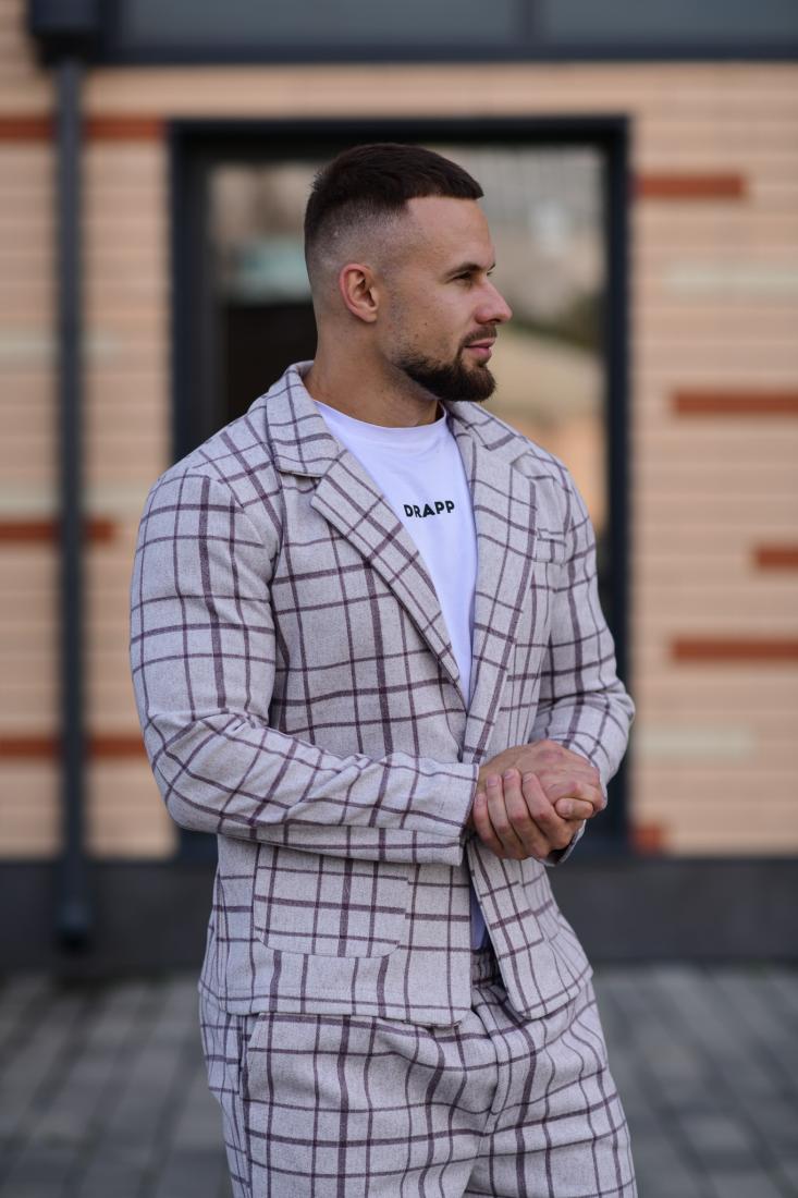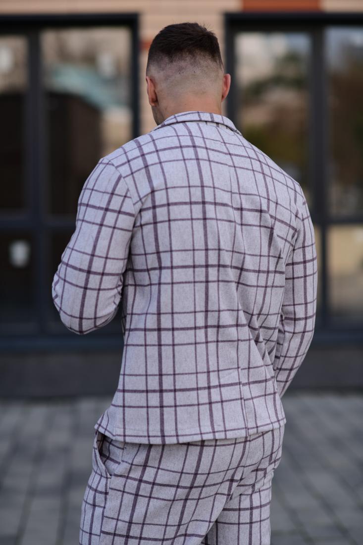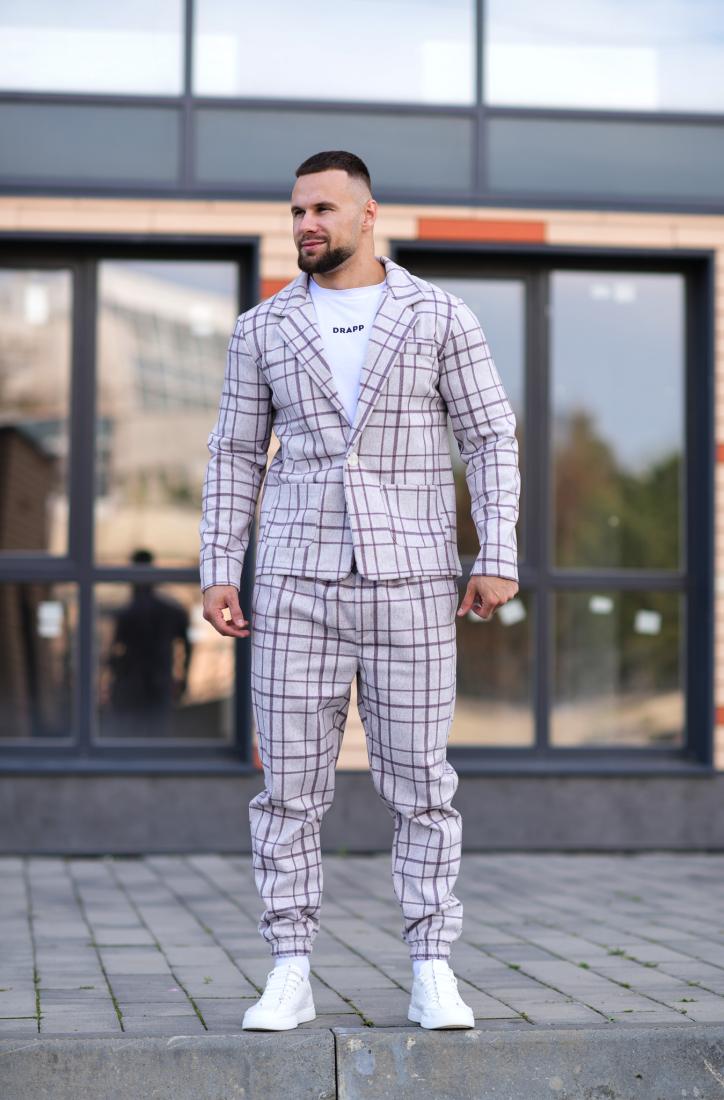 Мужской Классический Светло-Серый Костюм в Клетчатый Принт (Жакет + Штаны)