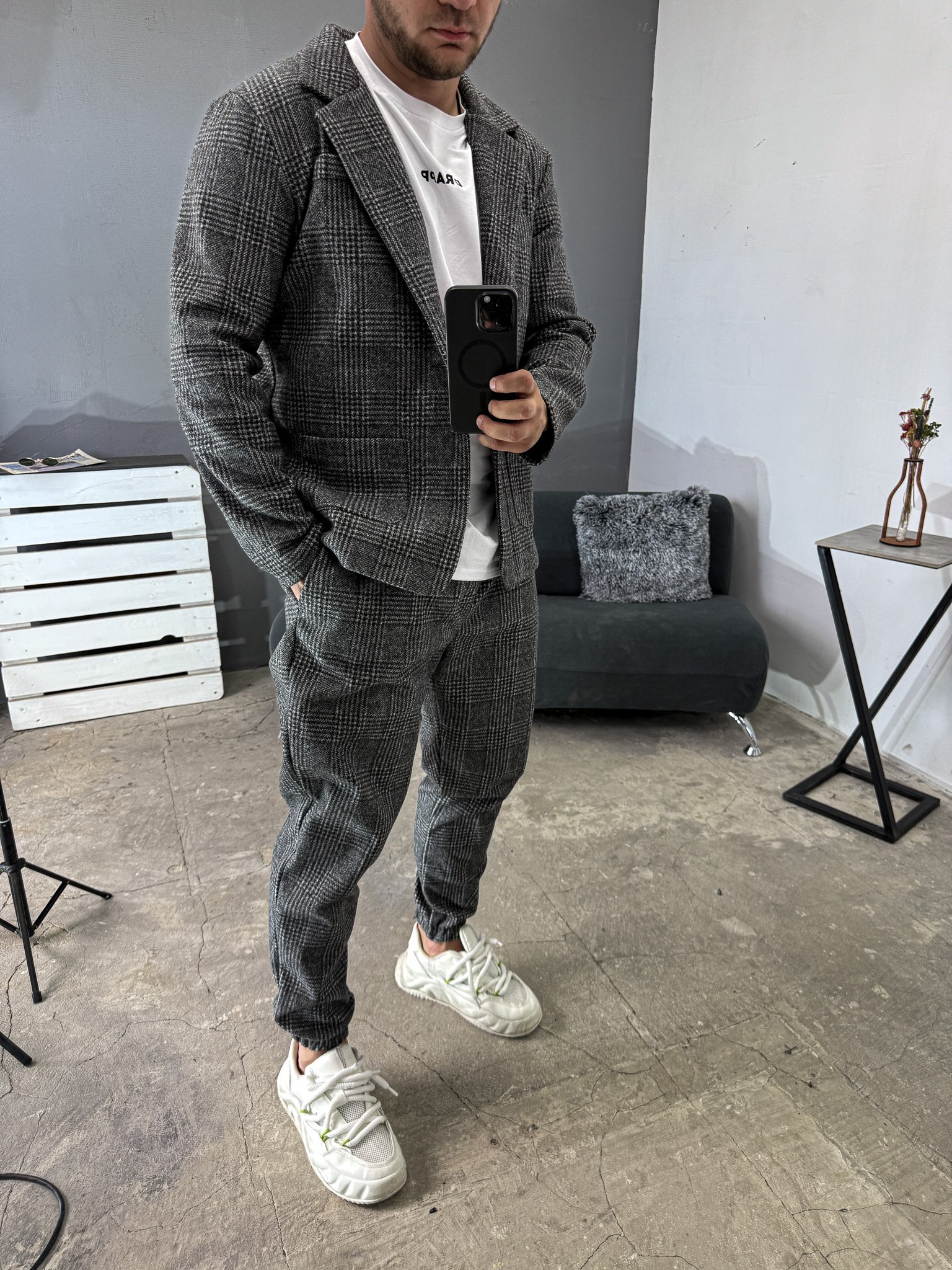 Мужской Классический Темно-Серый Костюм в Клетчатый Принт (Жакет + Штаны)