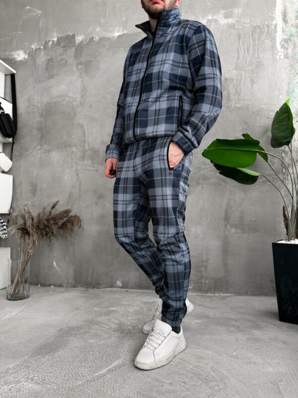 Мужской Клетчатый Серый Костюм Джентельмен на Флисе – Кофта на Молнии + Штаны с Манжетами