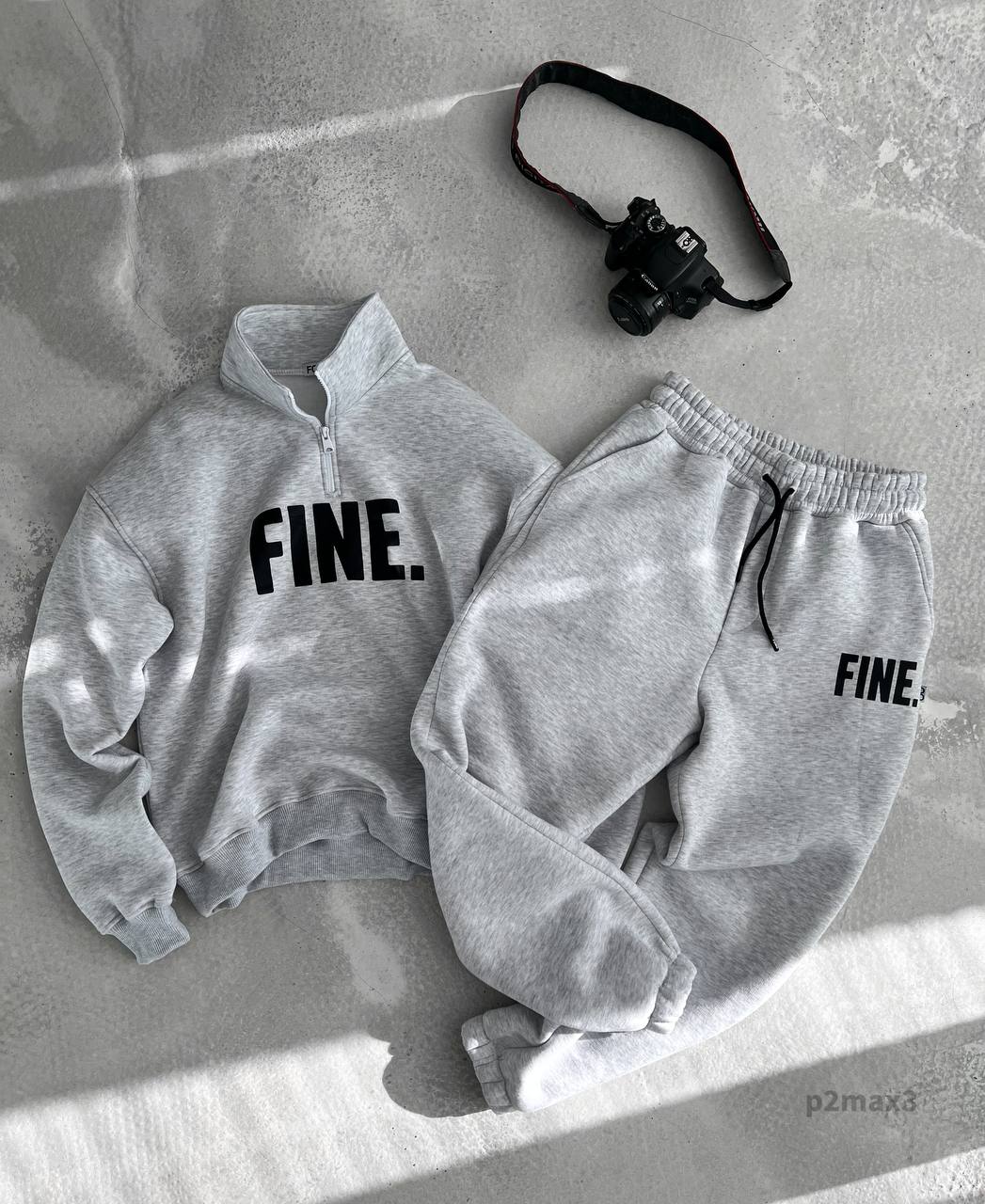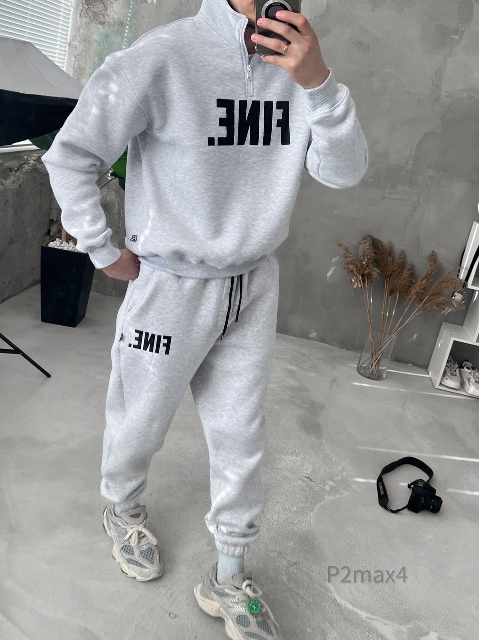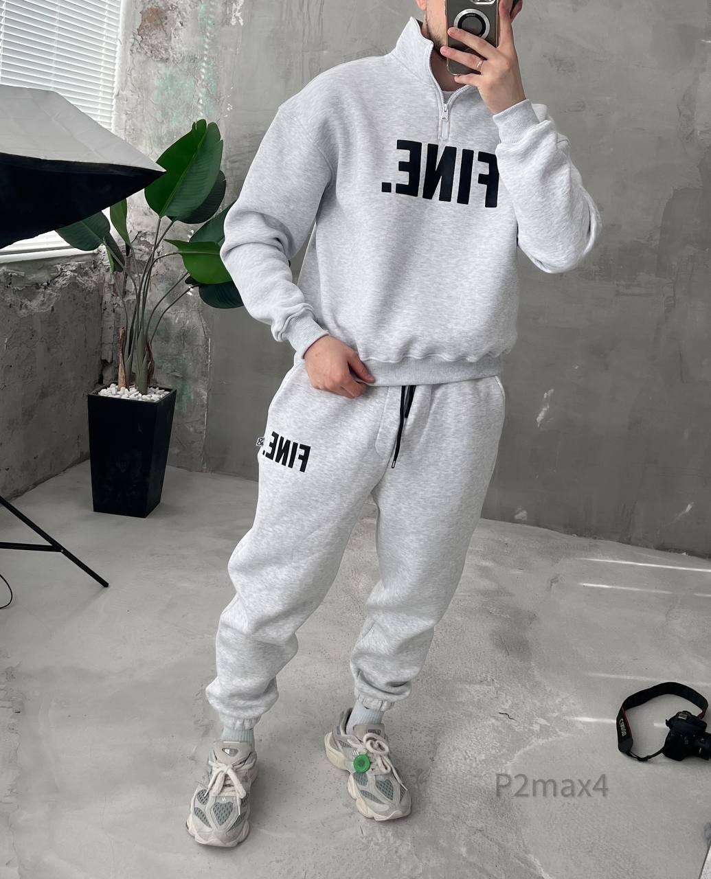 Мужской Костюм Серый Меланж с Надписью “Fine” – Свитшот под Горло + Штаны Джоггеры