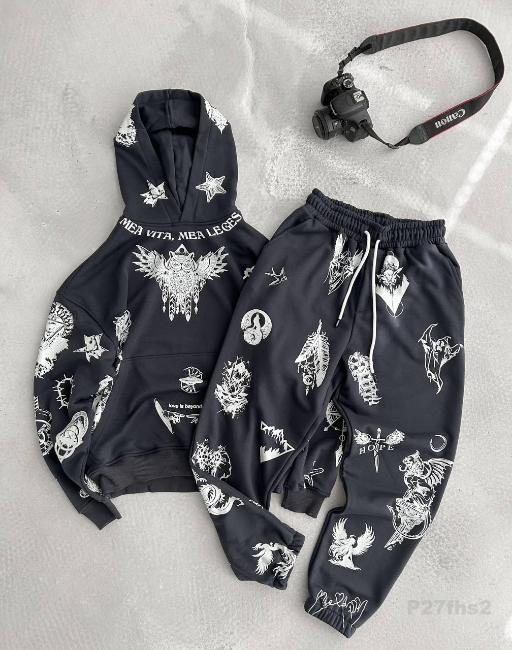 Мужской Принтованный Графитовый Костюм Худи Джоггеры Свободного Кроя