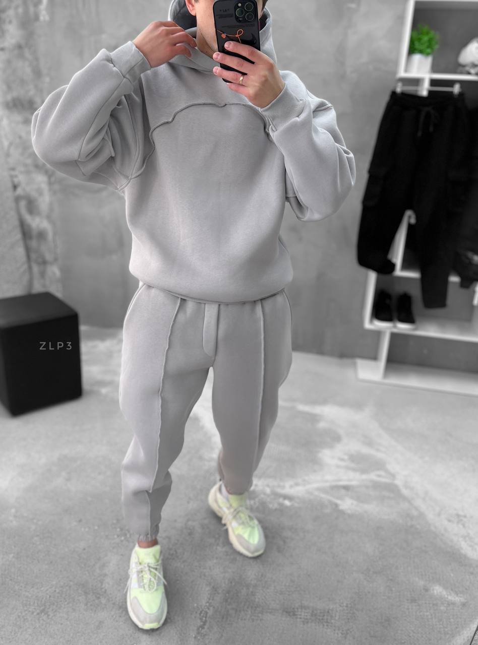 Мужской Серый Костюм Худи и Штаны – Теплый на Флисе с Декоративными Швами Наизнанку