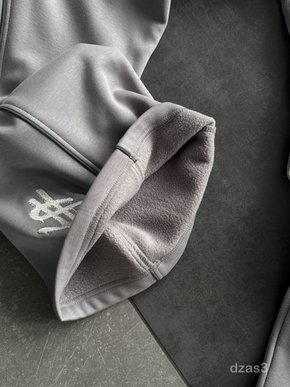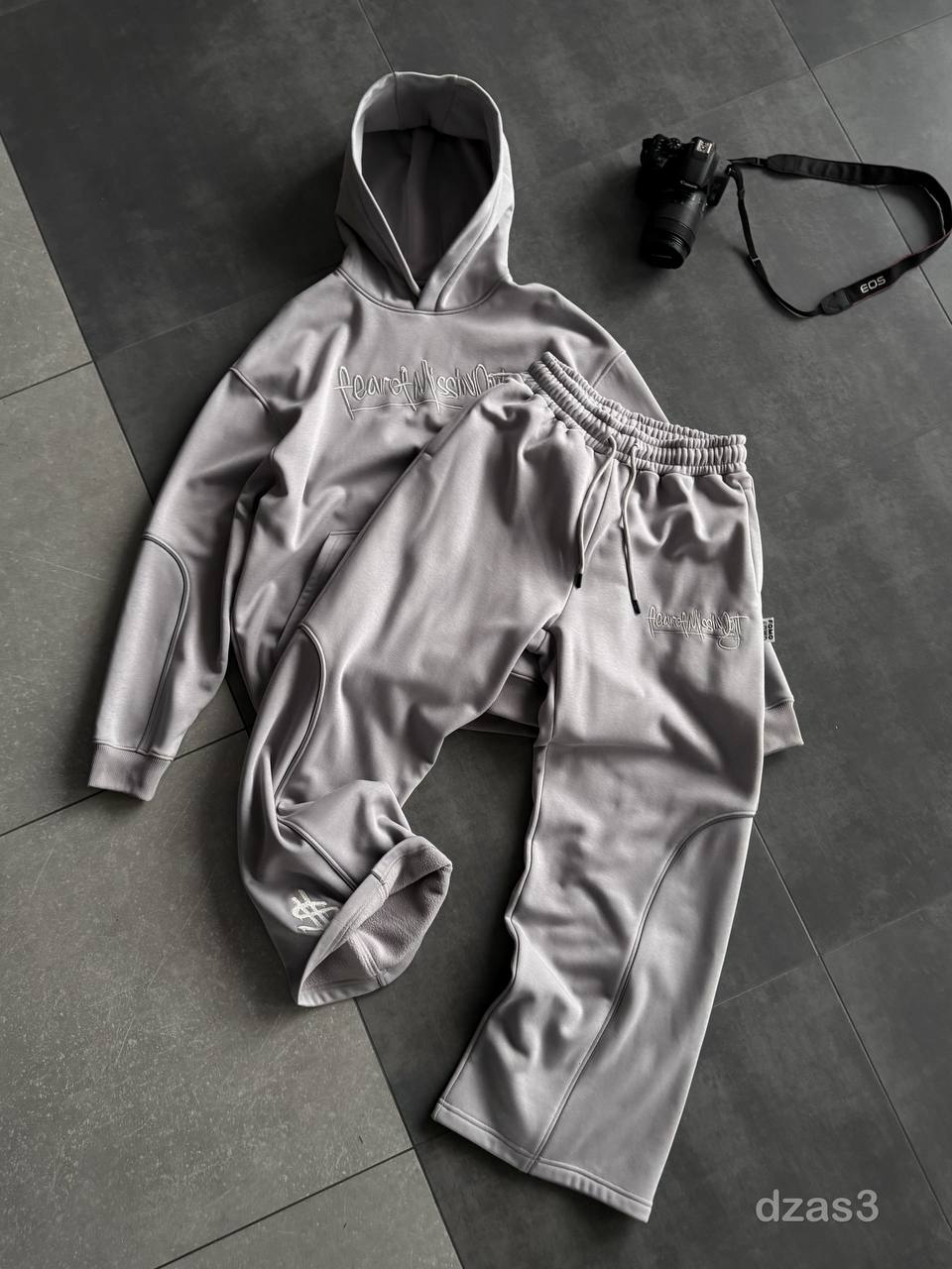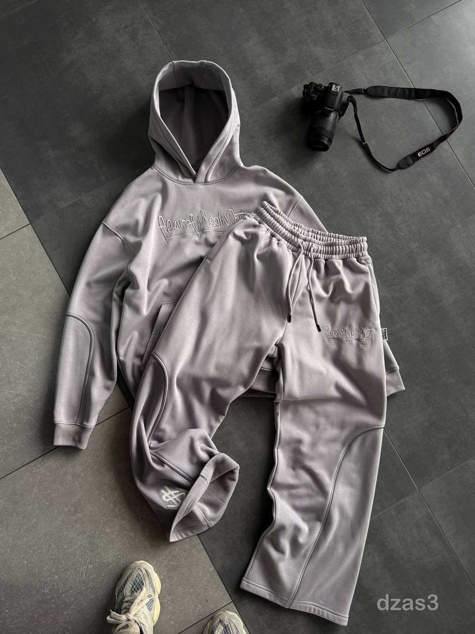 Мужской Серый Костюм Худи Штаны Оверсайз с Вышивкой и Кантом – Утепленный на Флисе