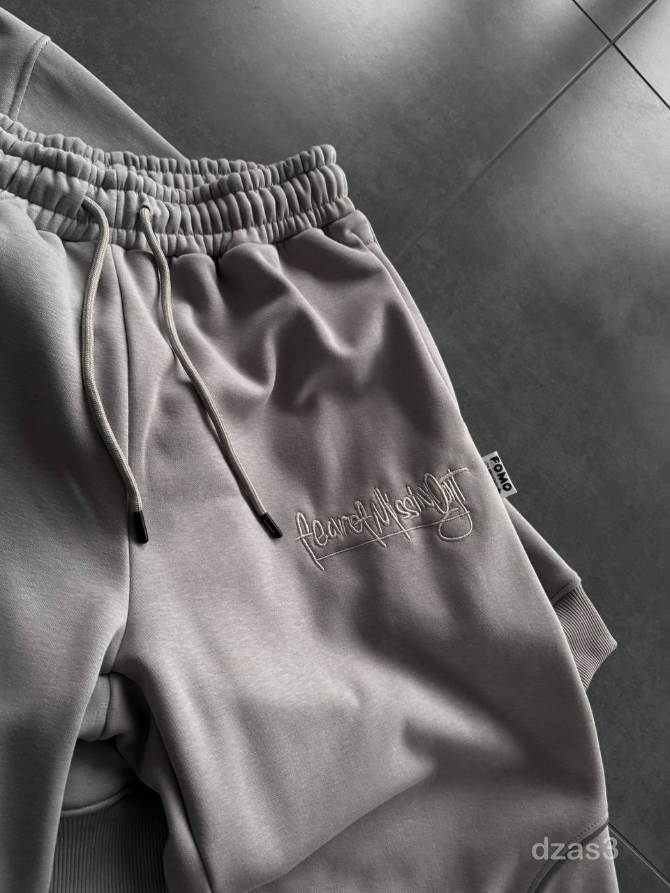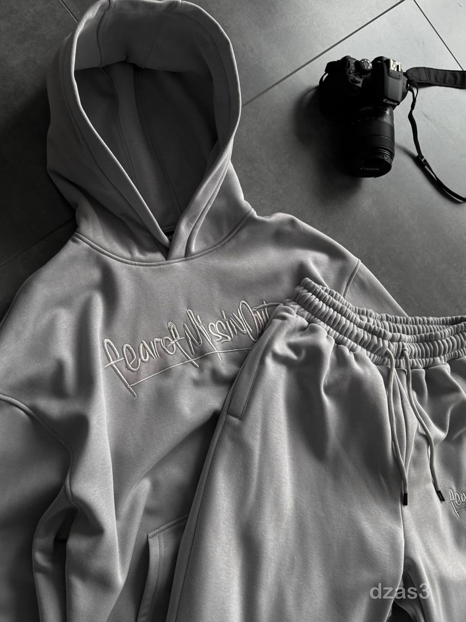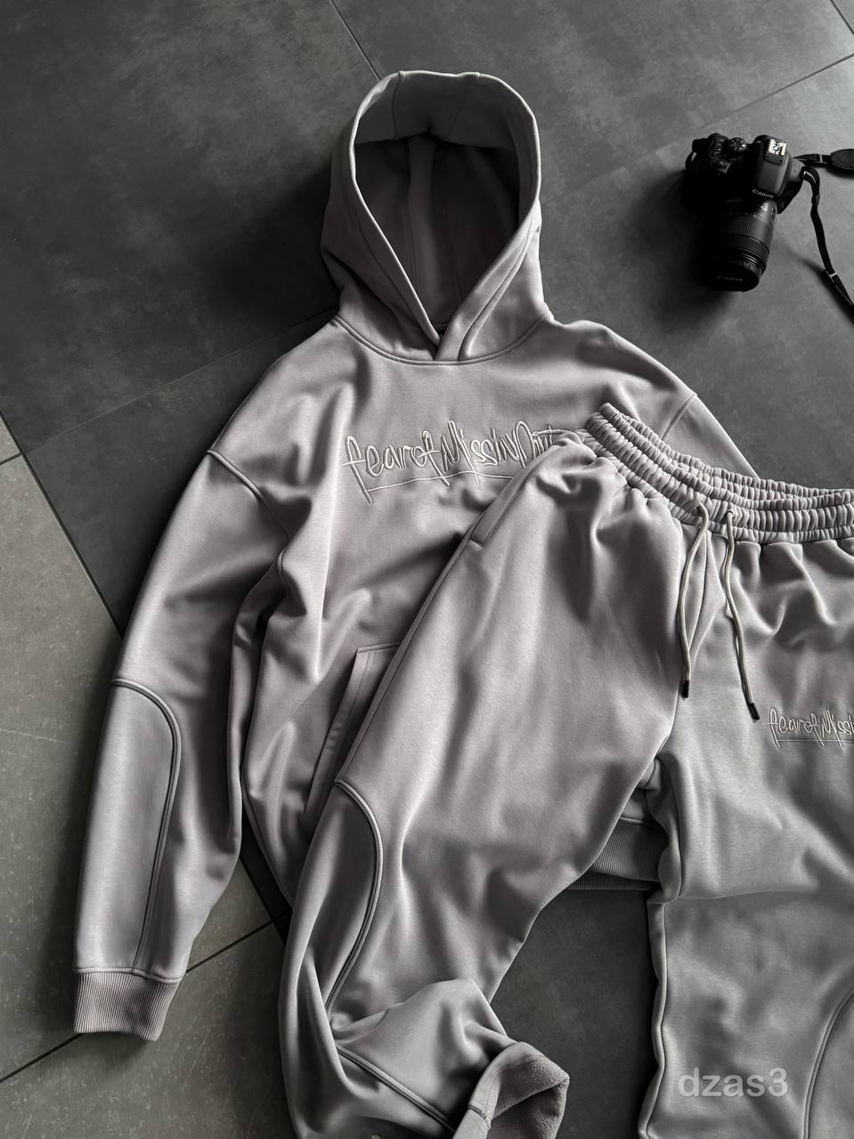 Мужской Серый Костюм Худи Штаны Оверсайз с Вышивкой и Кантом – Утепленный на Флисе