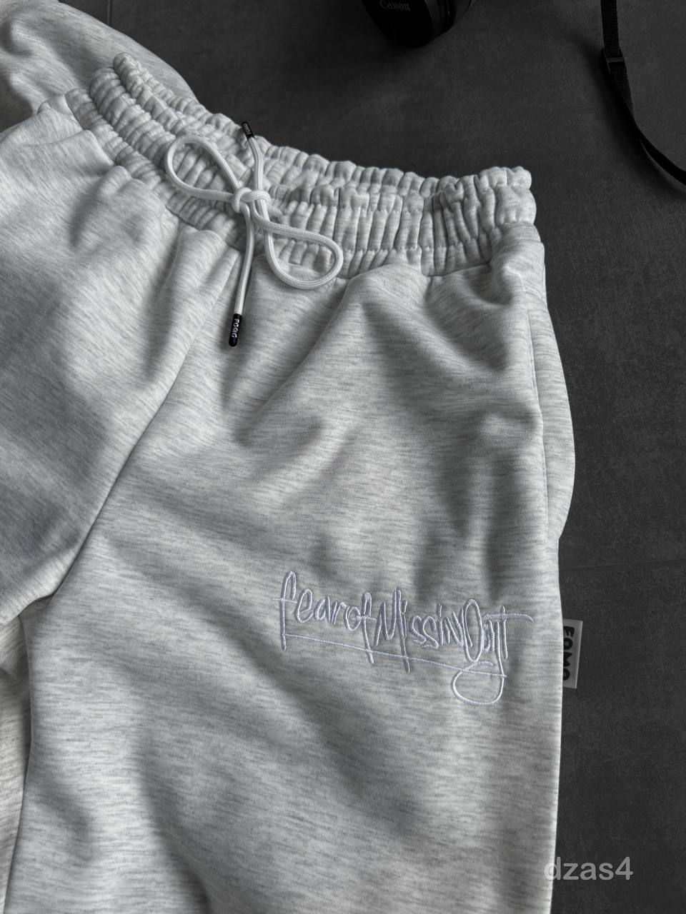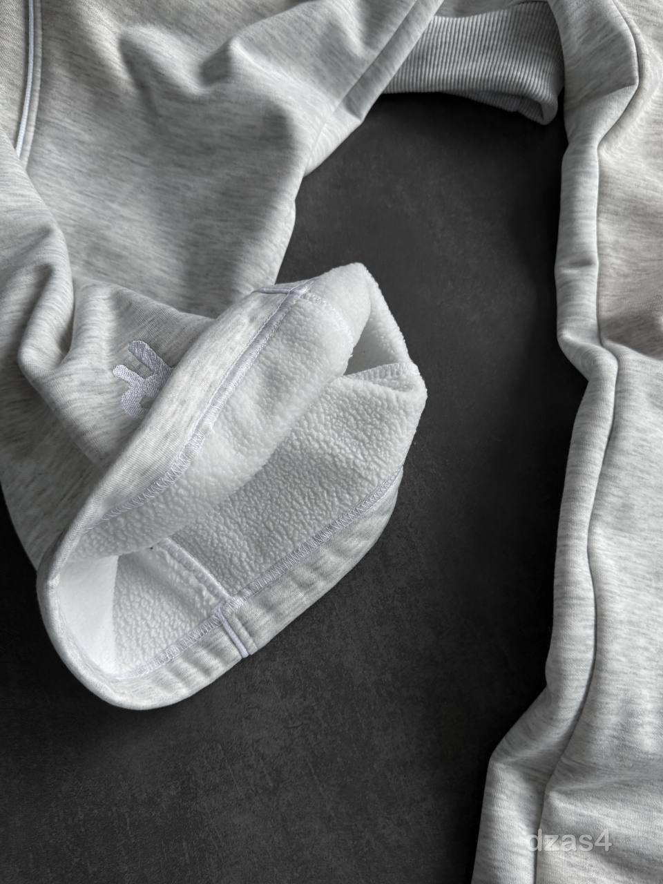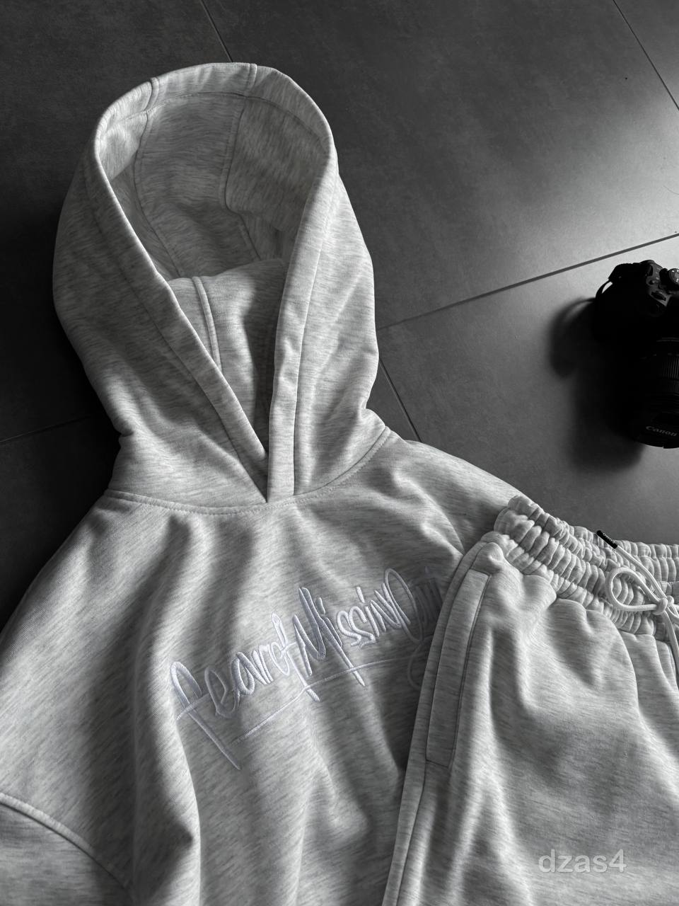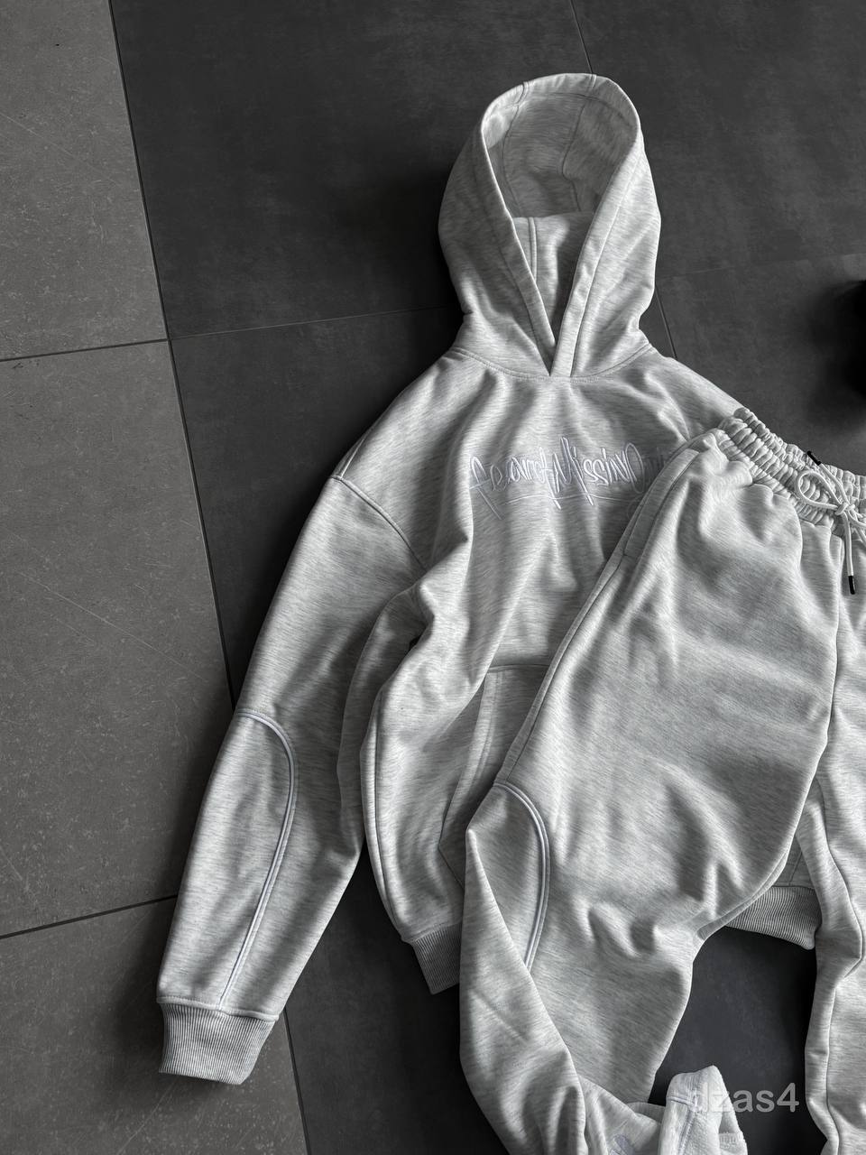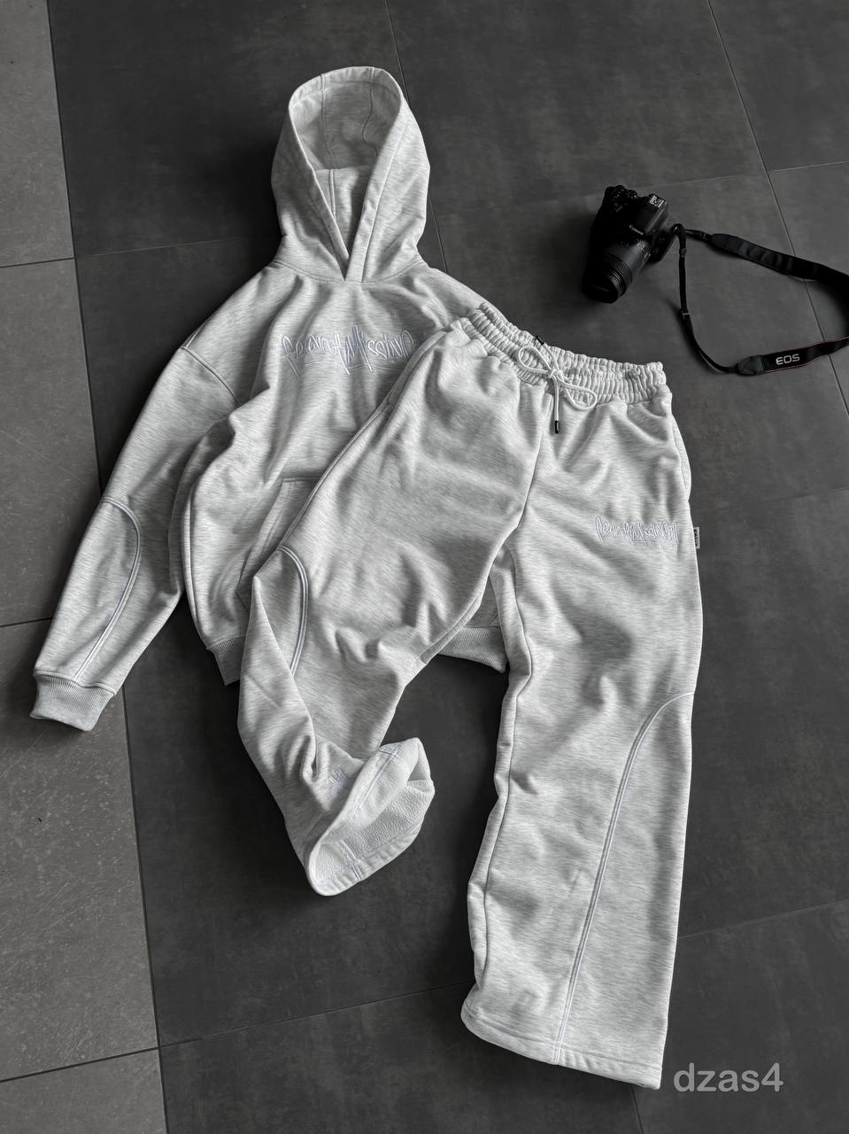 Мужской Серый Меланж Костюм Худи Штаны Оверсайз с Вышивкой и Кантом – Утепленный на Флисе