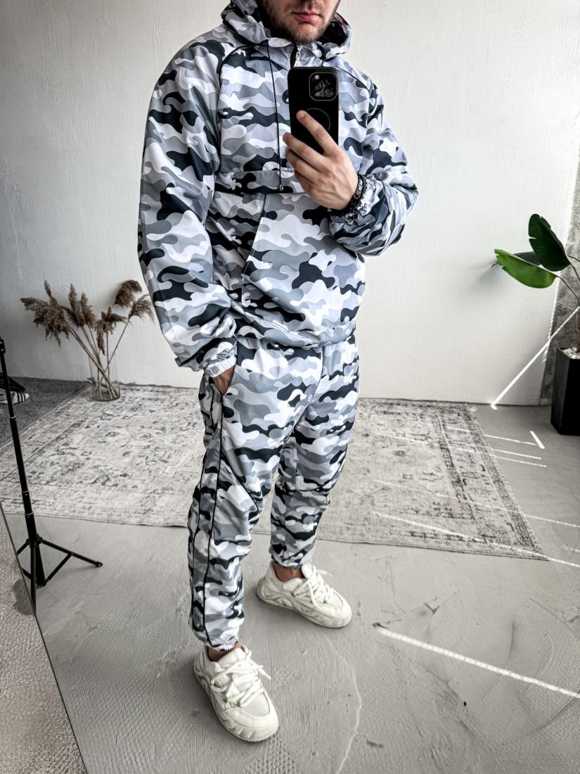 Мужской Серый Спортивный Костюм Плащевка в Камуфляжный Принт (Анорак + Джоггеры)