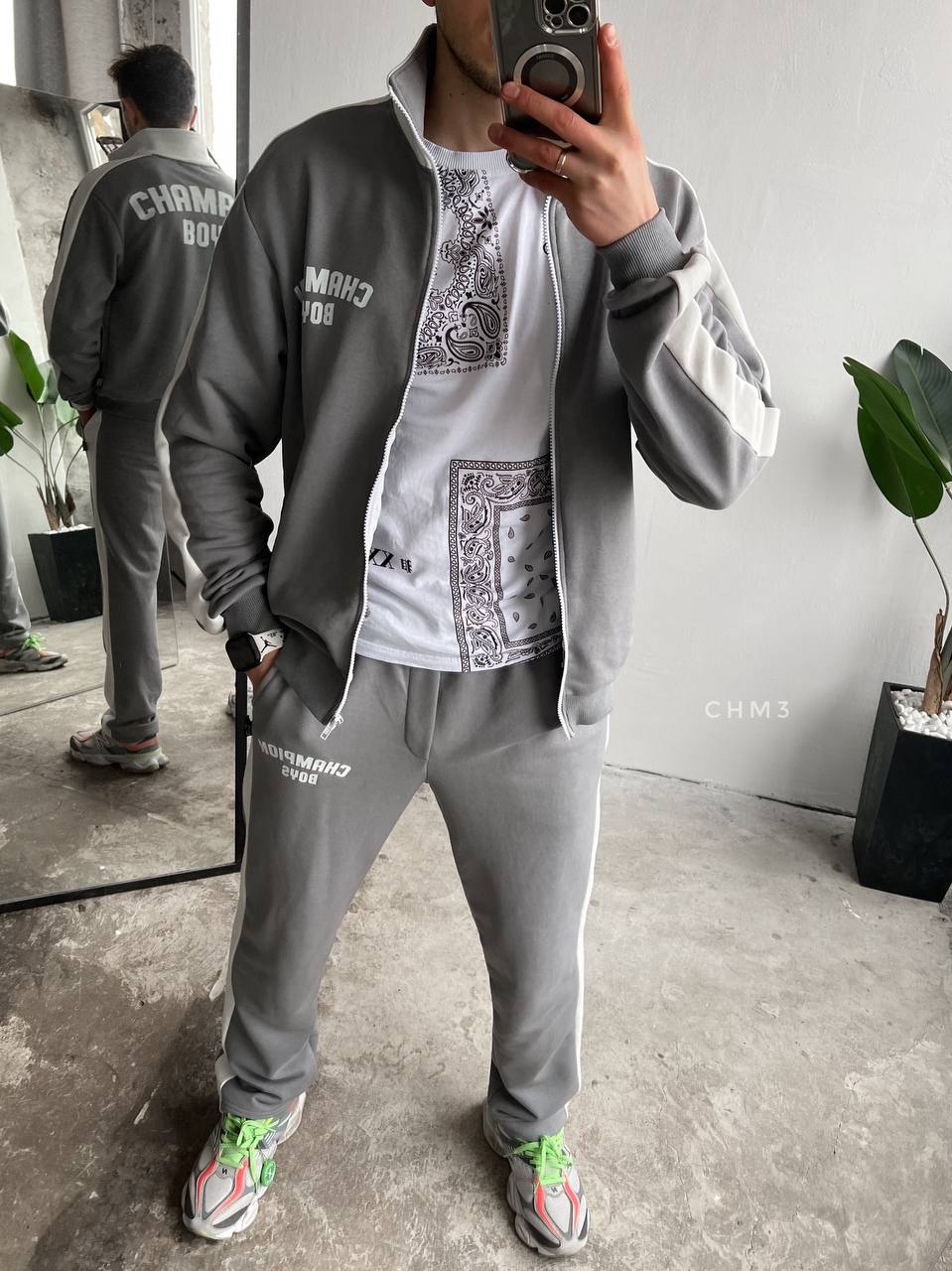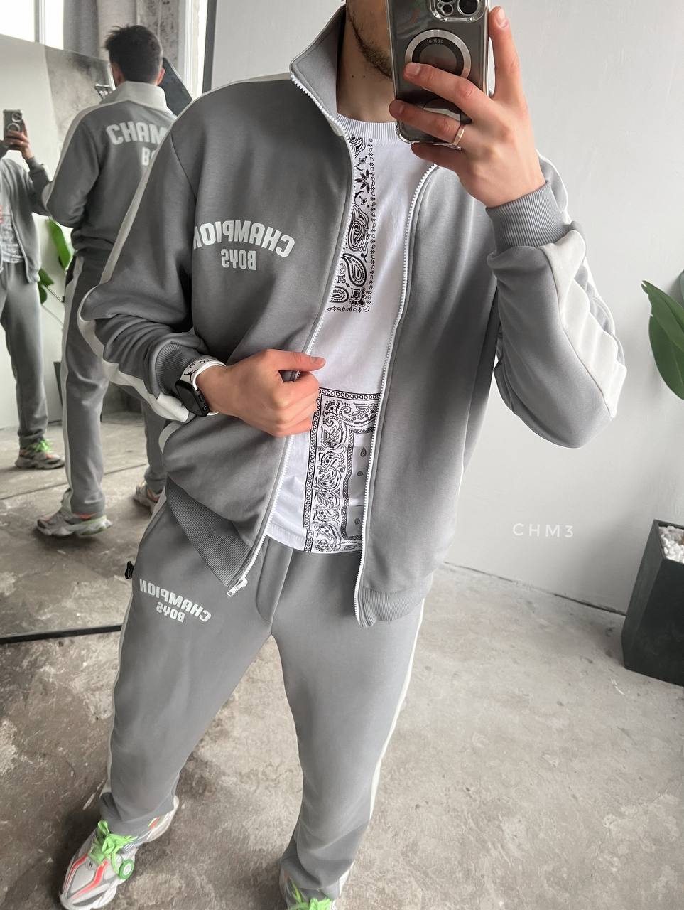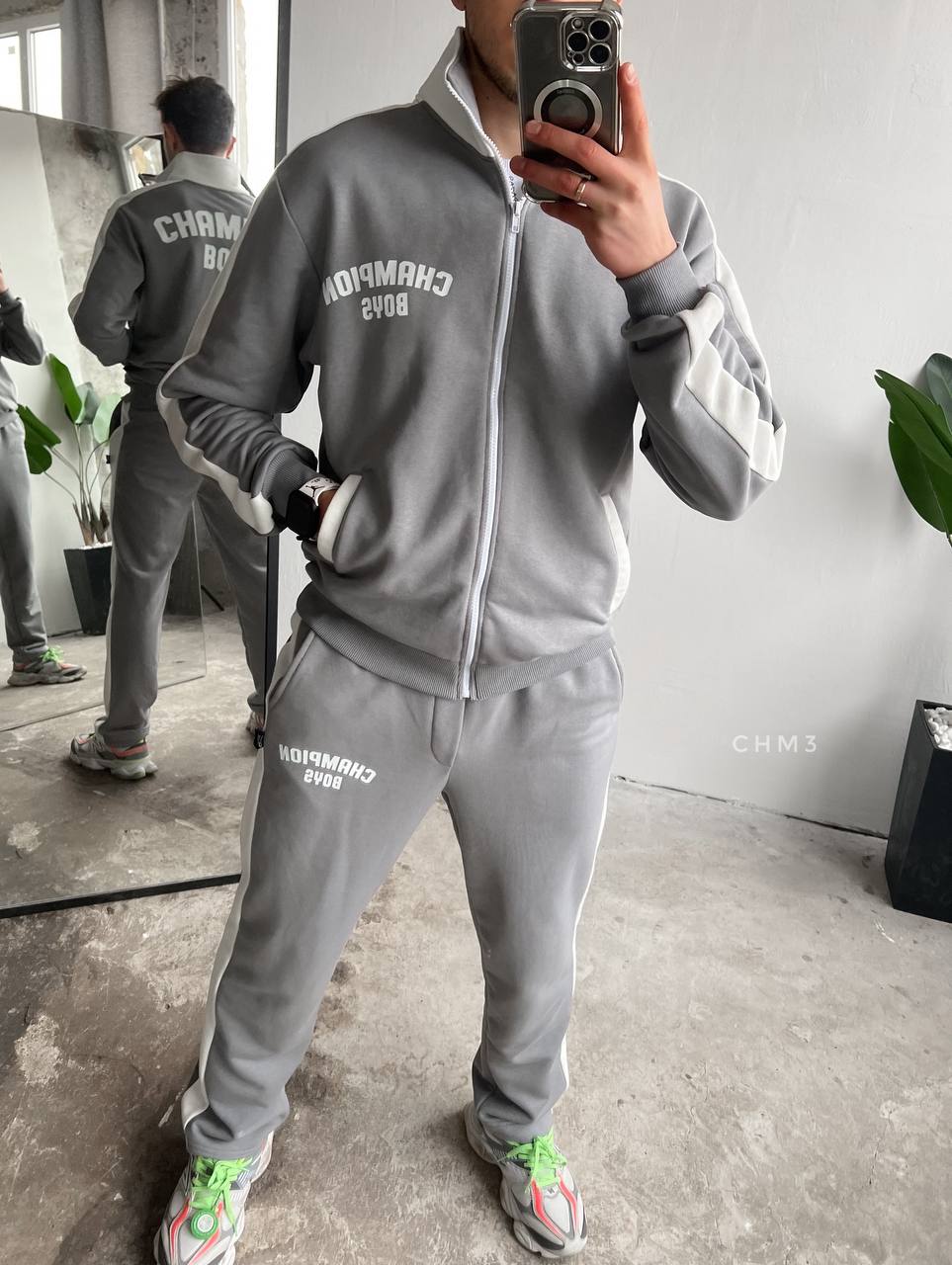 Мужской Серый Спортивный Костюм Трехнитка с Лампасами – Кофта на Молнии под Горло + Штаны