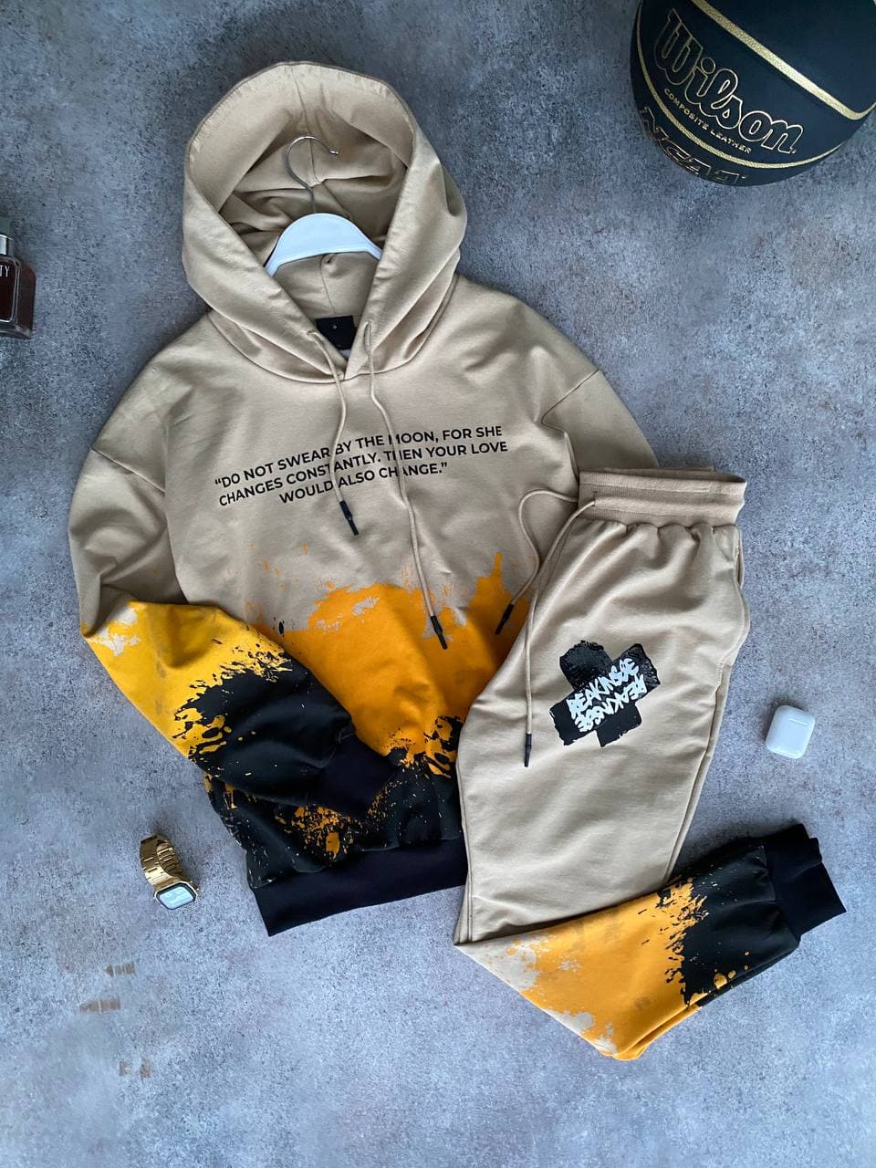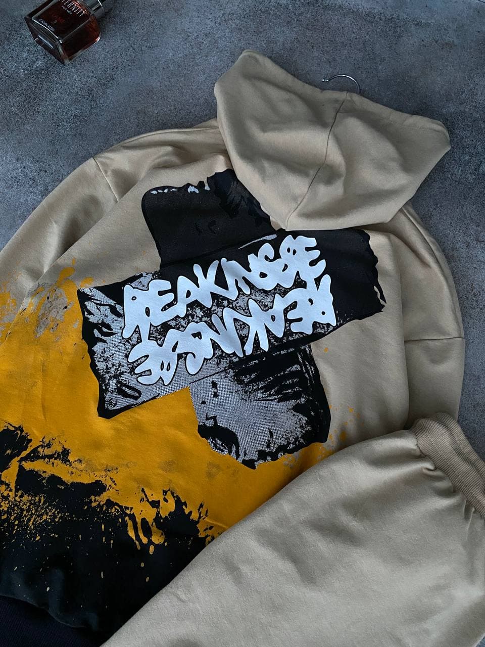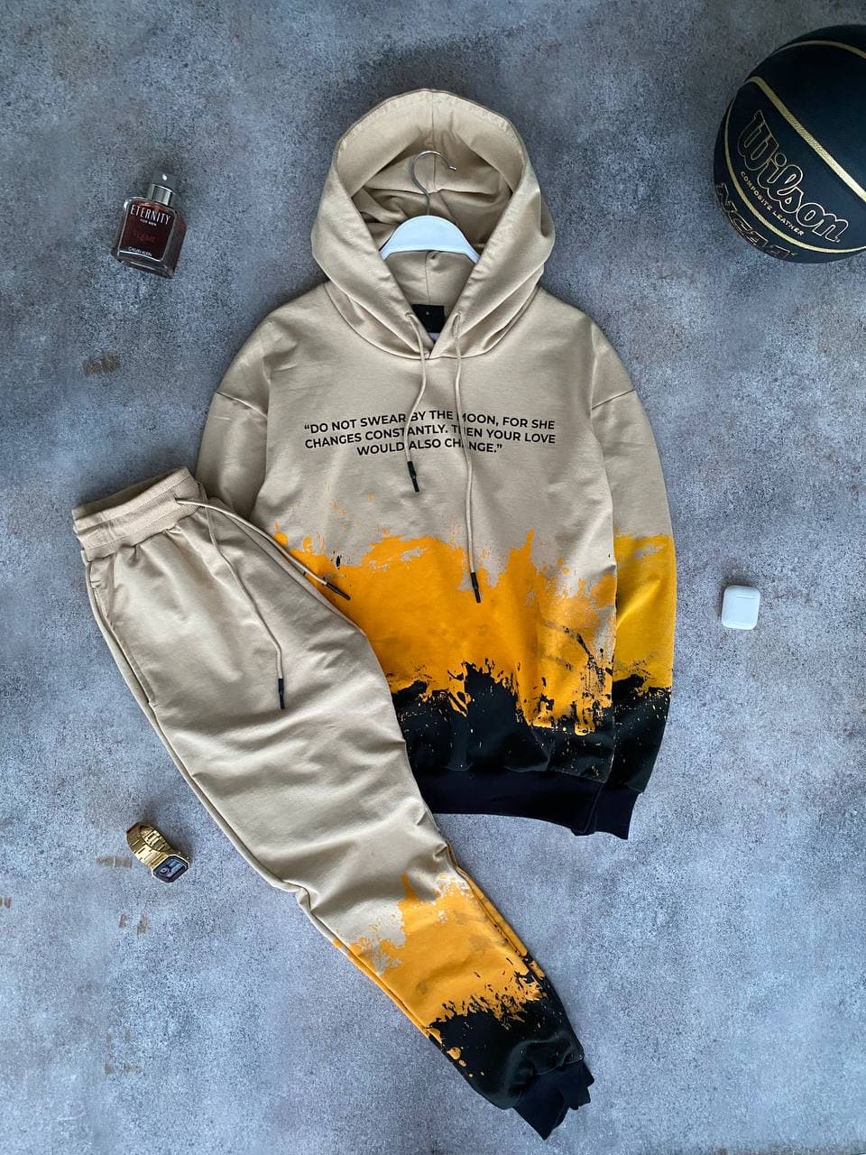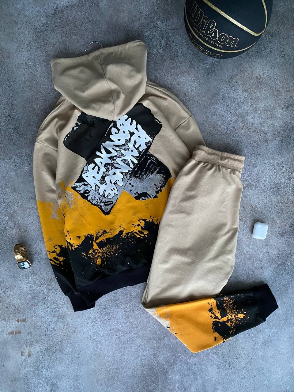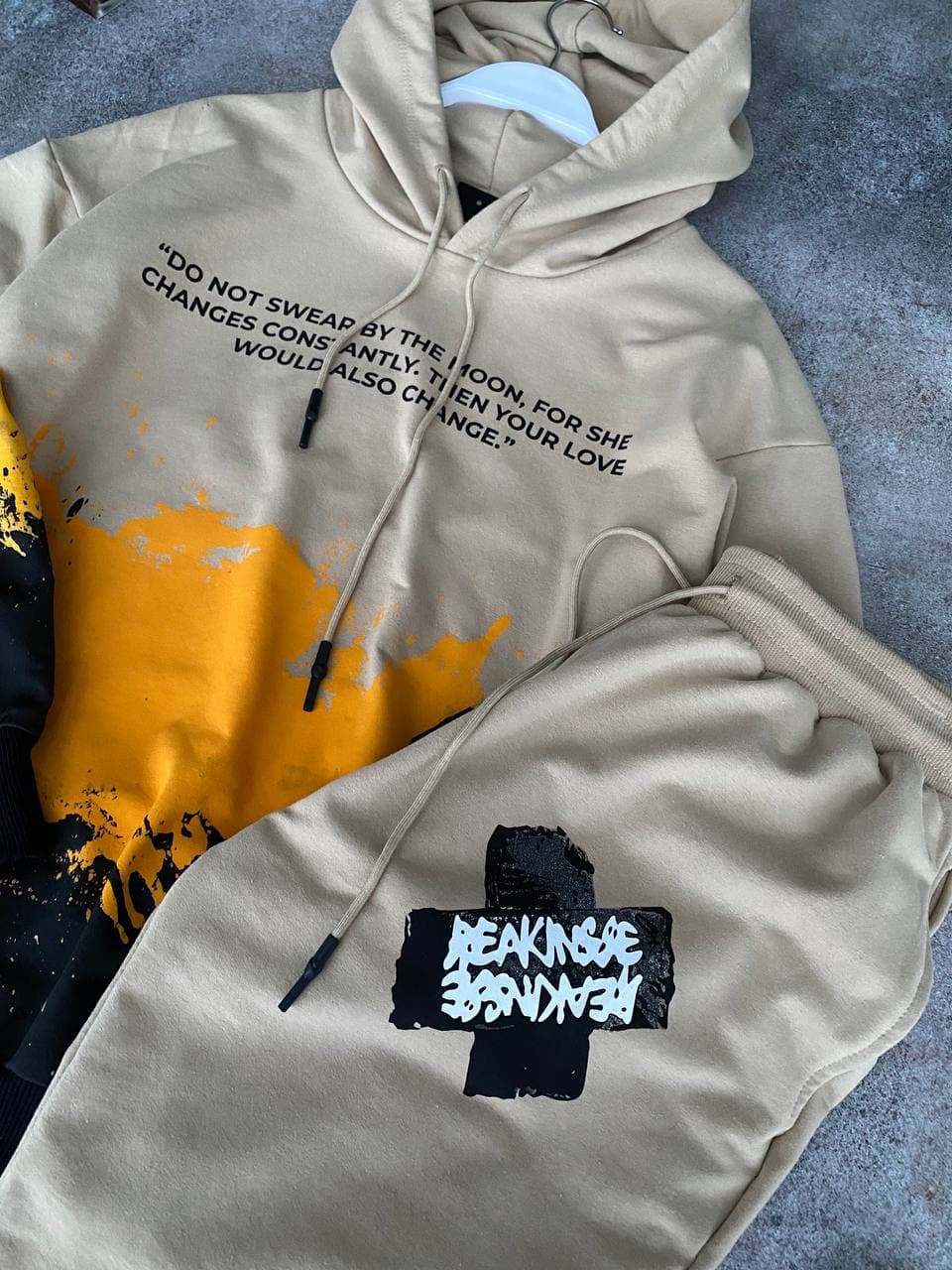 Мужской Спортивный Костюм Бежевый Оверсайз – с Принтомами Надписями на Манжетах (Худи + Штаны)