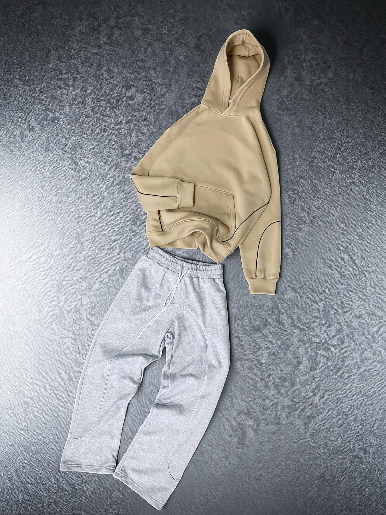 Мужской Спортивный Костюм Оверсайз с Фиксаторами и Кантом – Бежевое Худи + Серые Штаны