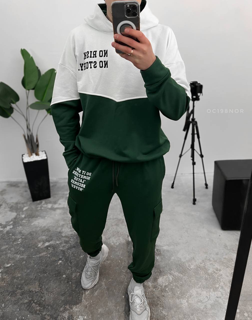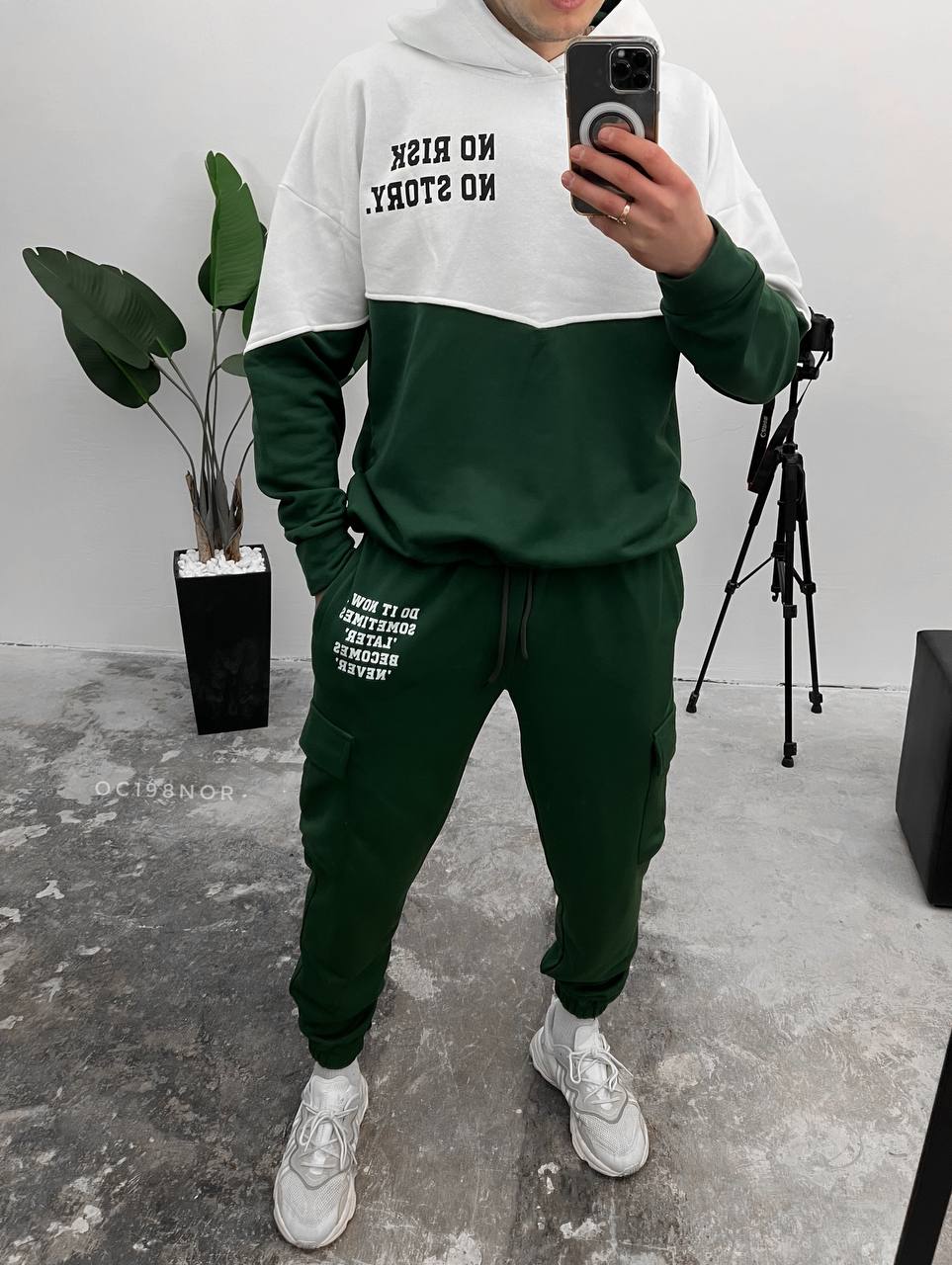 Мужской Свободный Зелено-Белый Костюм Двухцветный с Надписью – Худи Оверсайз + Штаны Карго