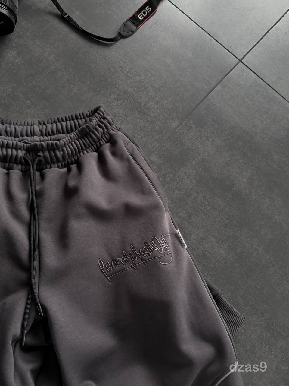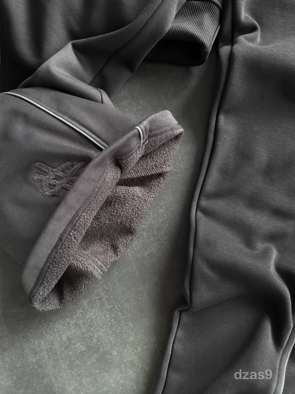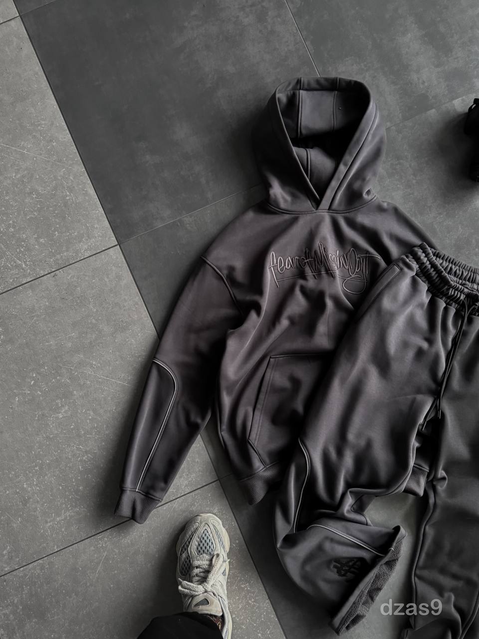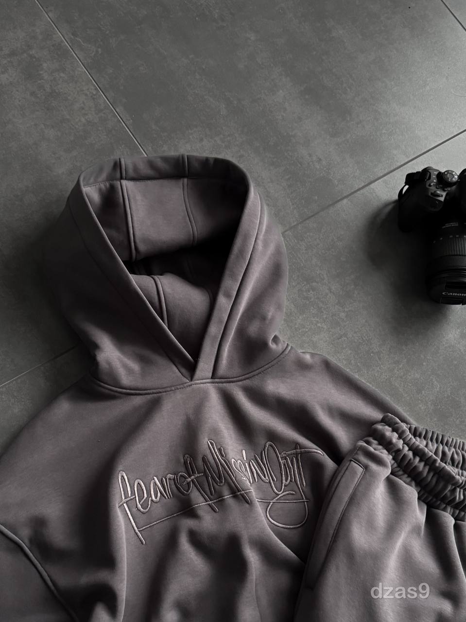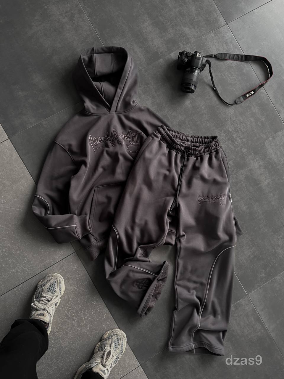 Мужской Темно-Серый Костюм Худи Штаны Оверсайз с Вышивкой и Кантом – Утепленный на Флисе