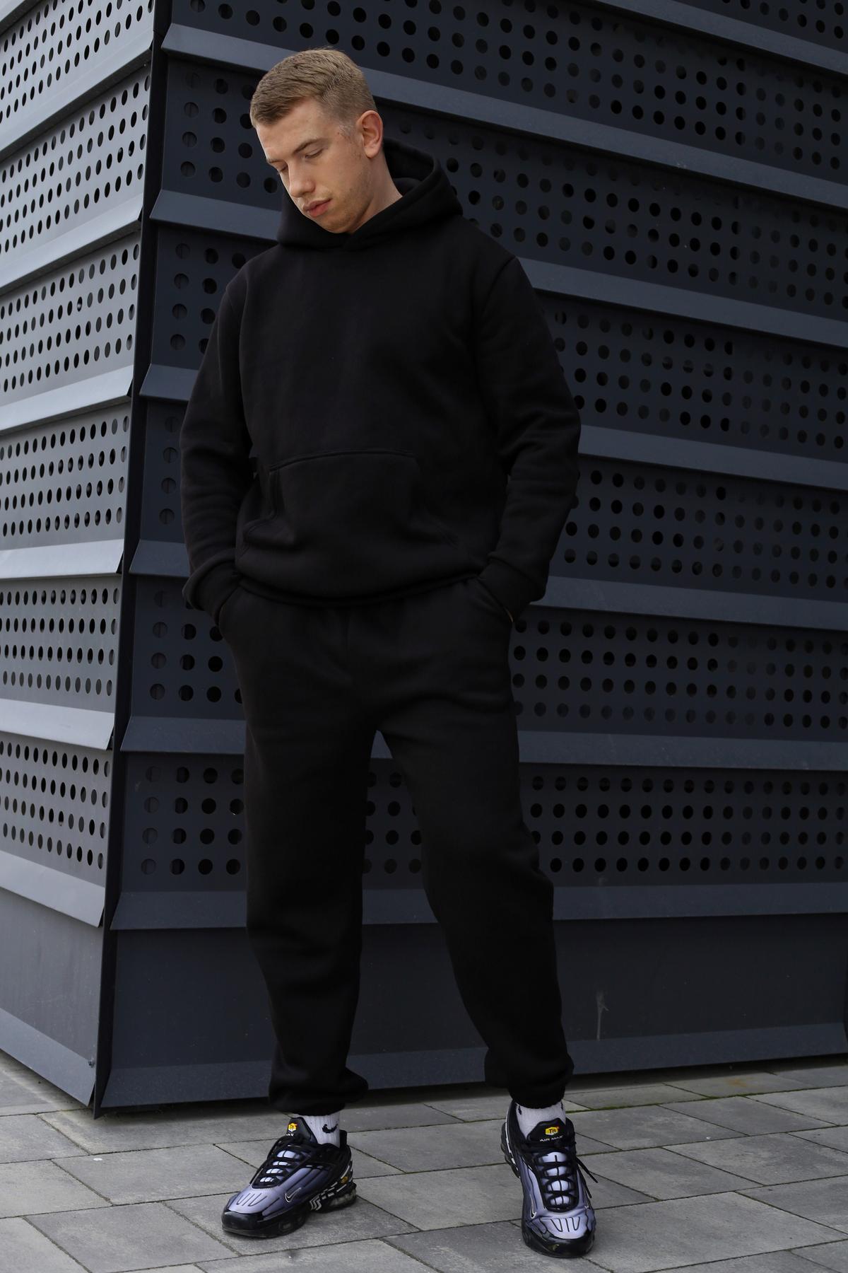 Мужской Теплый Черный Спортивный Костюм Свободного Кроя с Начесом – Худи + Штаны