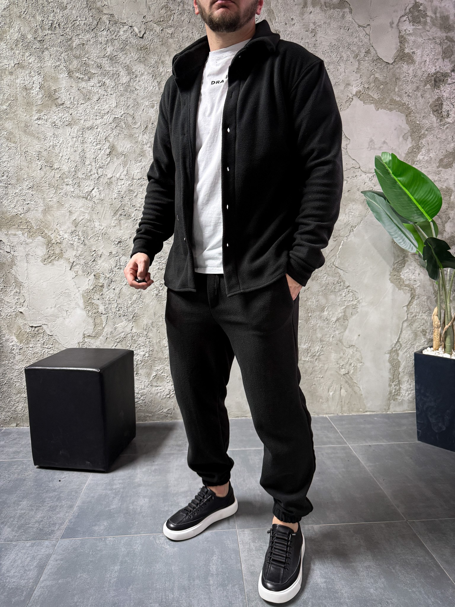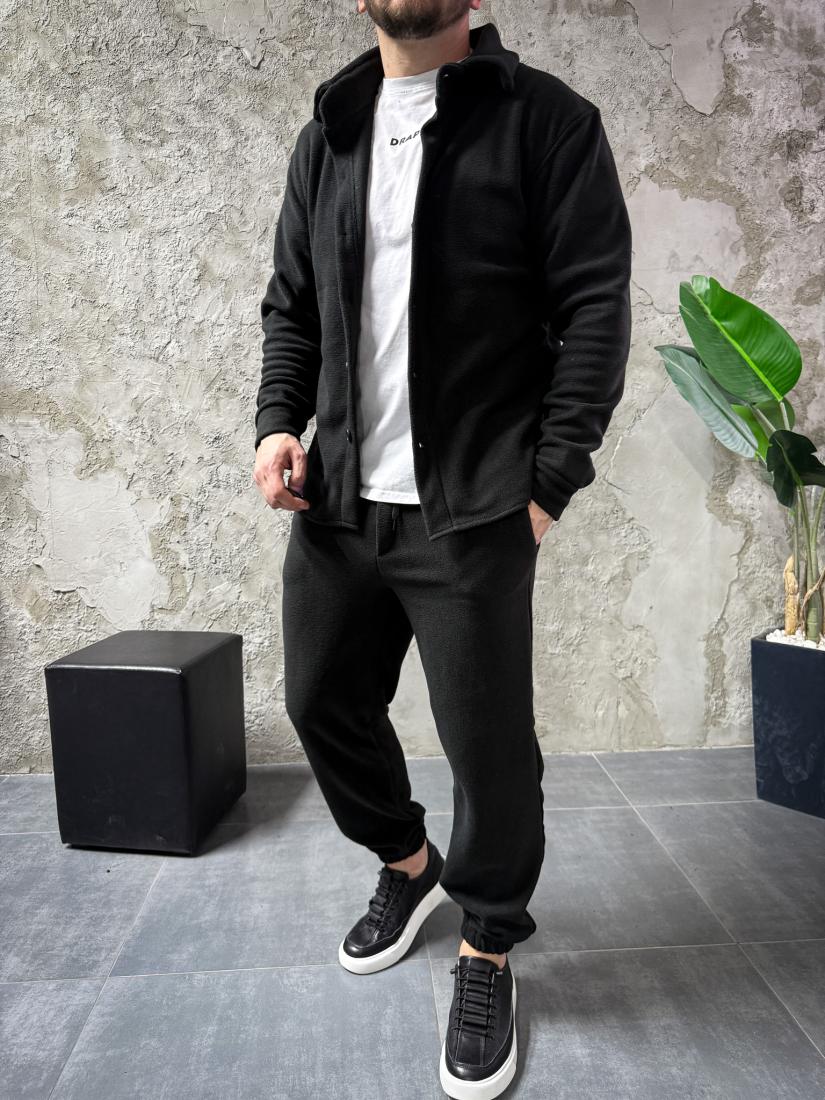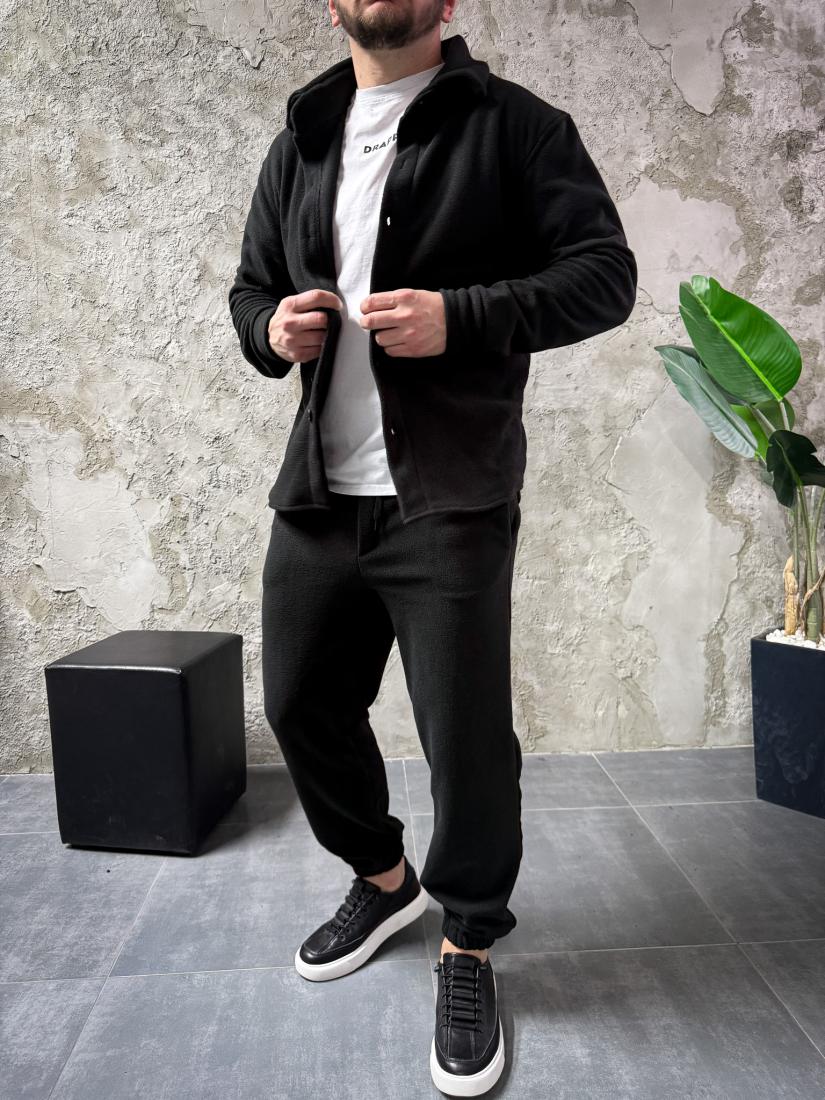 Мужской Теплый Флисовый Черный Костюм Рубашка Штаны Свободного Кроя