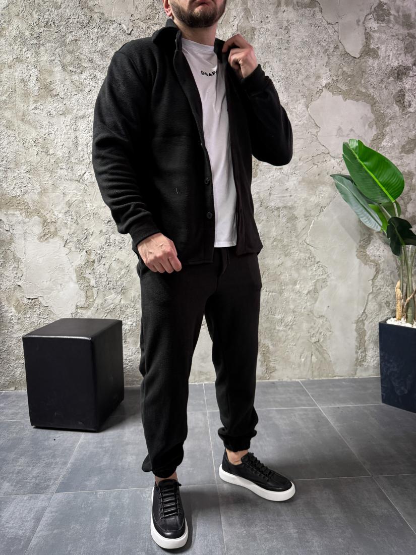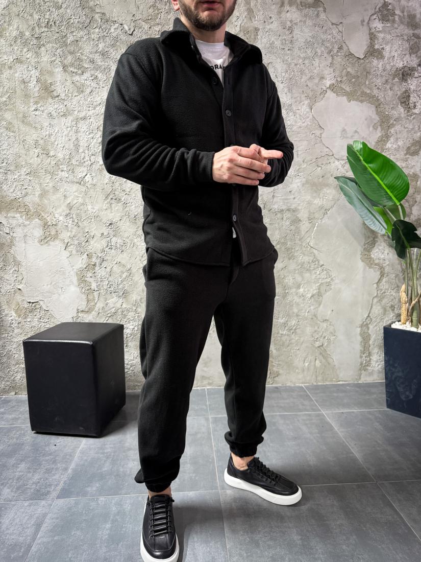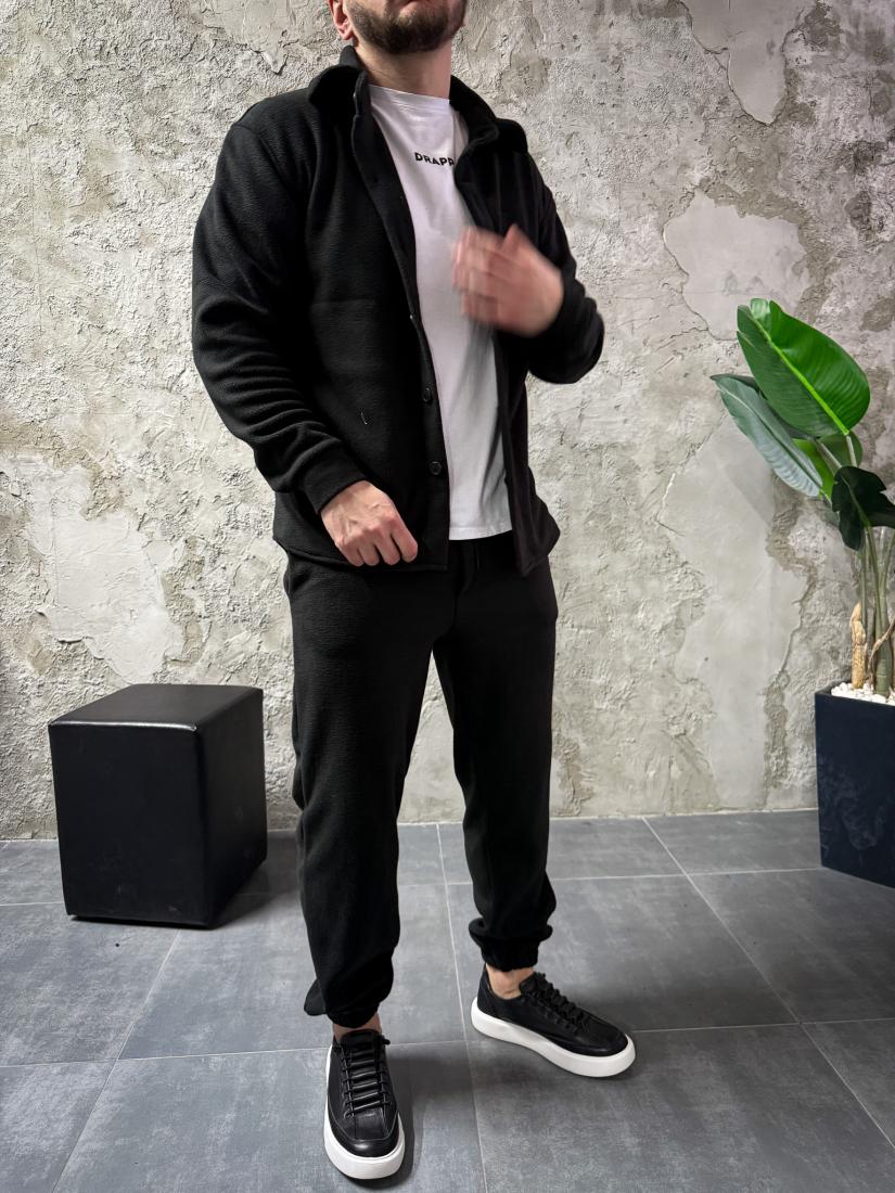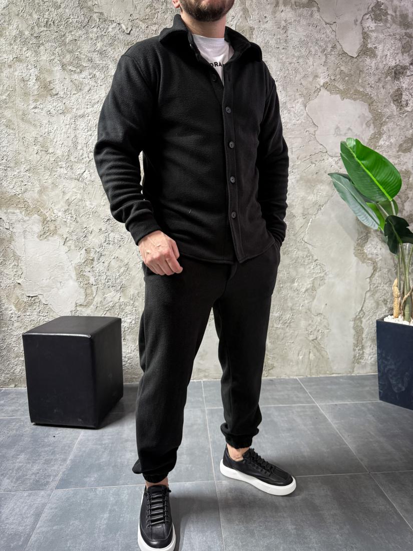 Мужской Теплый Флисовый Черный Костюм Рубашка Штаны Свободного Кроя