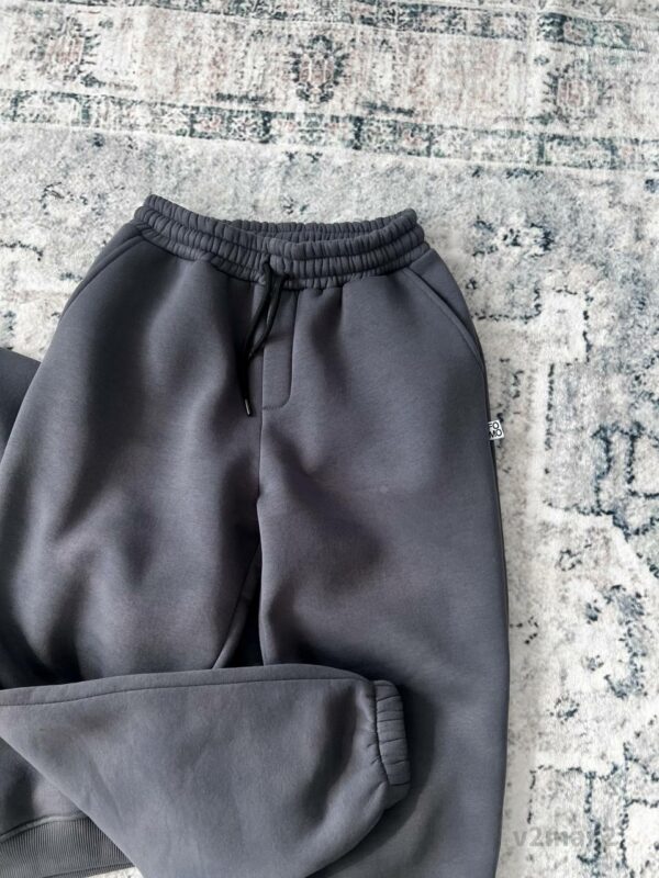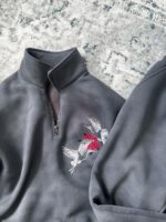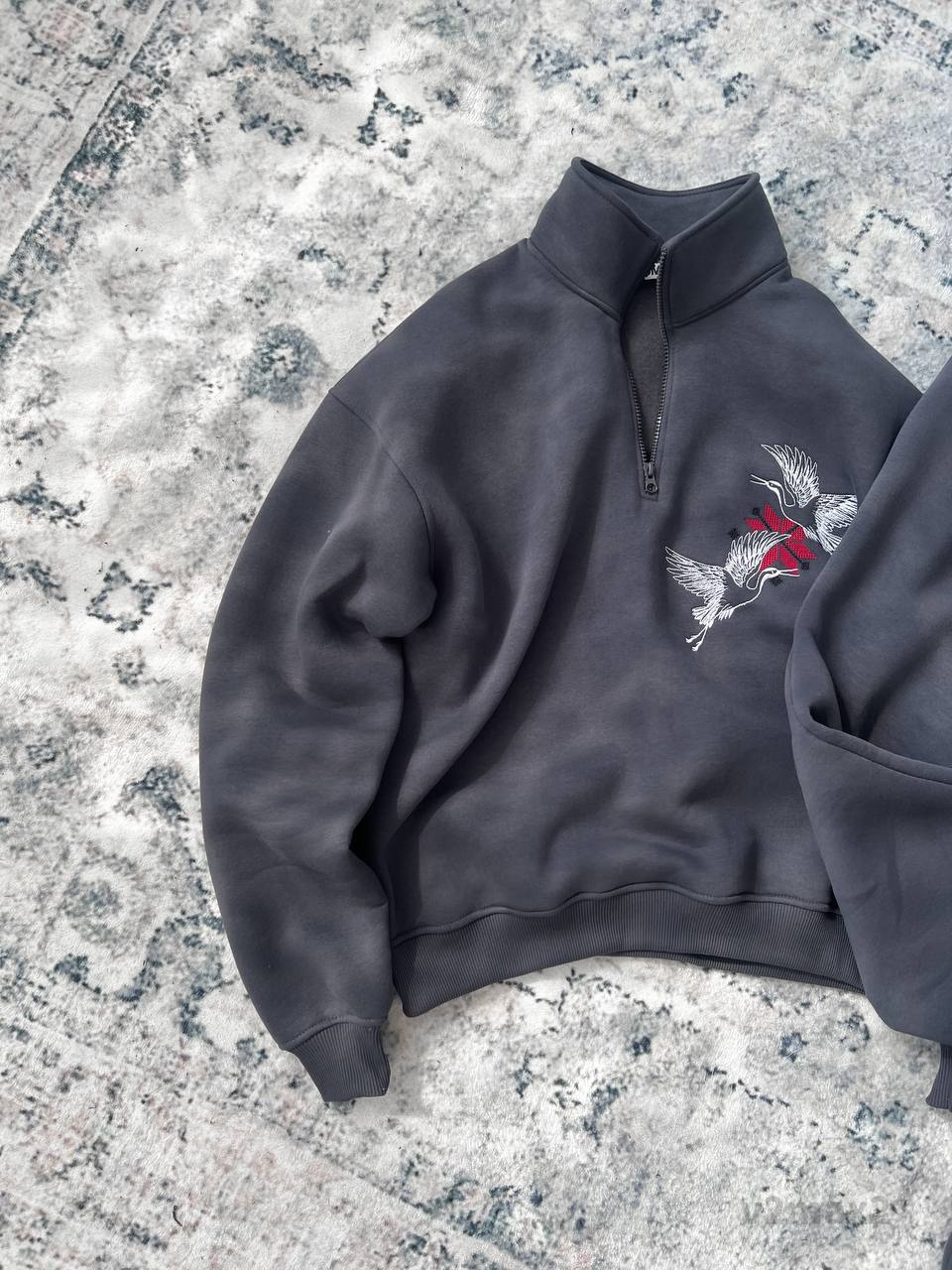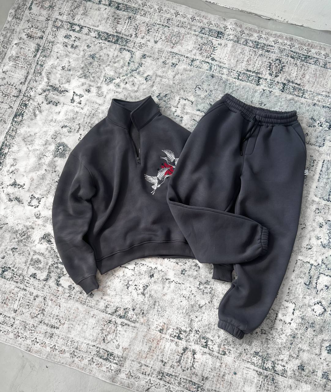 Мужской Теплый Графитовый Костюм на Флисе – Кофта под Горло с Вышитыми Журавлями + Штаны Джоггеры