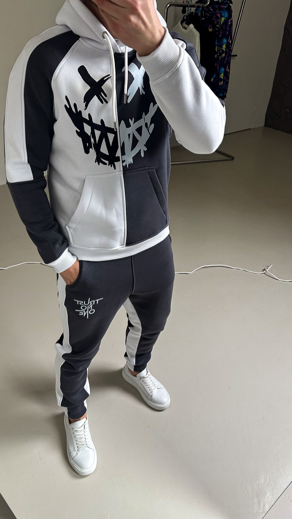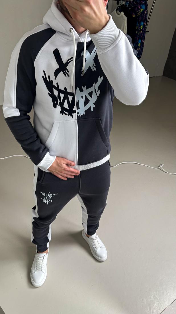 Мужской Утепленный Графитово-Белый Костюм с Принтом- Худи Джоггеры на Флисе
