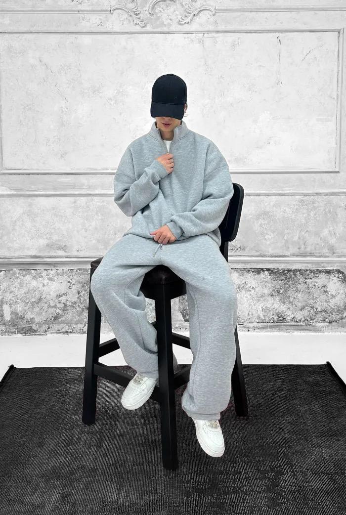 Мужской Утепленный Серый Костюм Оверсайз на Флисе с Зип Воротником – Кофта под Горло + Широкие Штаны
