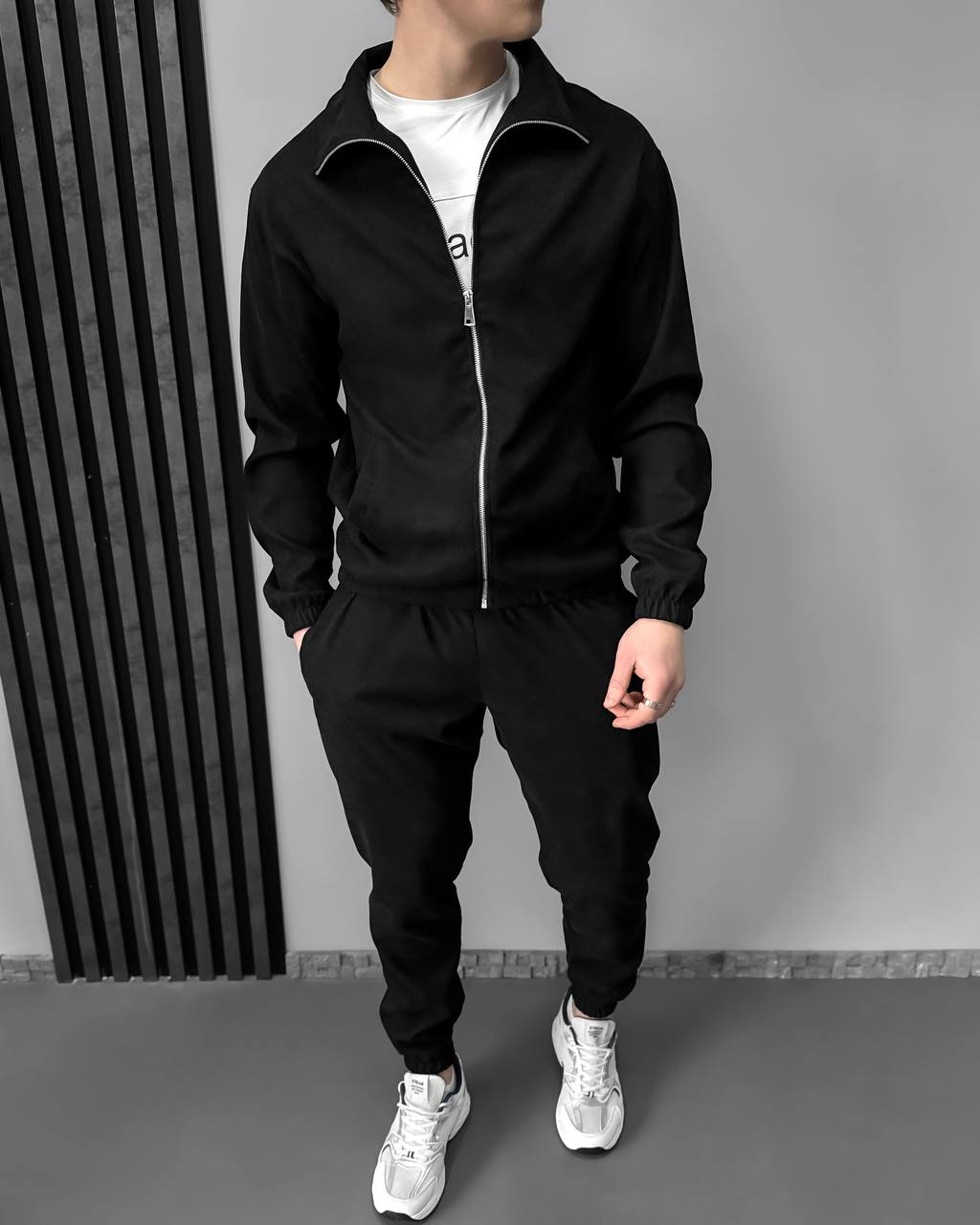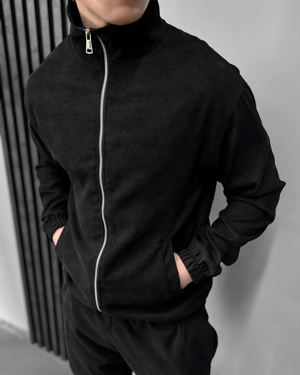 Мужской Вельветовый Черный Костюм на Молнии – Зип Кофта + Штаны с Манжетами