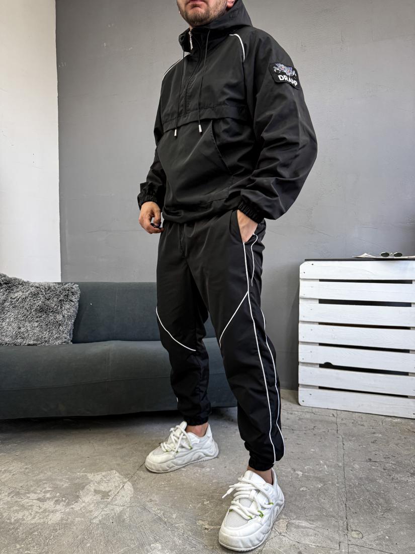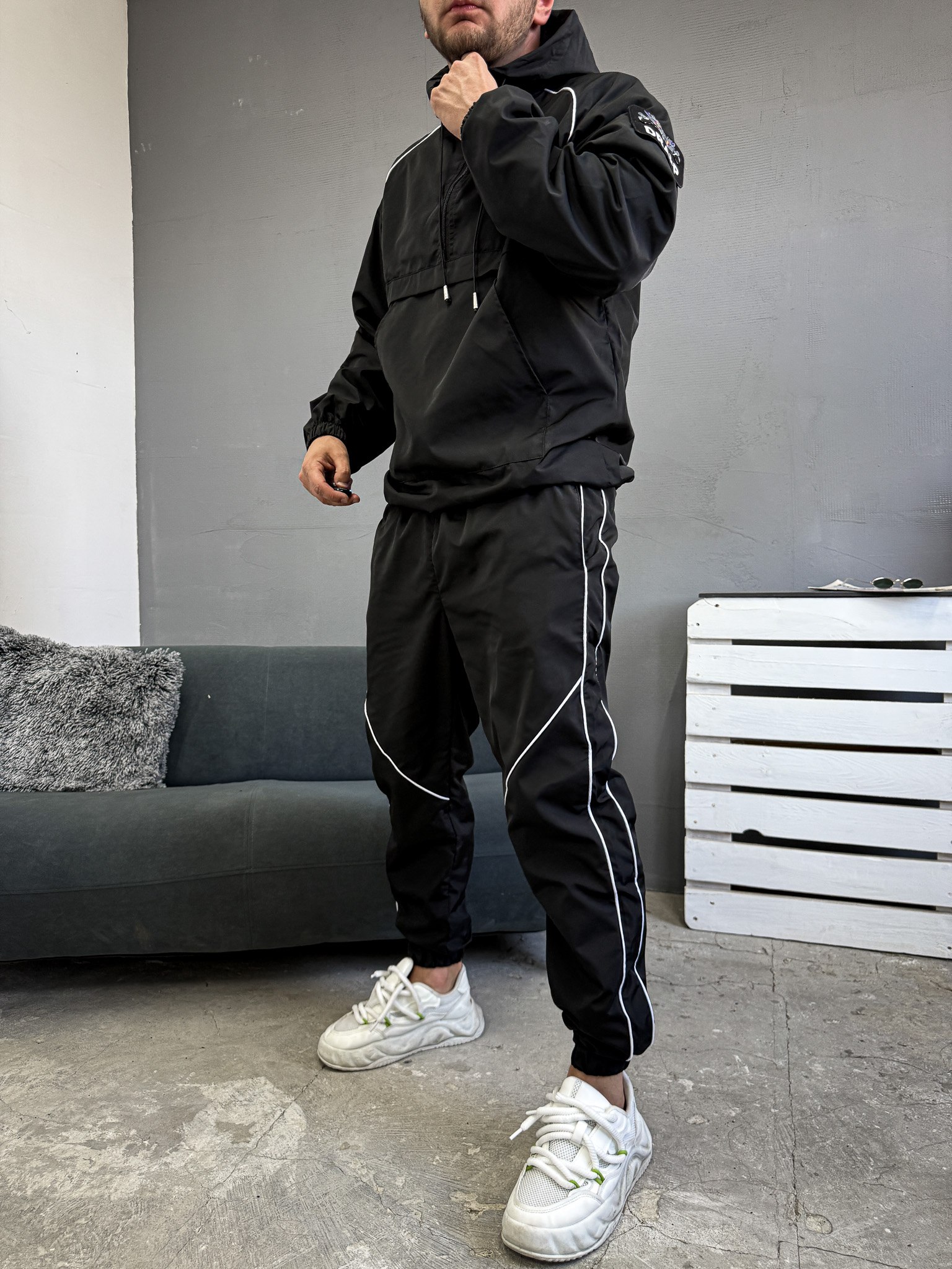 Мужской Ветрозащитный Черный Спортивный Костюм с Кантом и Нашивкой на Рукаве (Анорак + Джоггеры)