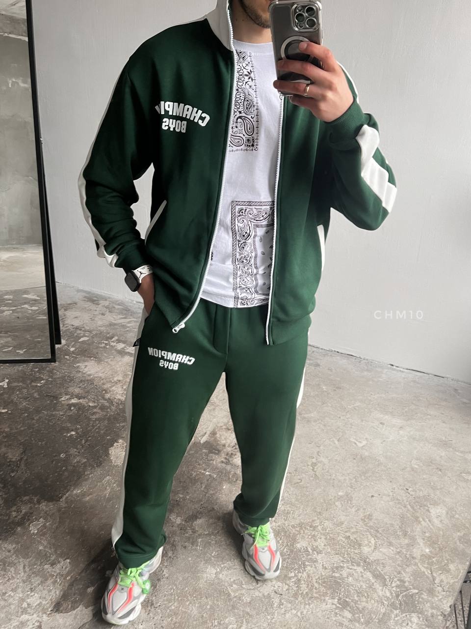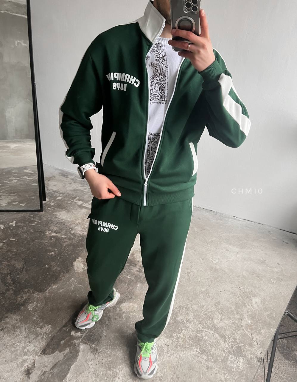 Мужской Зеленый Спортивный Костюм Трехнитка с Лампасами – Кофта на Молнии под Горло + Штаны