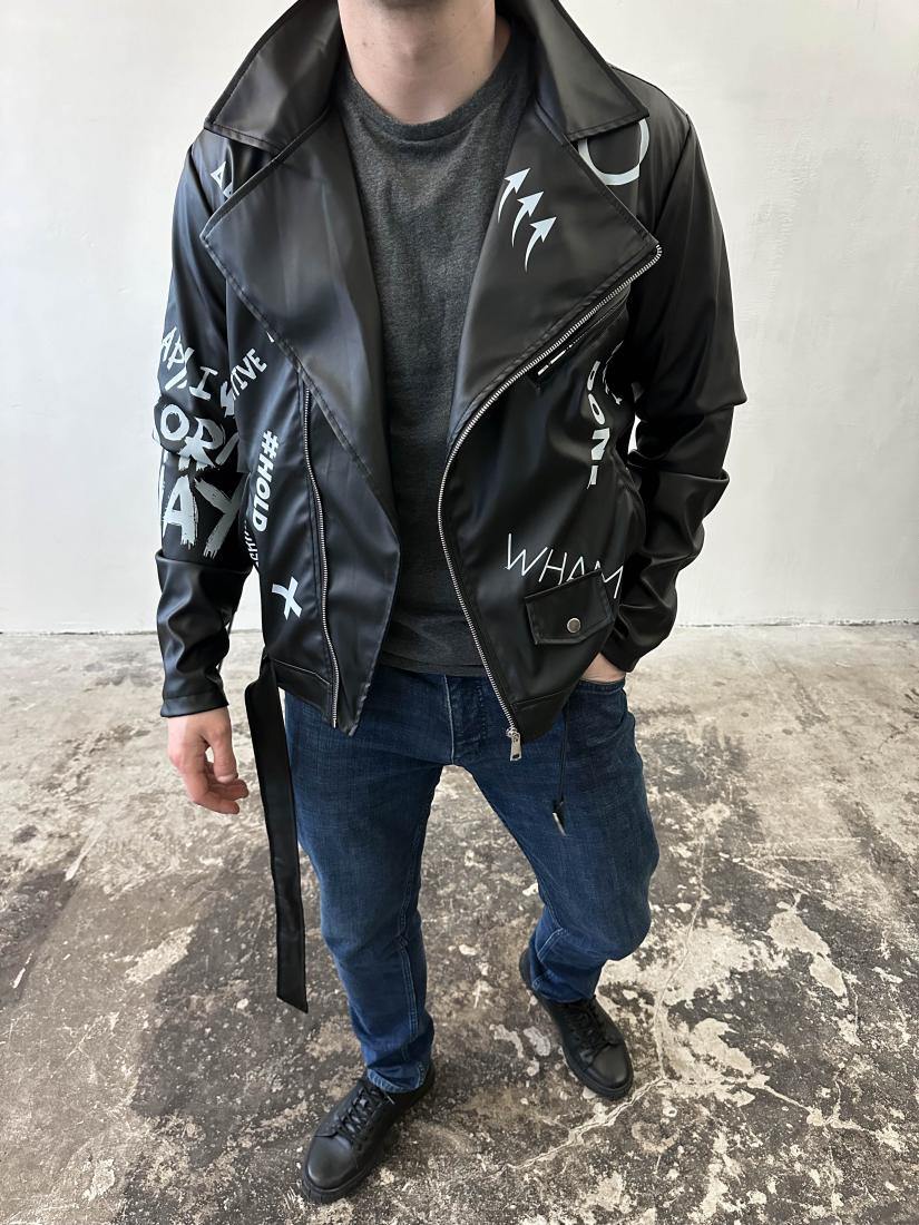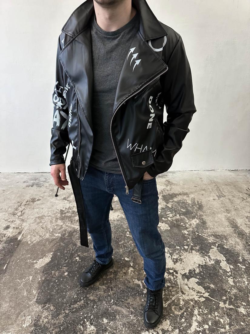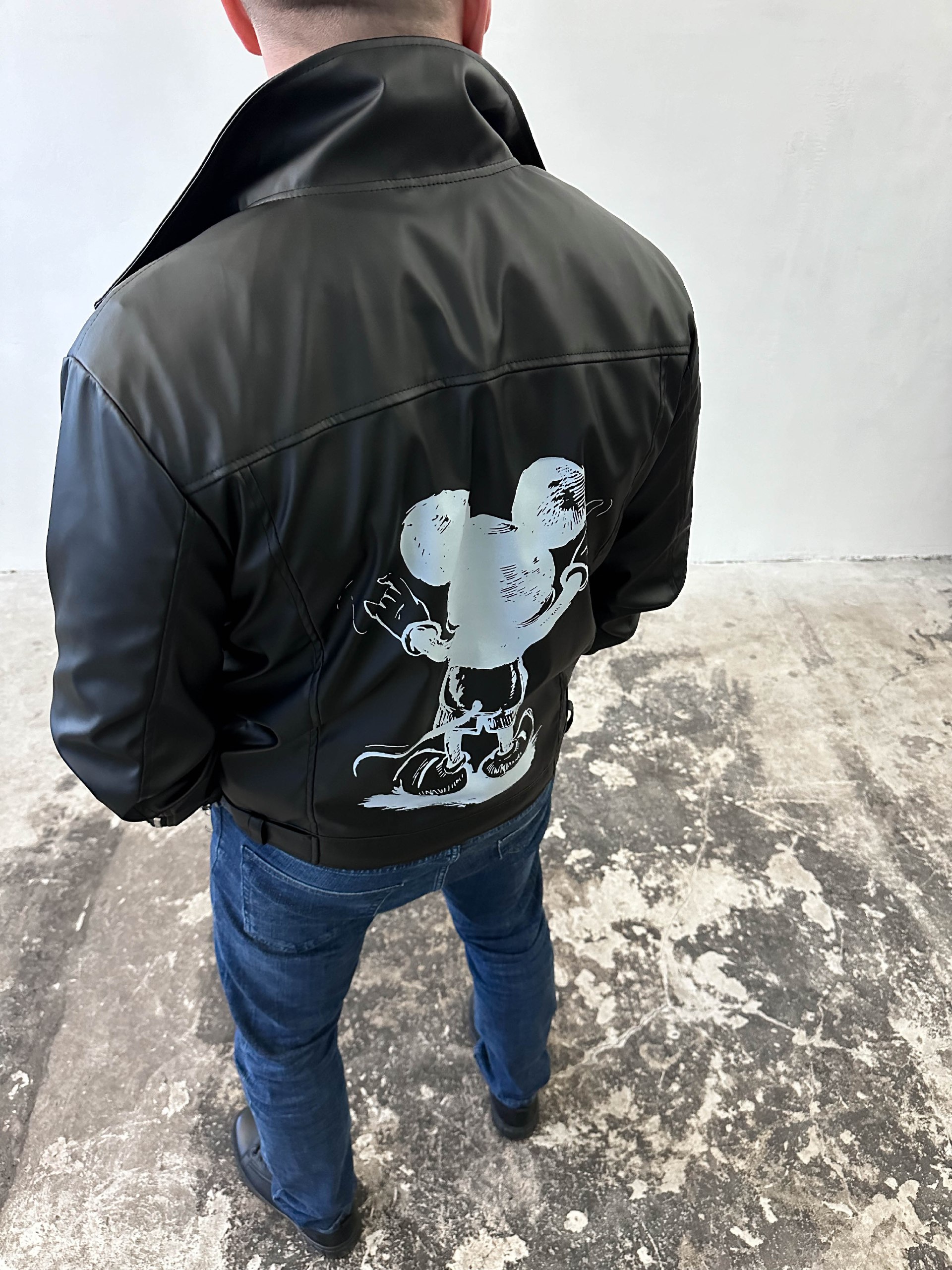 Мужская Черная Кожаная Куртка Косуха с Поясом в Принт с Микки Маусом на Спине