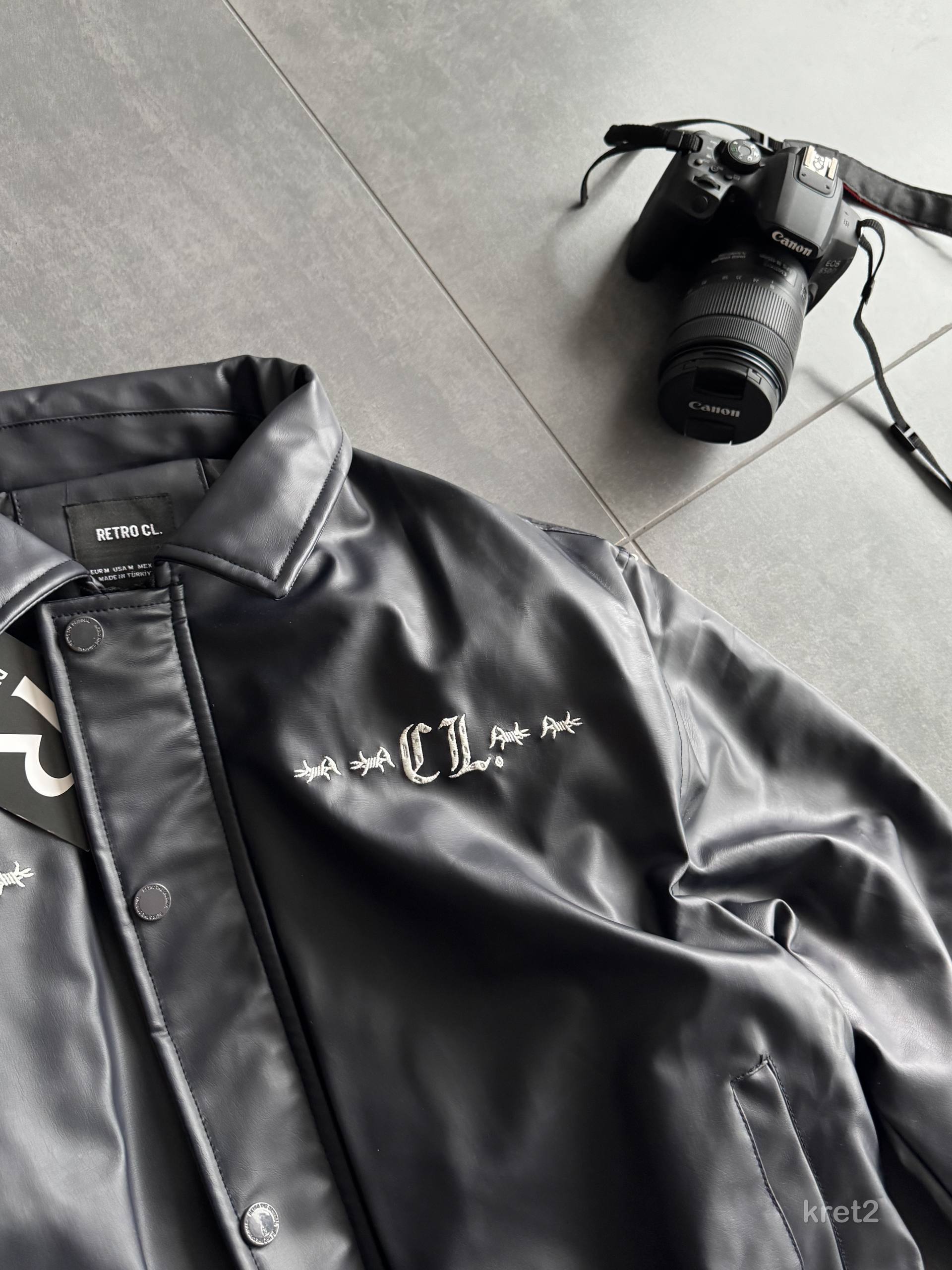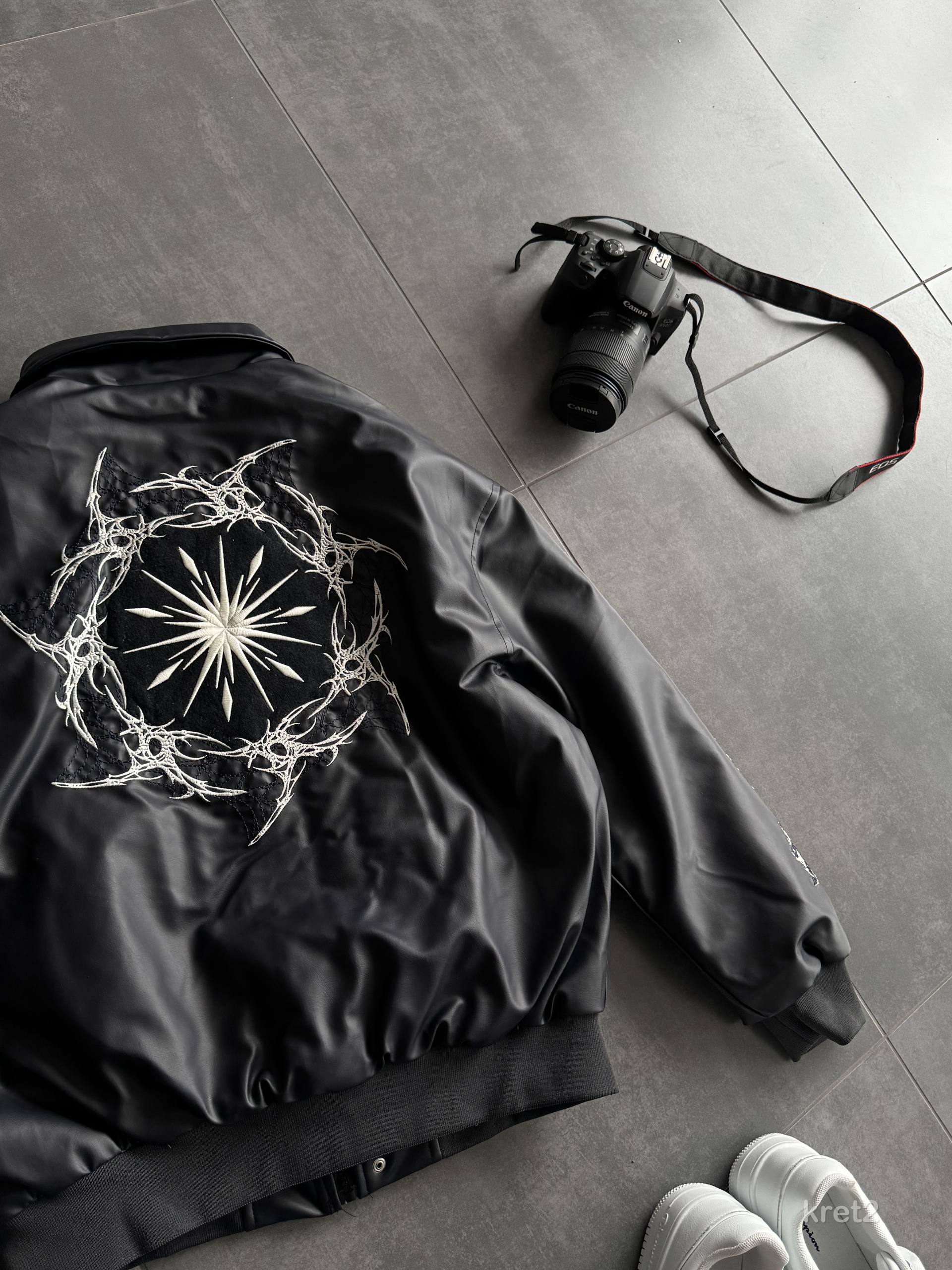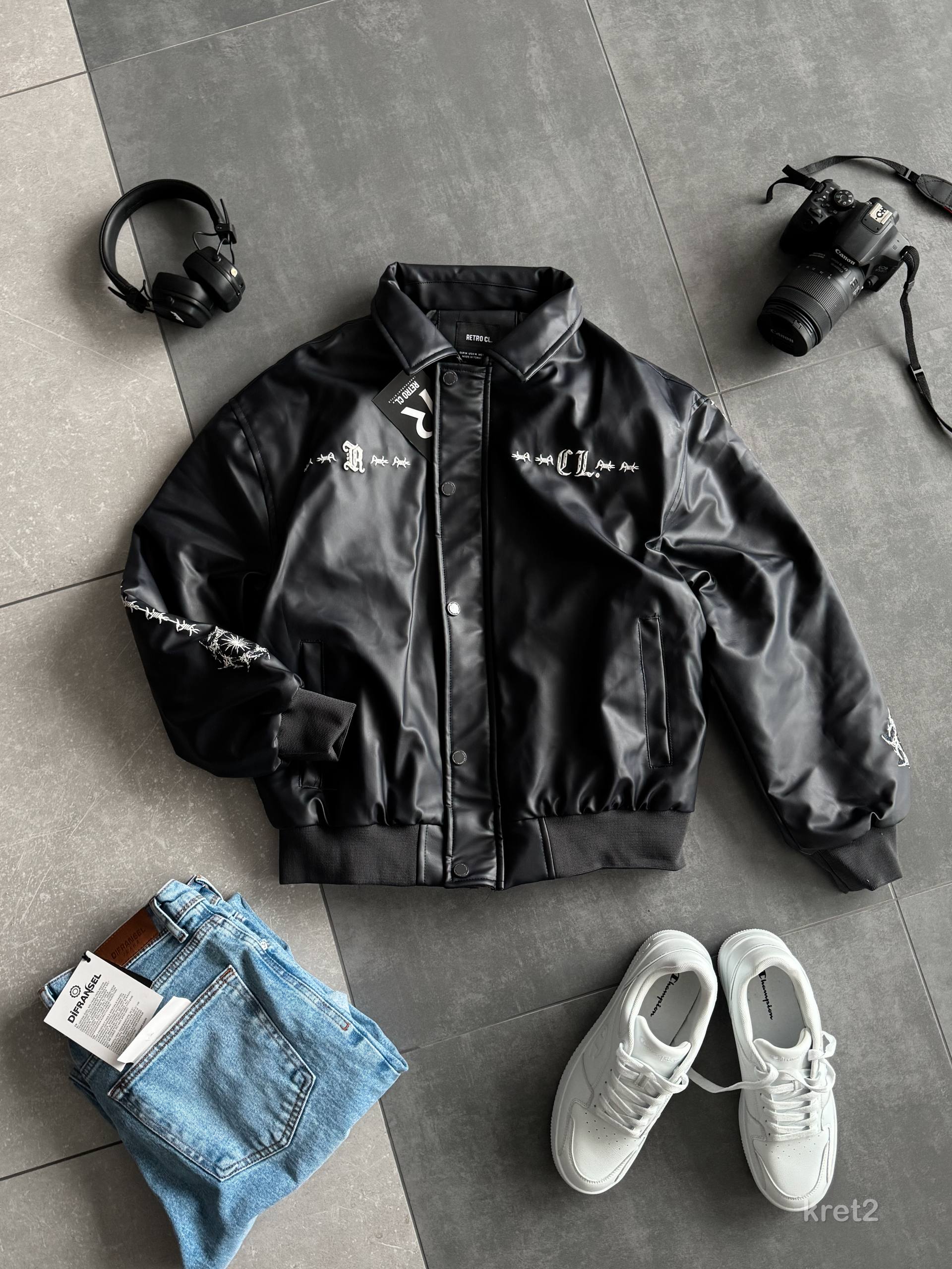 Мужская Демисезонная Графитовая Кожаная Куртка Бомбер с Вышивками