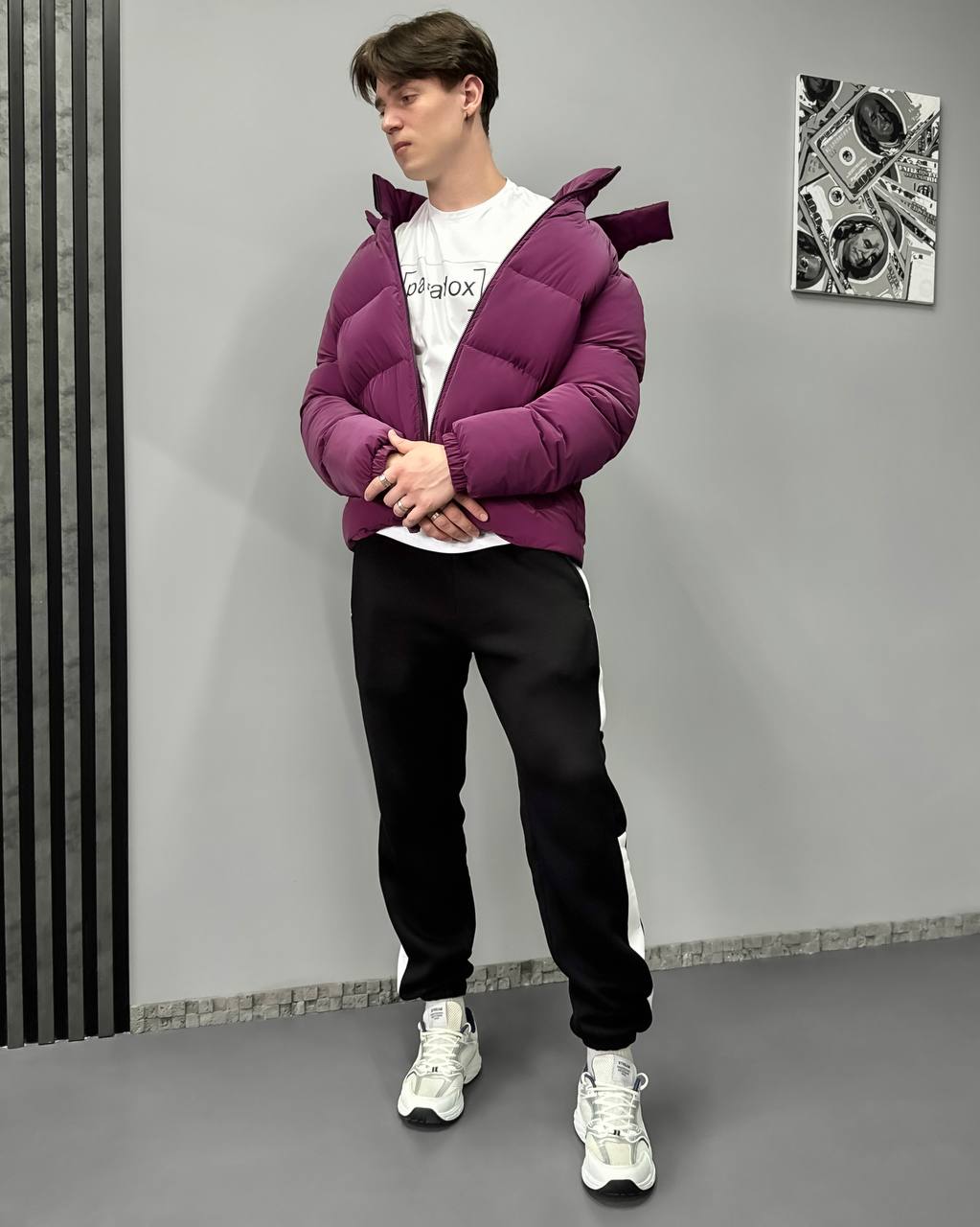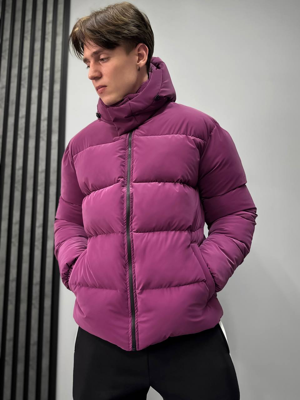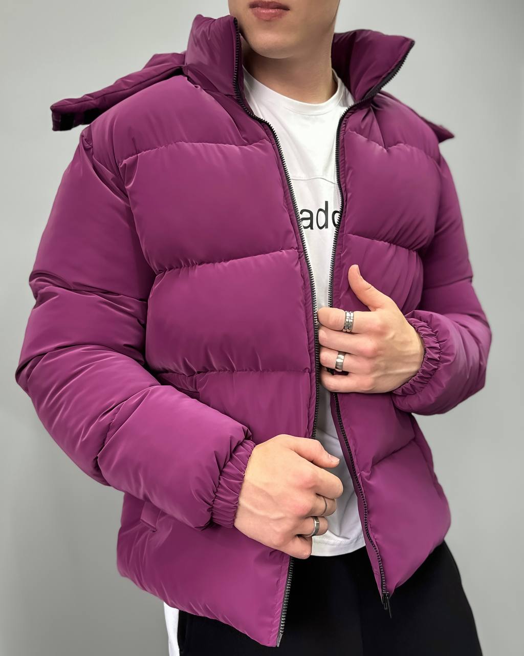 Мужская Демисезонная Бархатная Фиолетовая Стеганая Куртка с Высокой Горловиной и Капюшоном