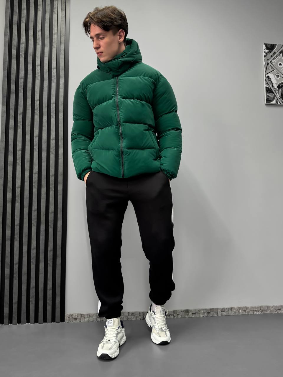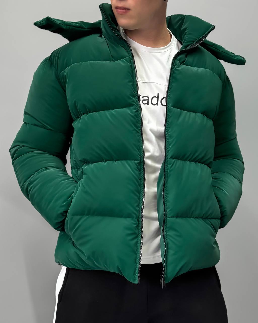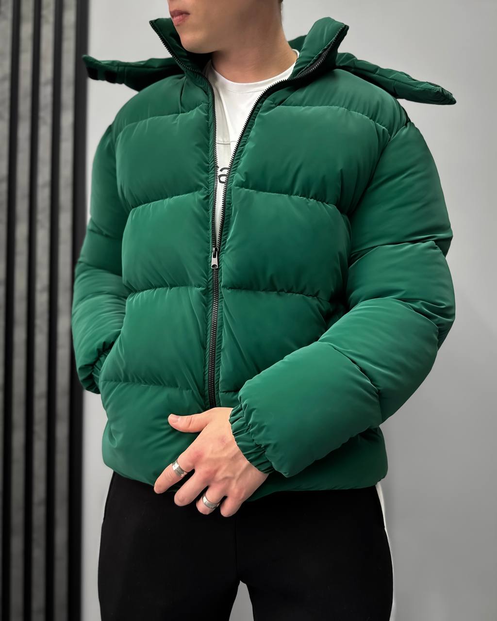 Мужская Демисезонная Бархатная Зеленая Стеганая Куртка с Высокой Горловиной и Капюшоном