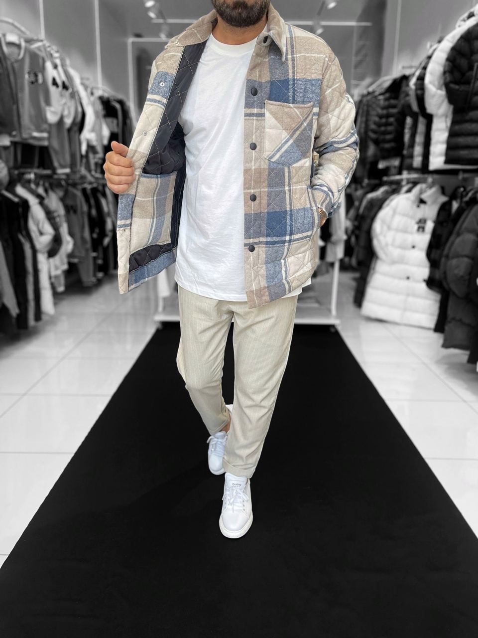 Мужская Демисезонная Клетчатая Бежевая Куртка-Рубашка на Кнопках
