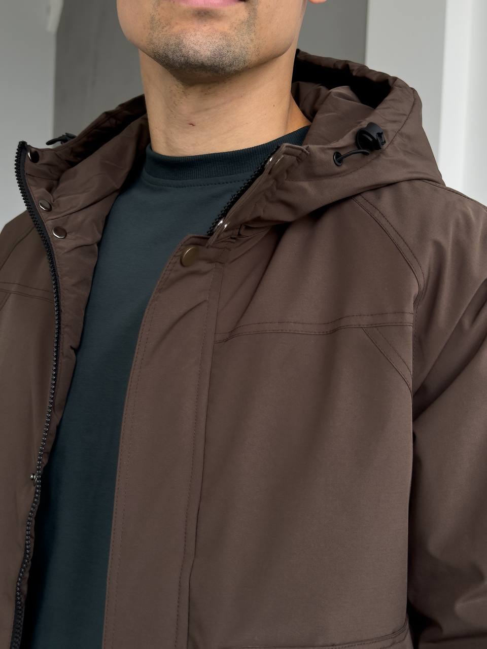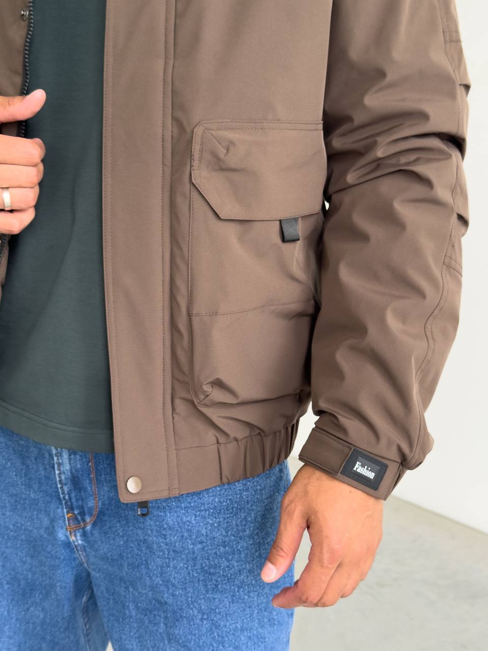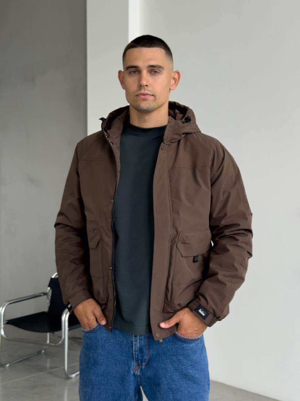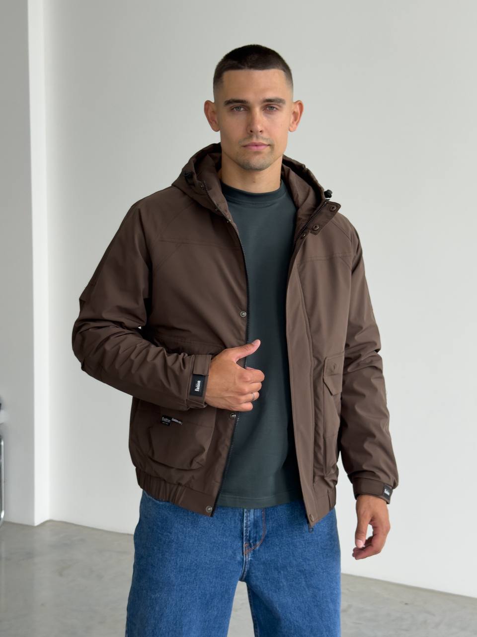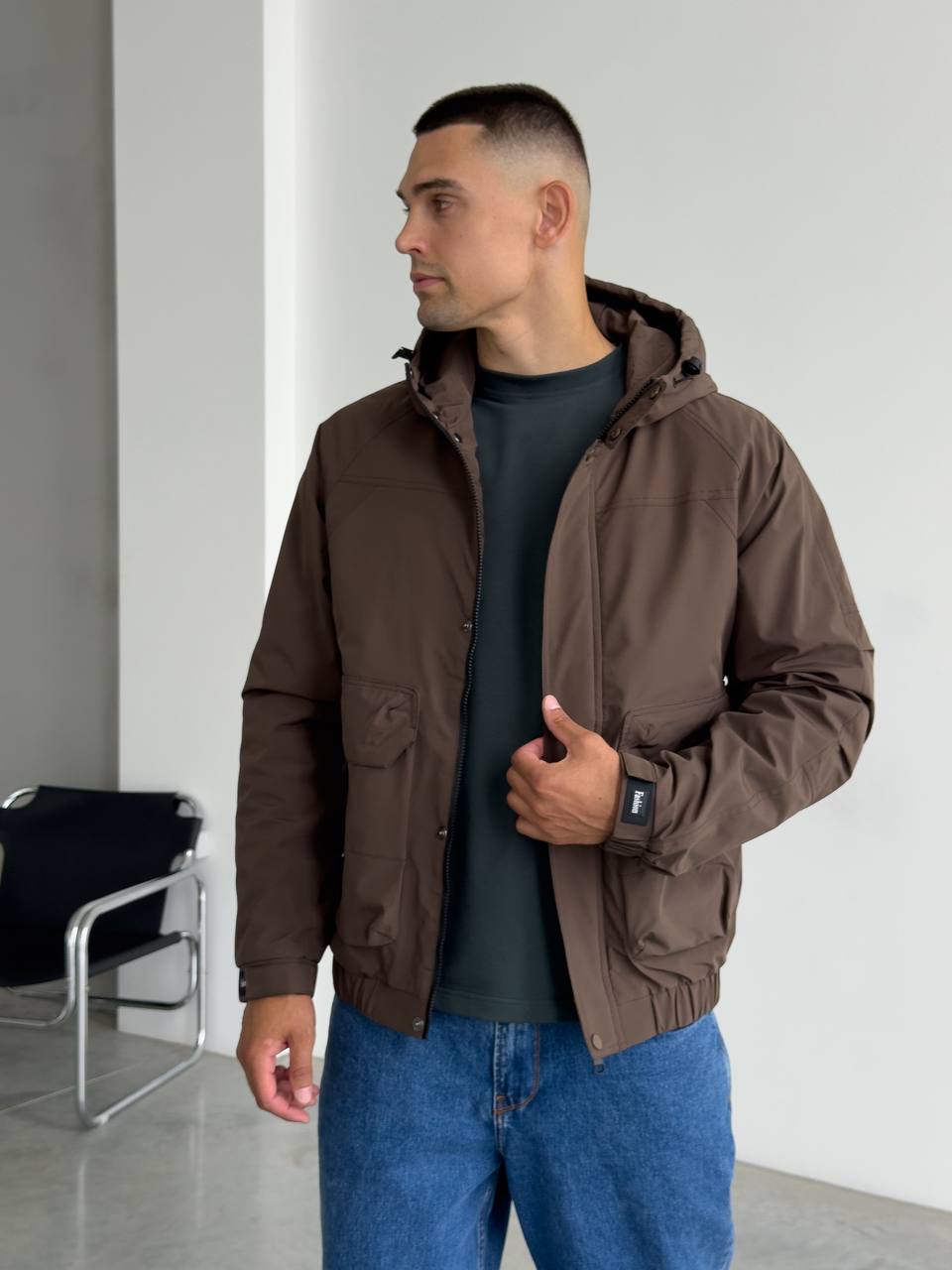 Мужская Демисезонная Коричневая Куртка с Капюшоном Накладными Карманами и Манжетами на Липучках