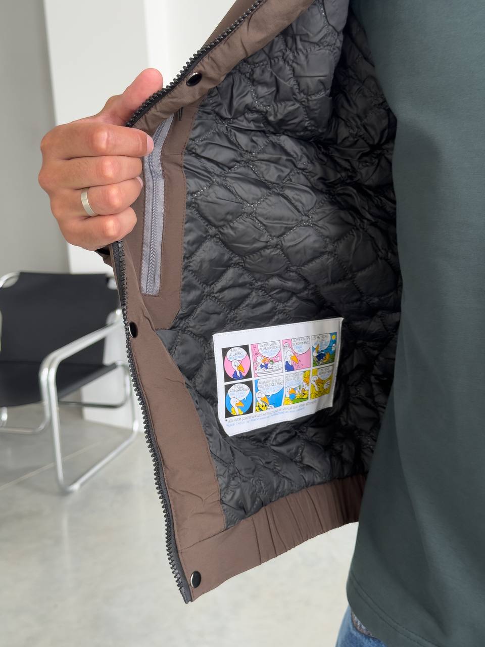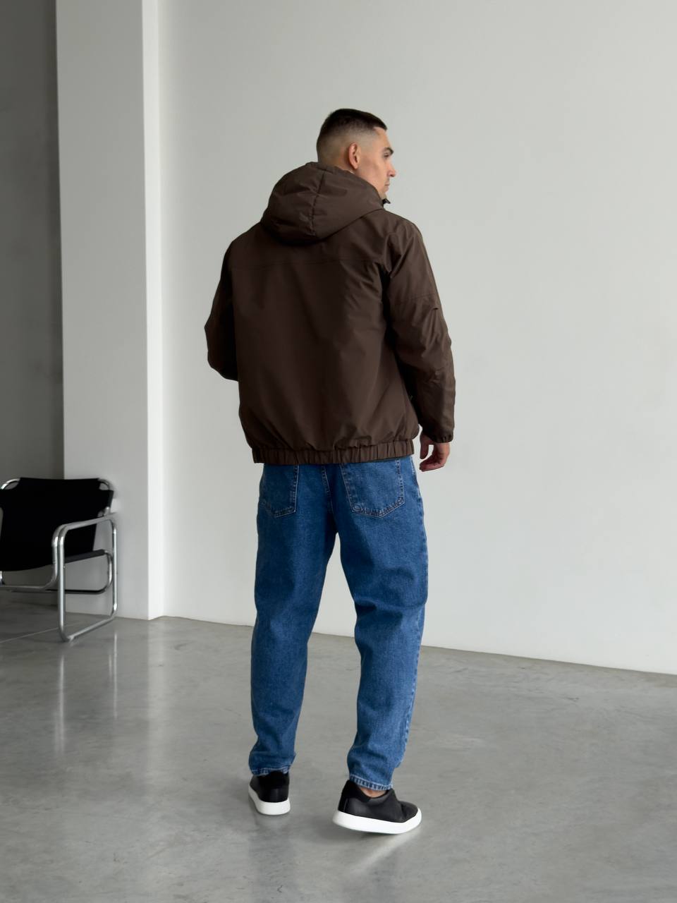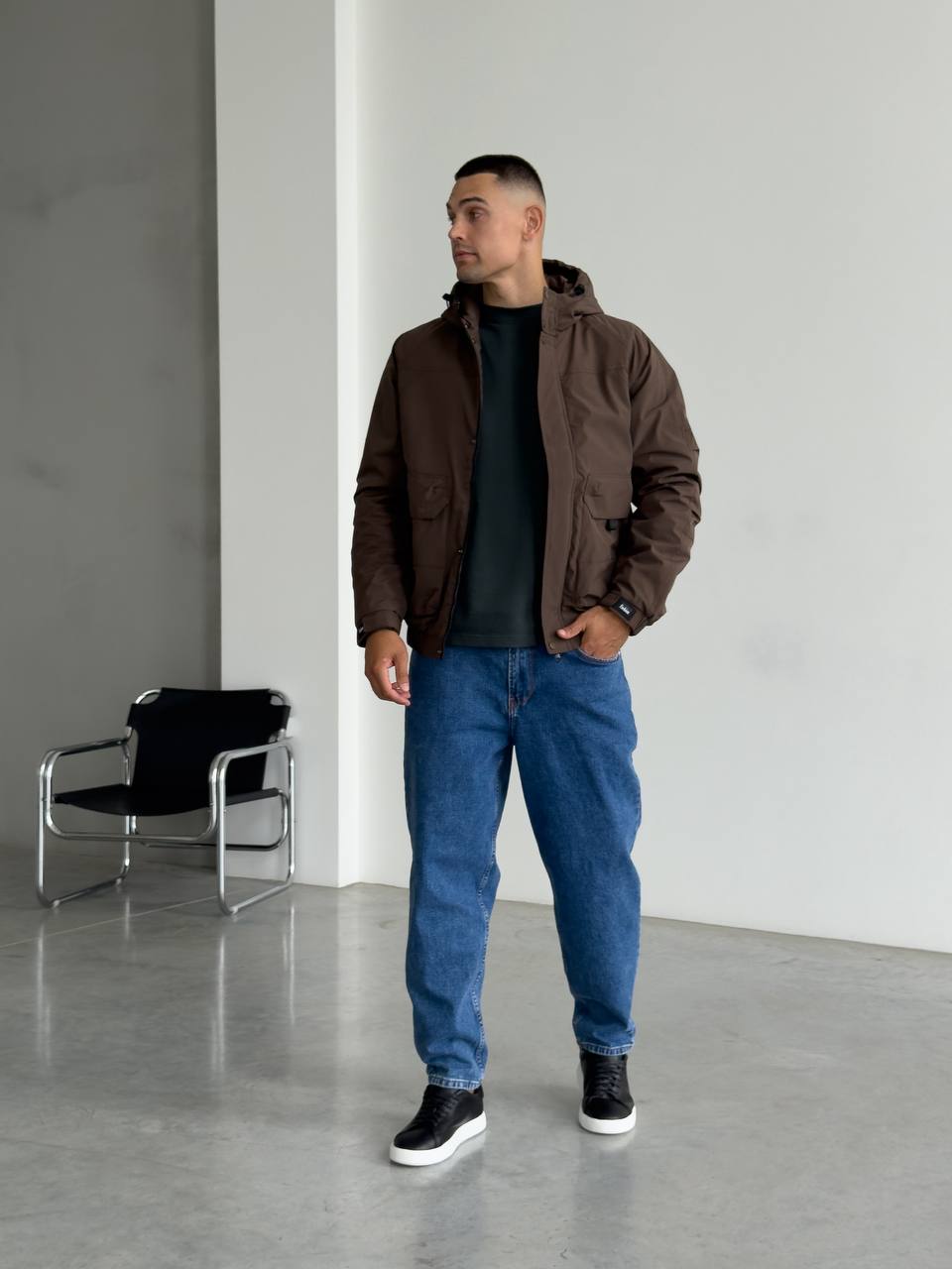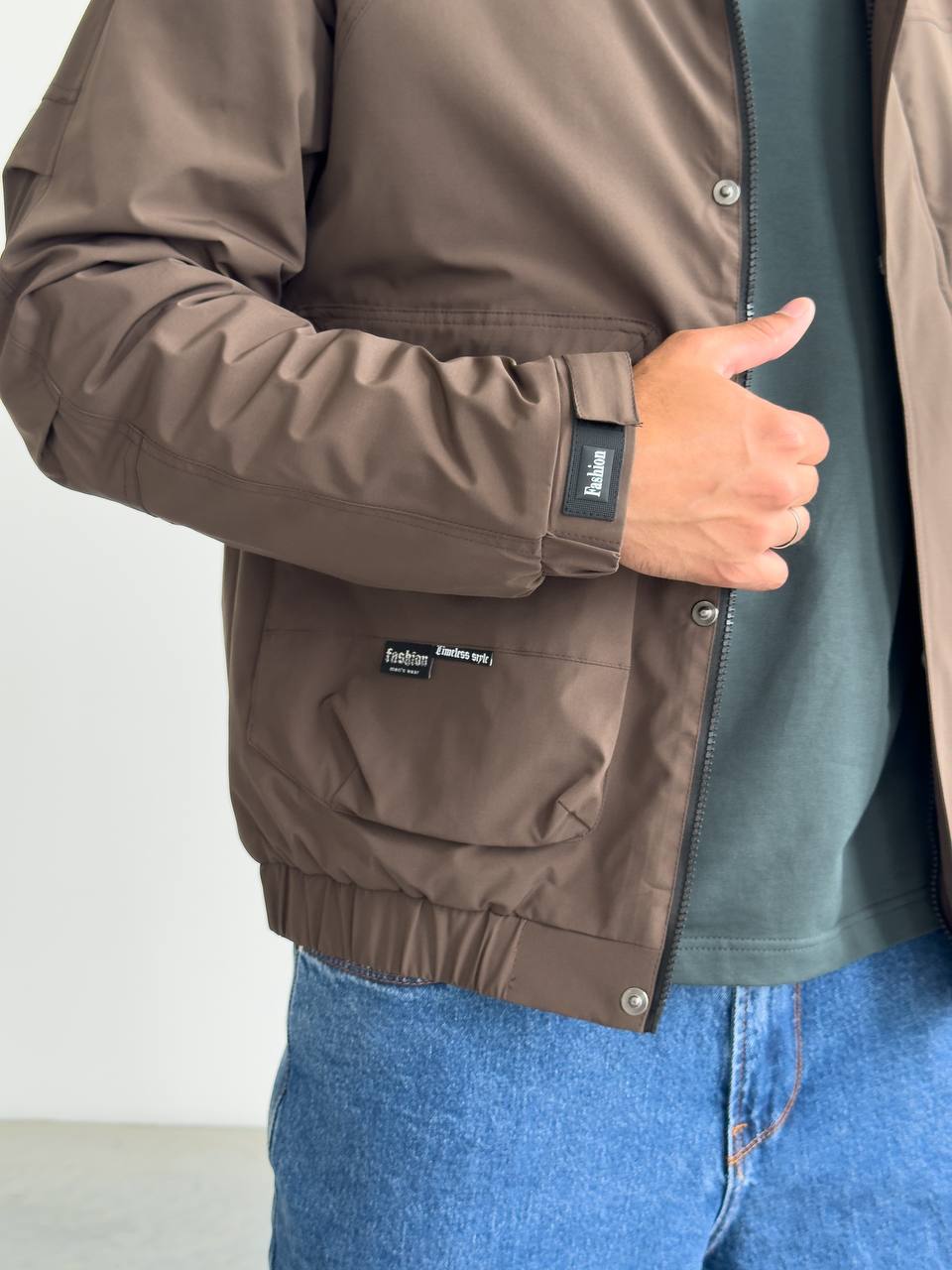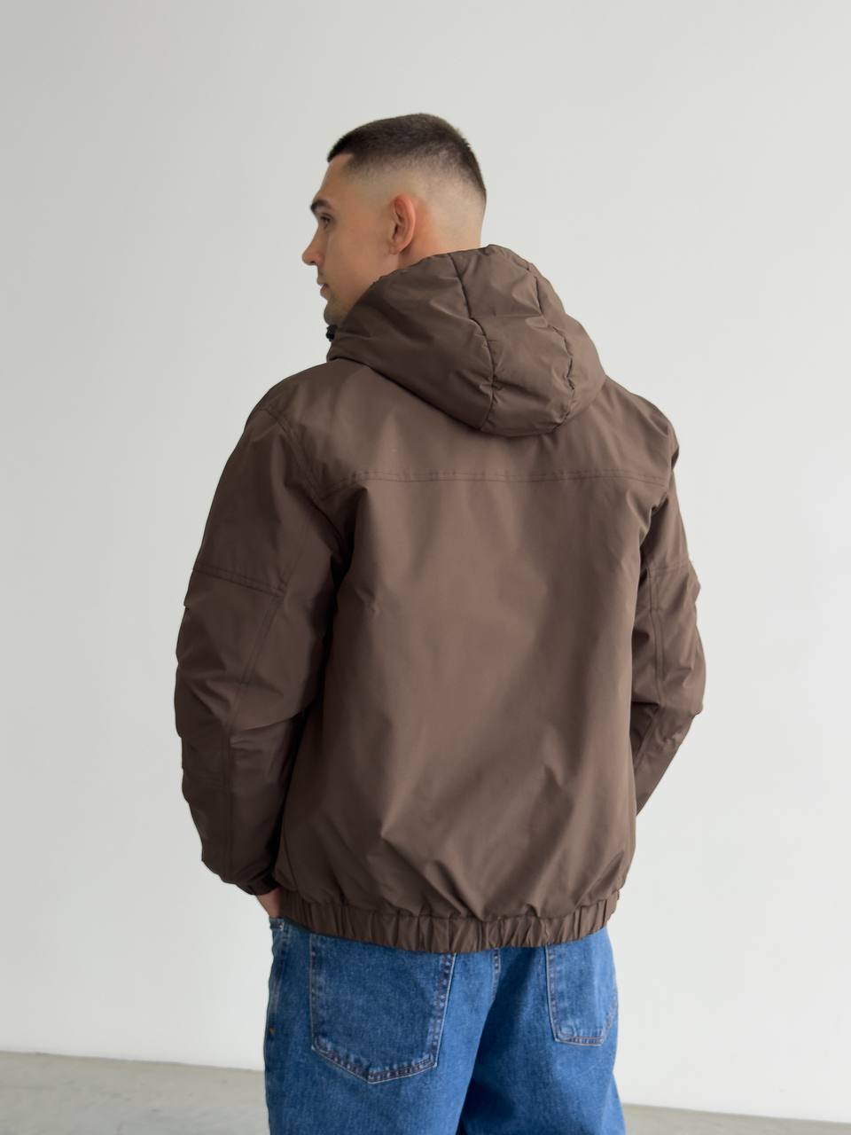 Мужская Демисезонная Коричневая Куртка с Капюшоном Накладными Карманами и Манжетами на Липучках