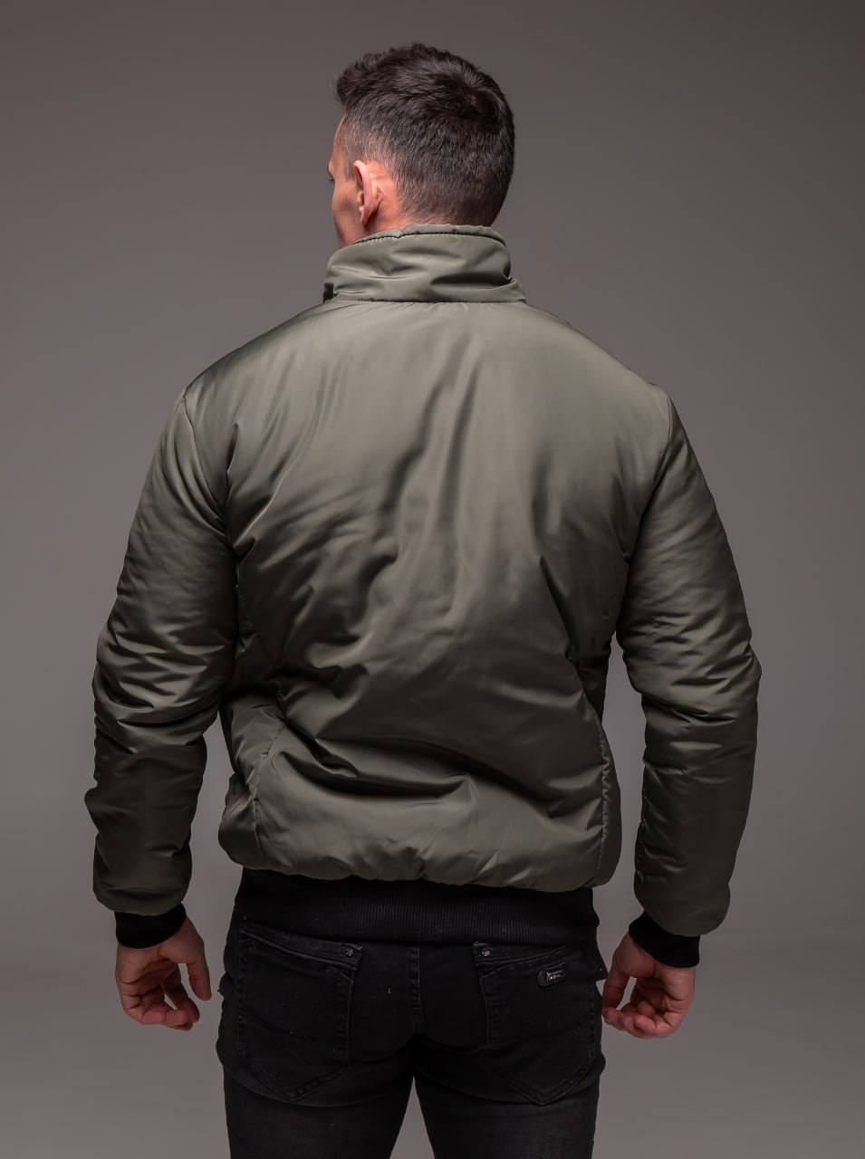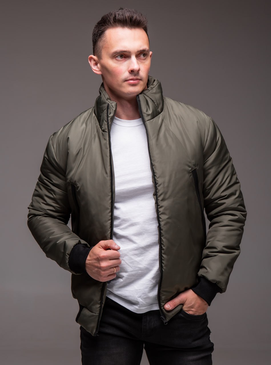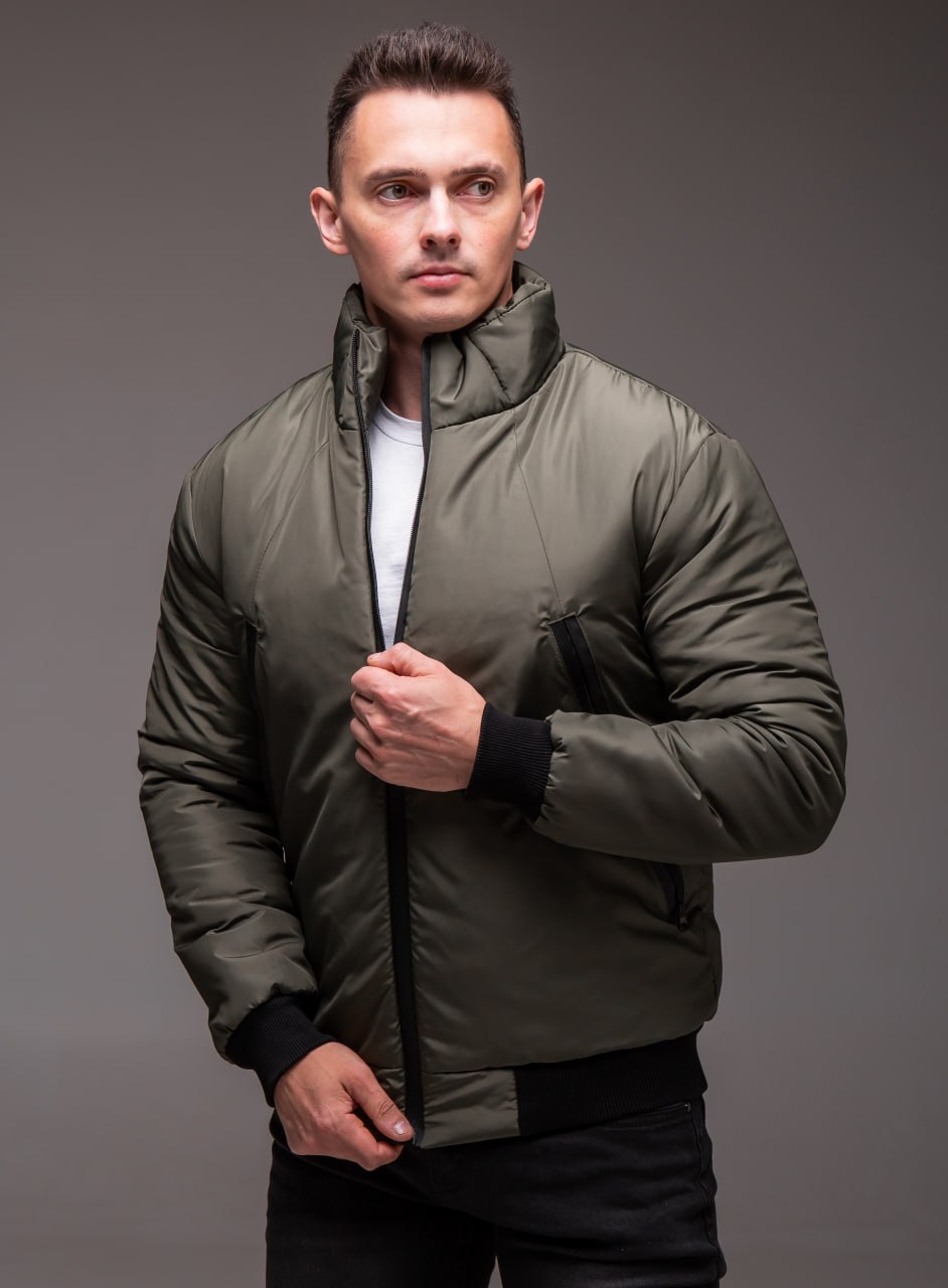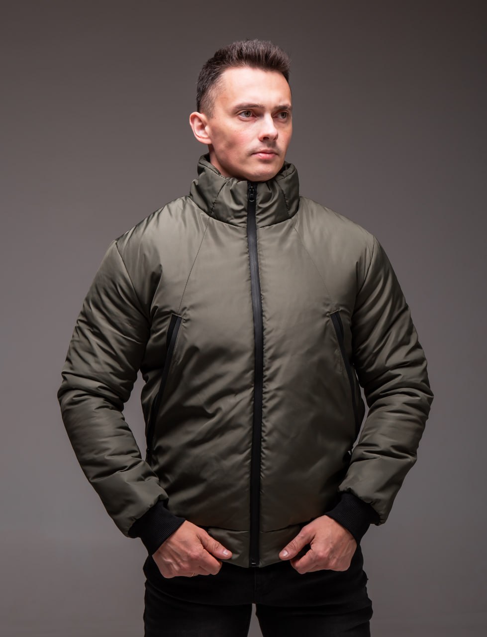 Мужская Демисезонная Куртка Хаки под Горло с Прорезиненными Змейками