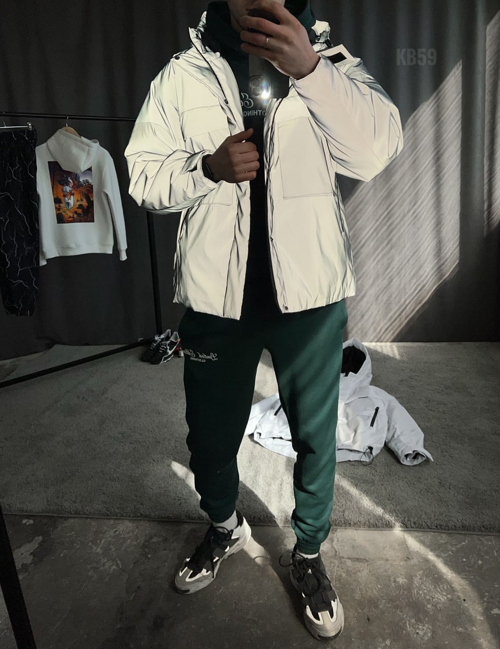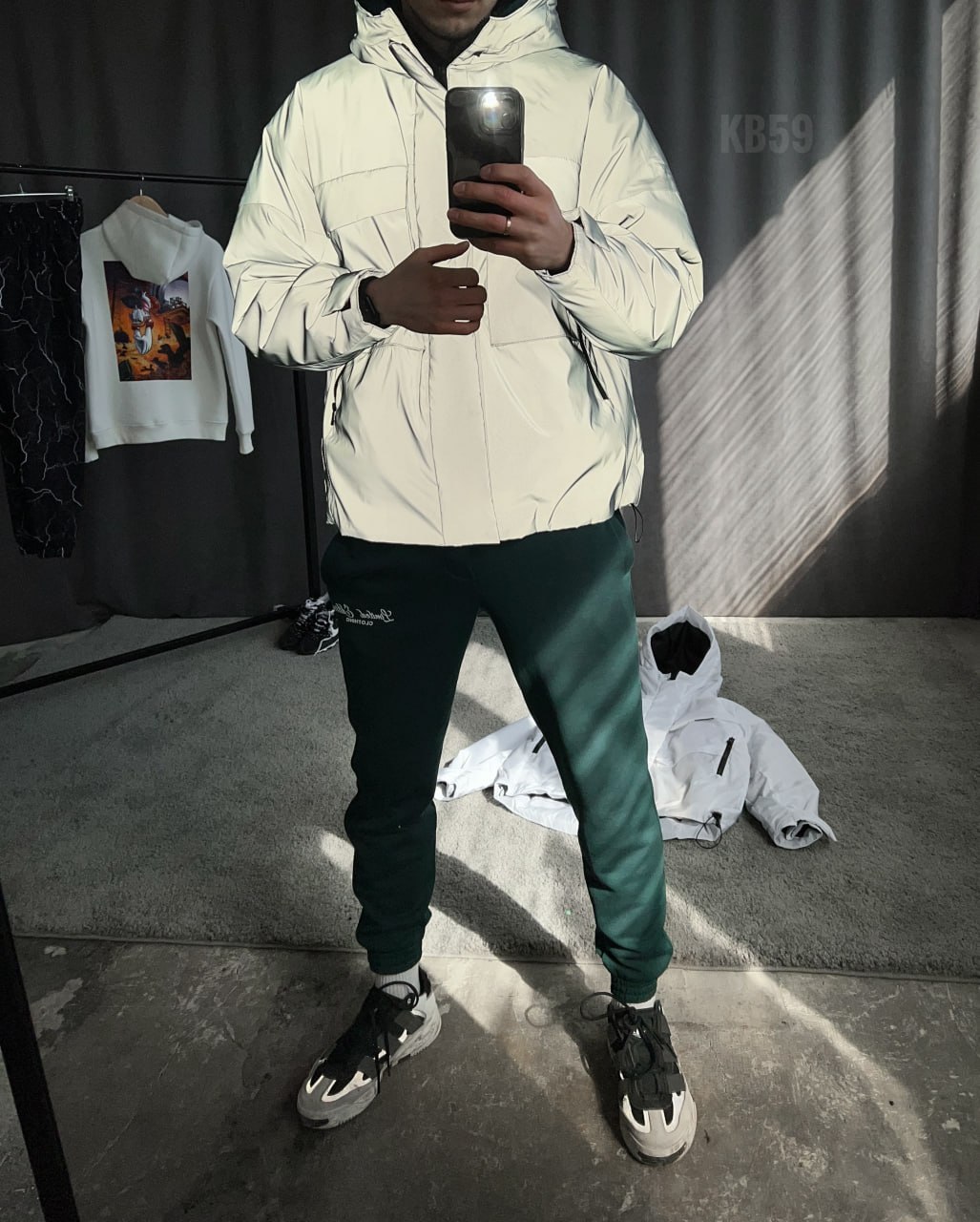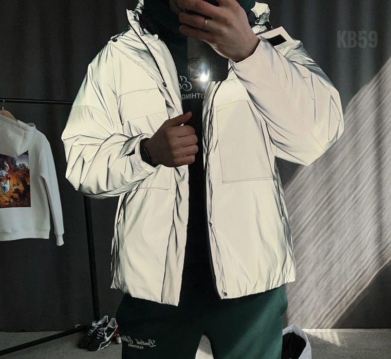 Мужская Демисезонная Куртка Серая Рефлективная Оверсайз – Легкая Водоотталкивающая с Капюшоном и Большими Накладными Карманами на Груди