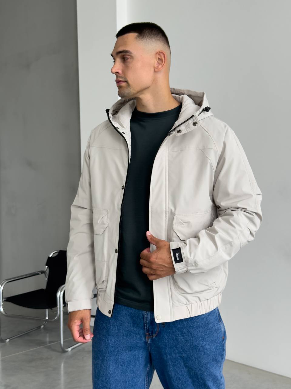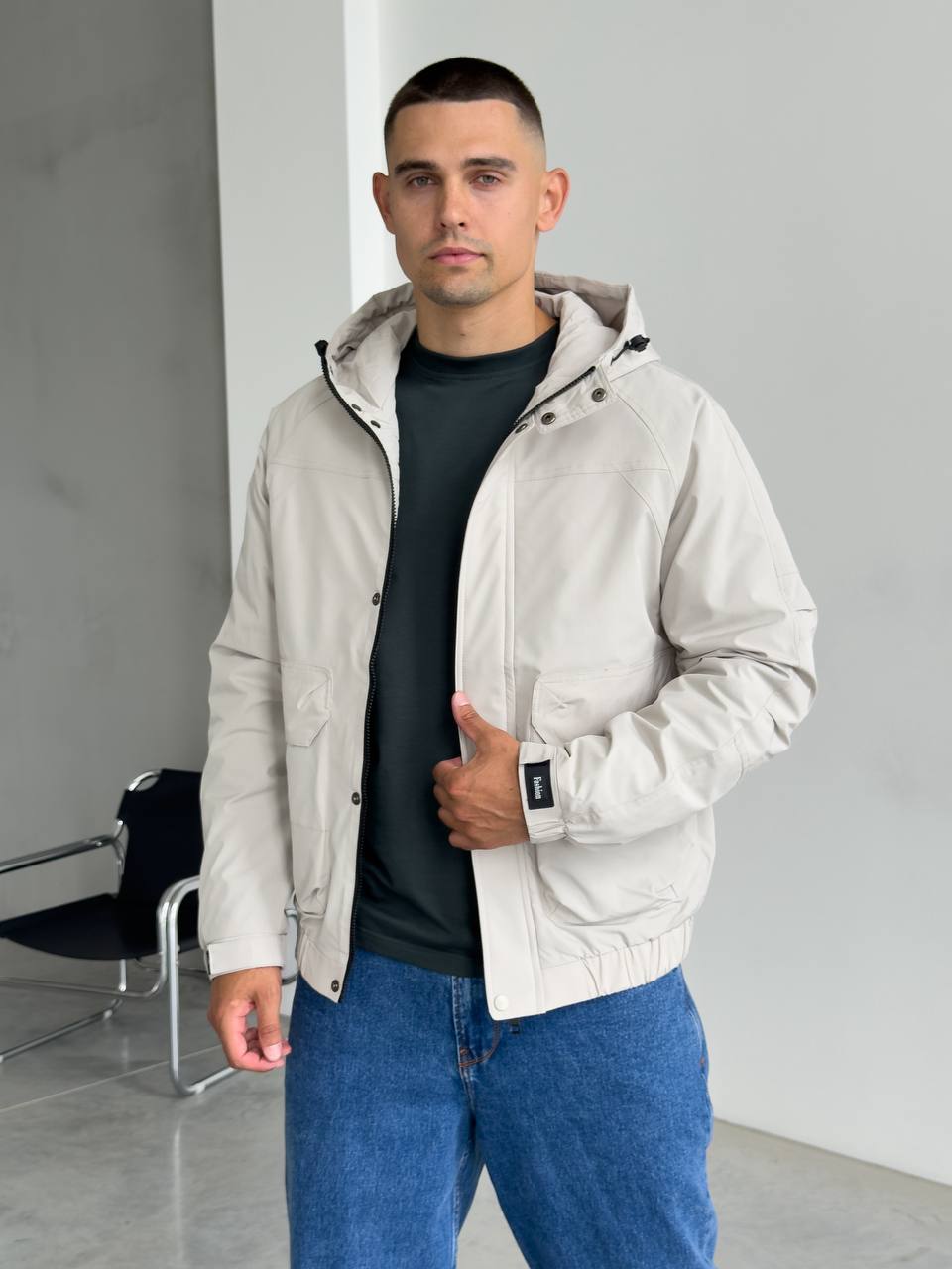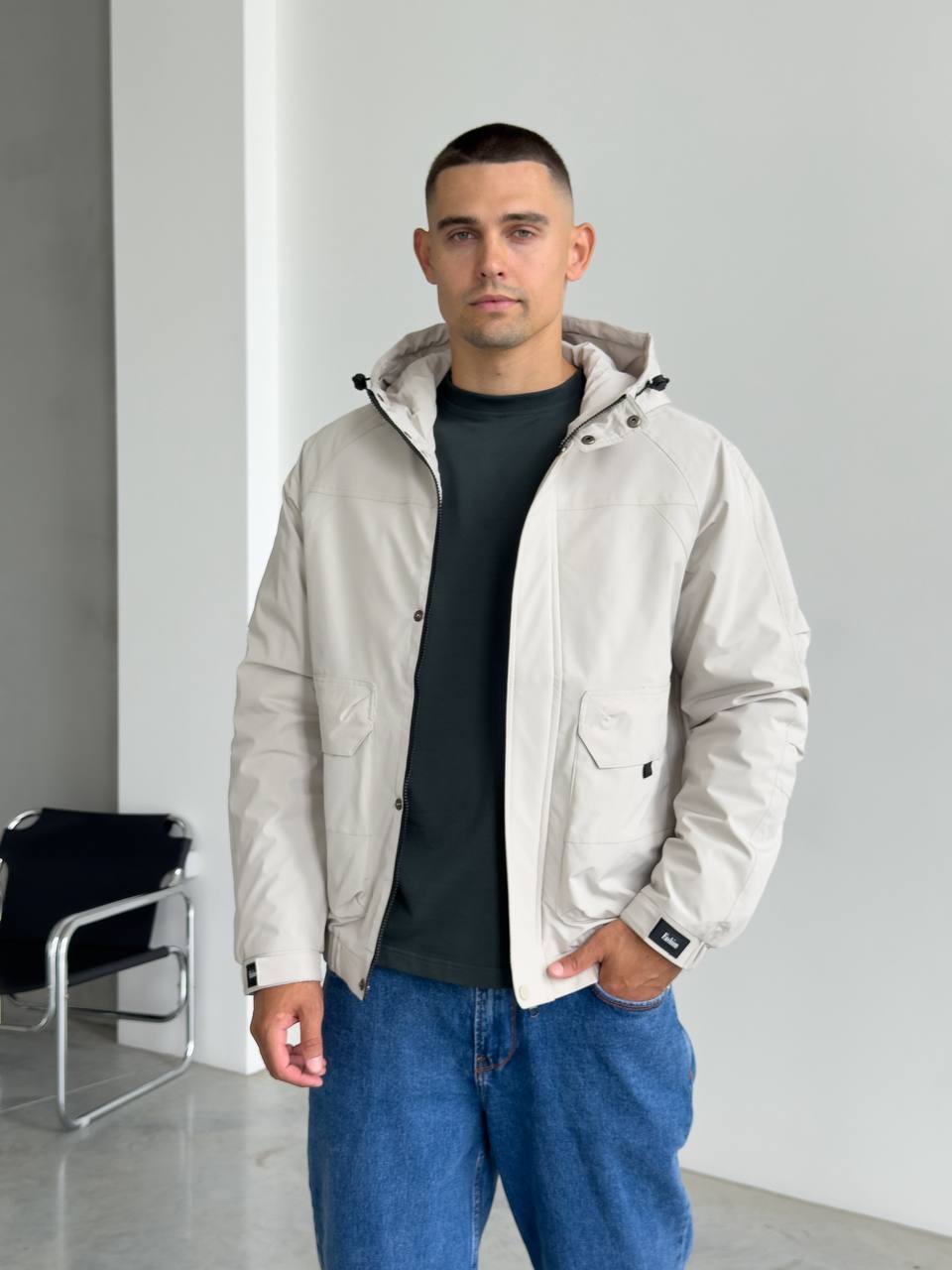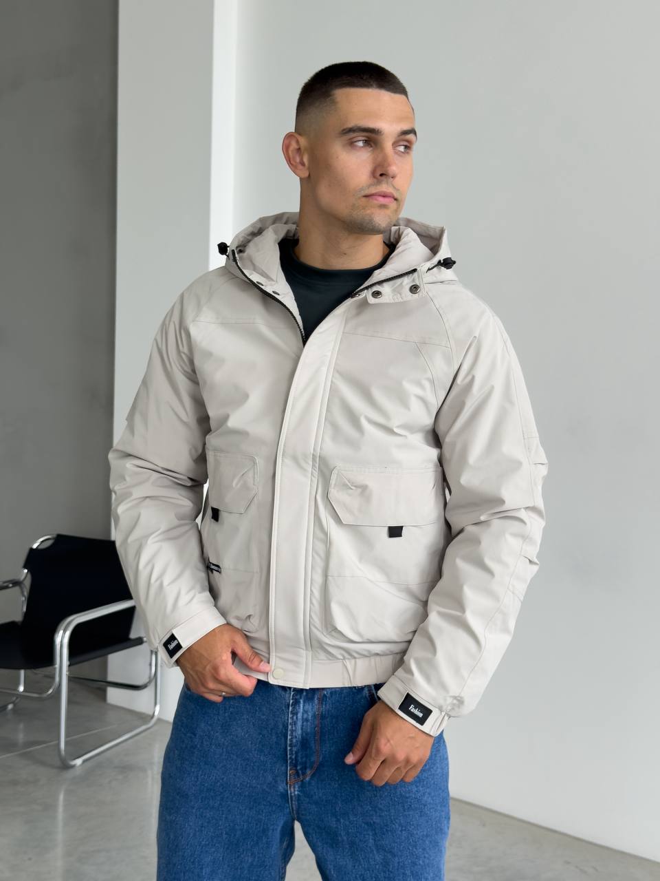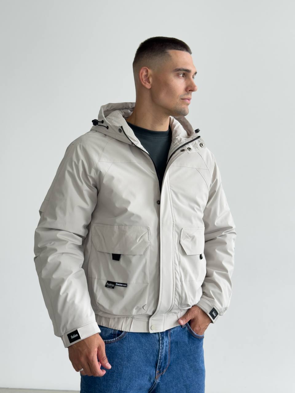 Мужская Демисезонная Серая Куртка с Капюшоном Накладными Карманами и Манжетами на Липучках