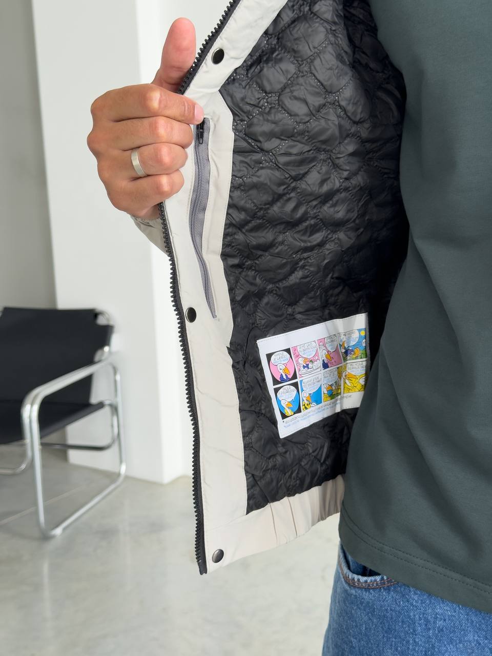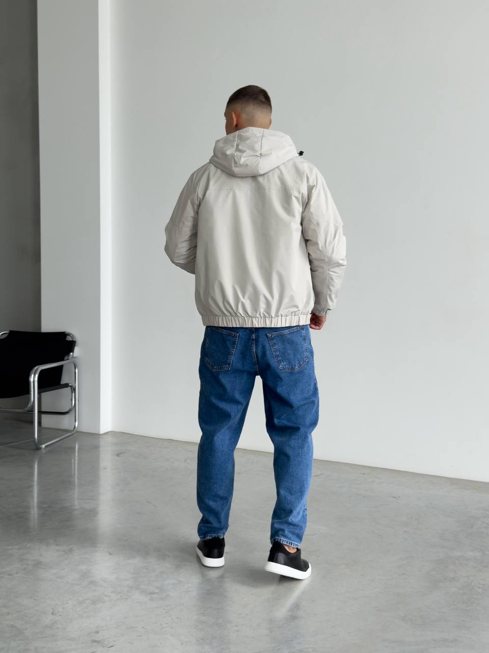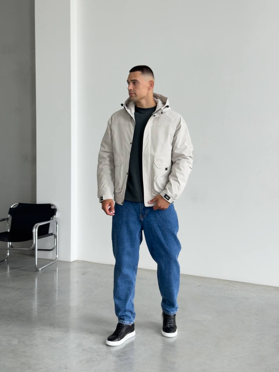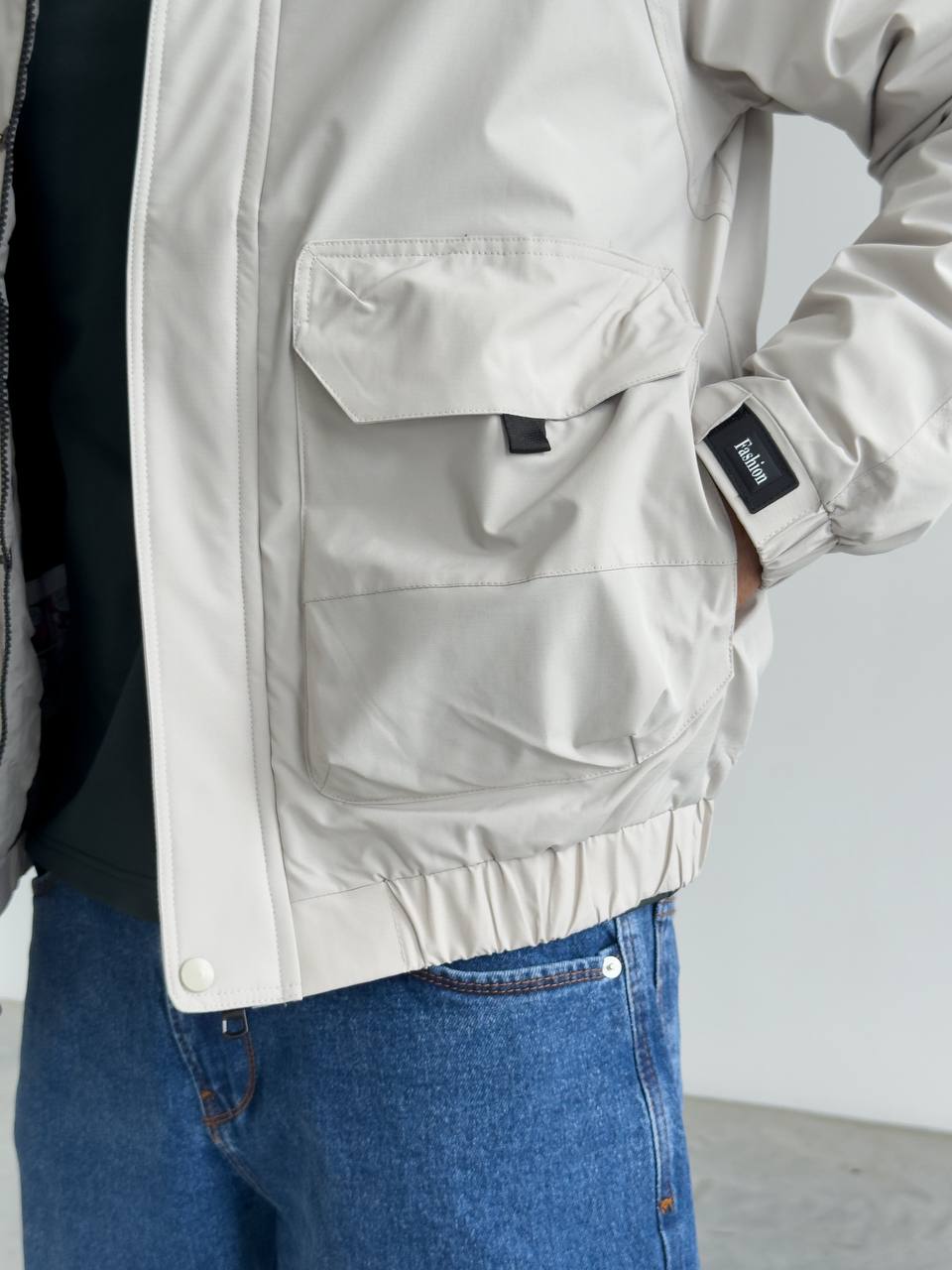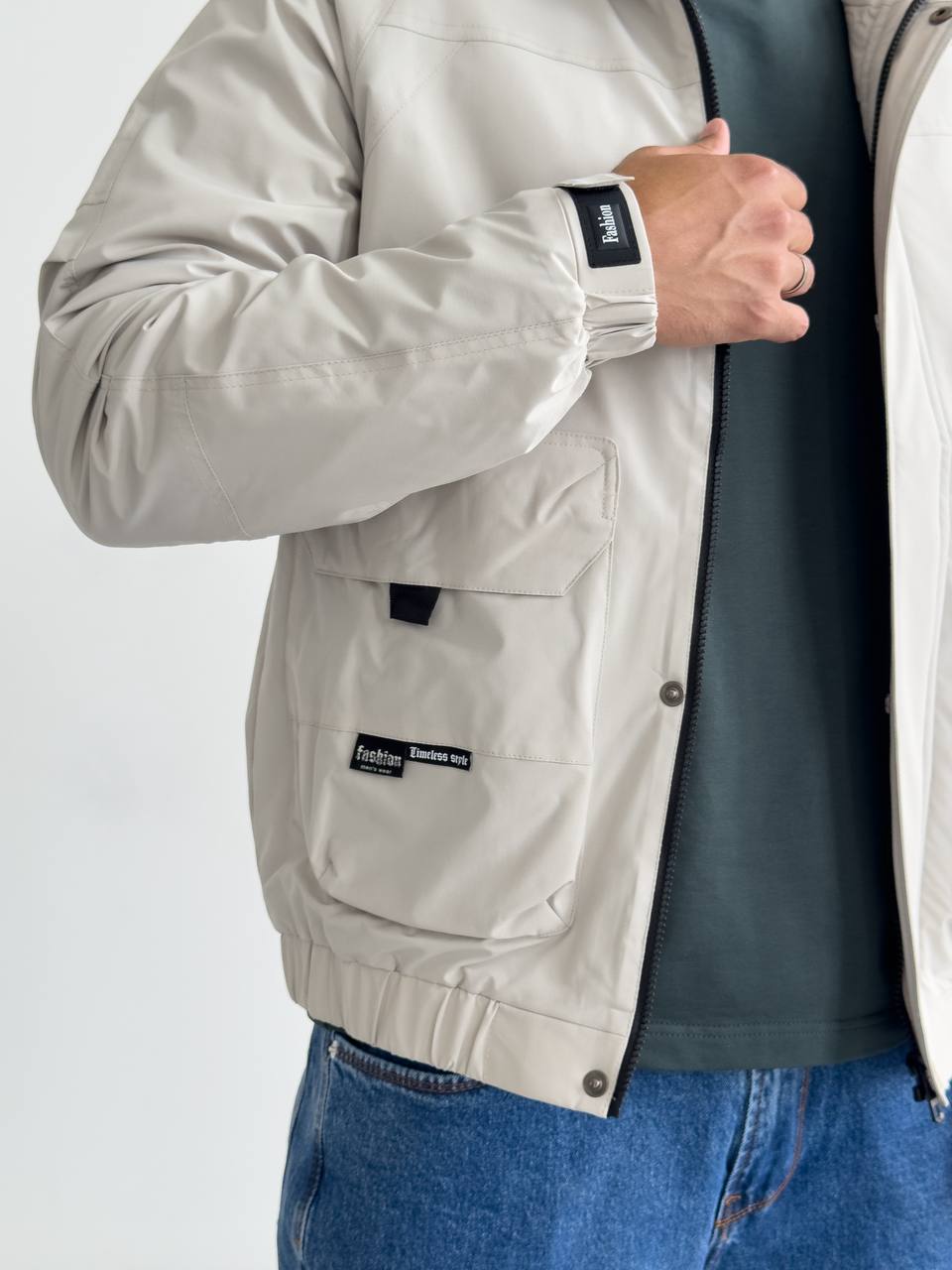 Мужская Демисезонная Серая Куртка с Капюшоном Накладными Карманами и Манжетами на Липучках