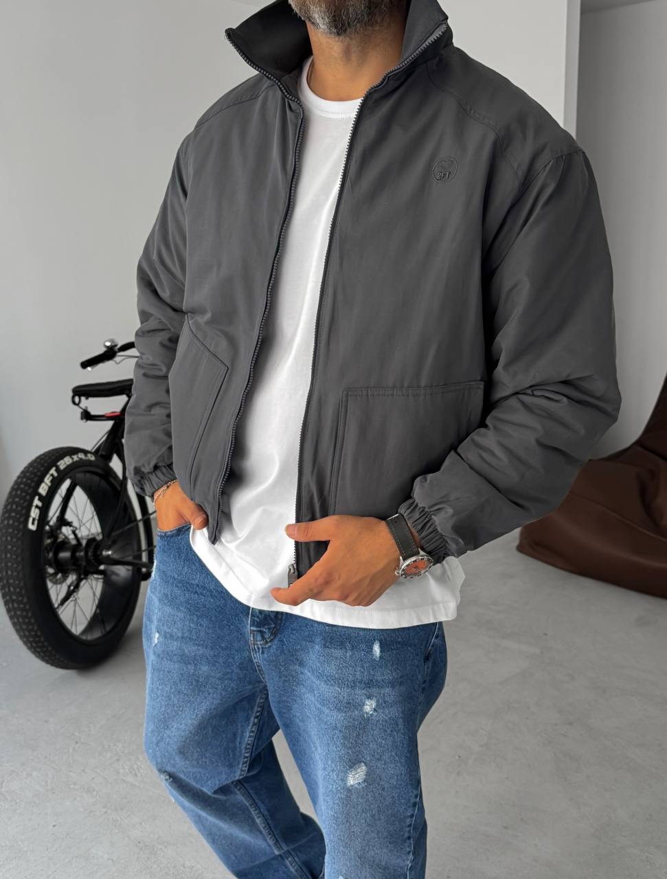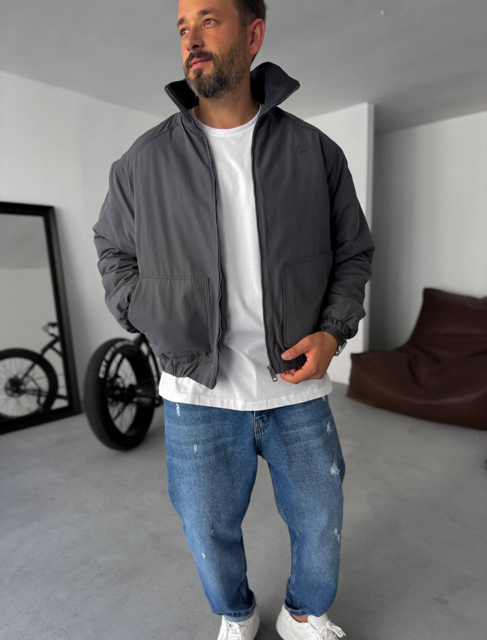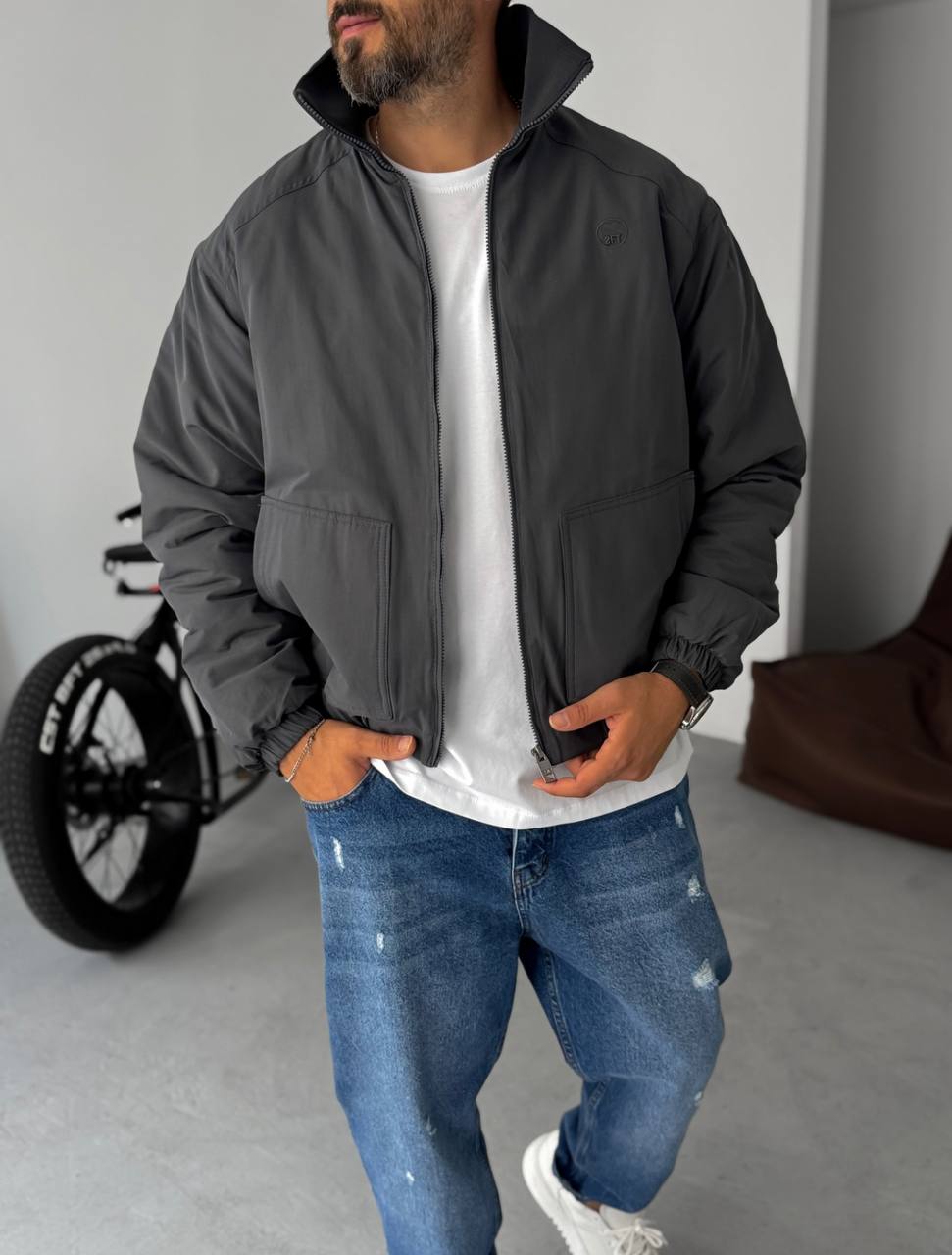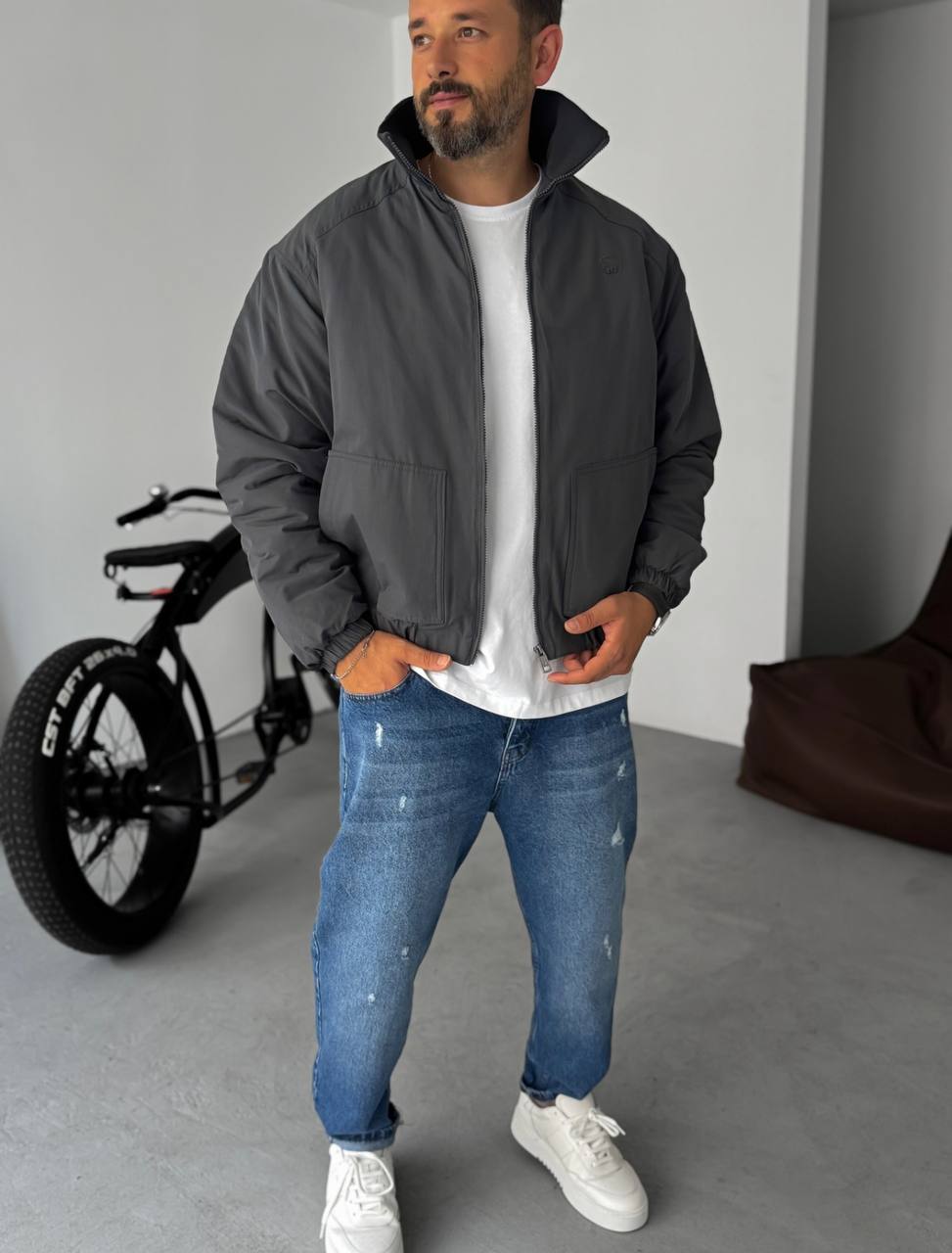 Мужская Демисезонная Темно-Серая Куртка под Горло на Подкладке