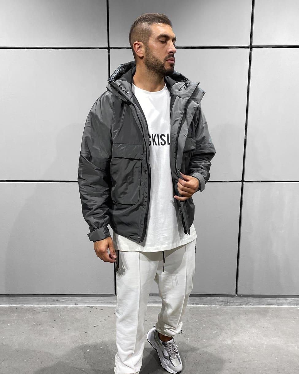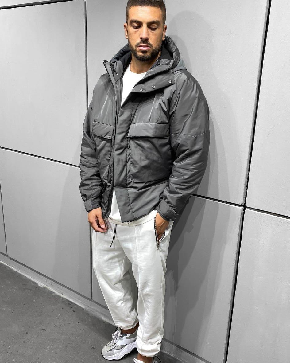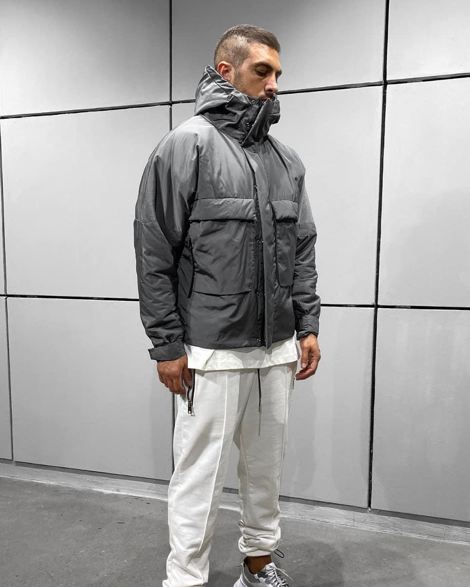 Мужская Демисезонная Темно-Серая Куртка с Капюшоном и Большими Карманами
