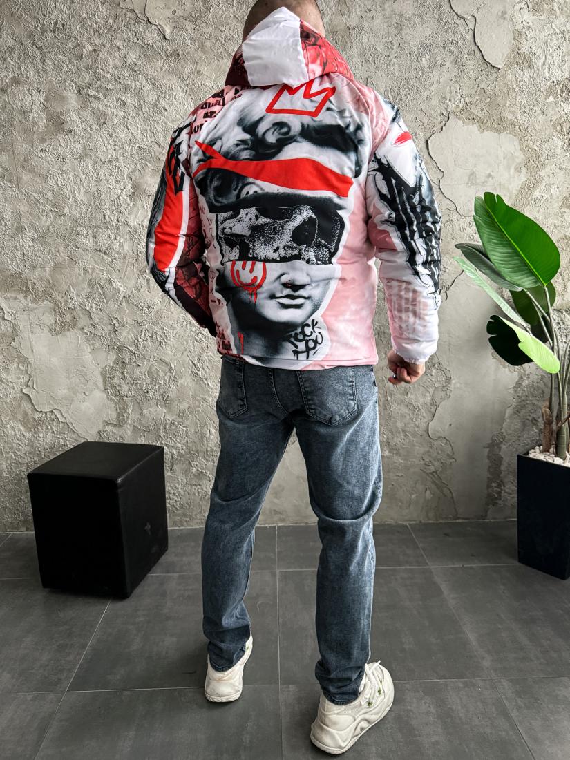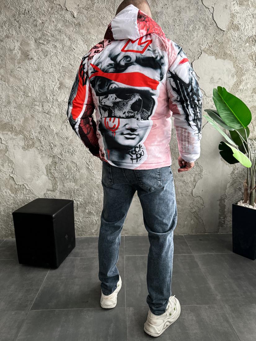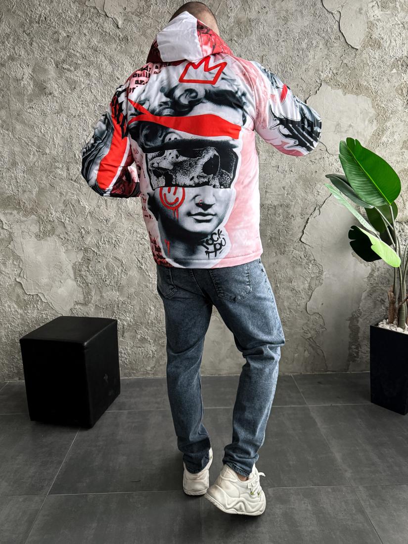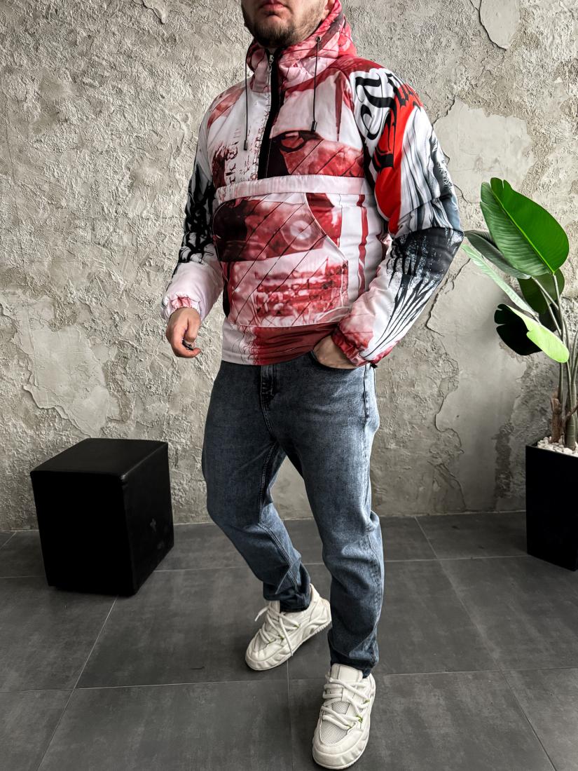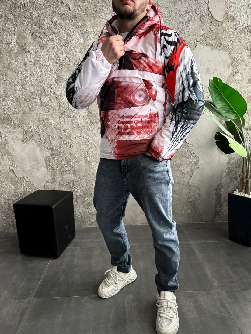 Мужской Утепленный Белый Анорак Плащевка в Принт с Капюшоном