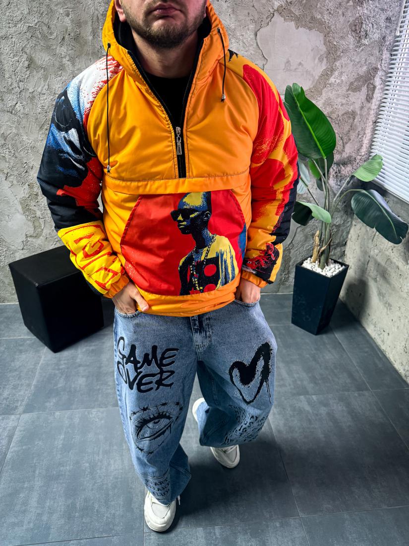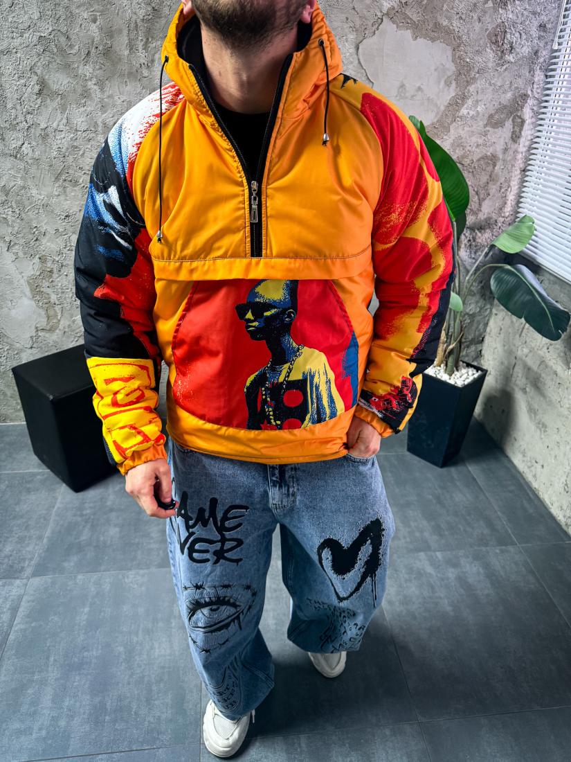 Мужской Утепленный Оранжевый Анорак Плащевка с Капюшоном в Яркий Принт