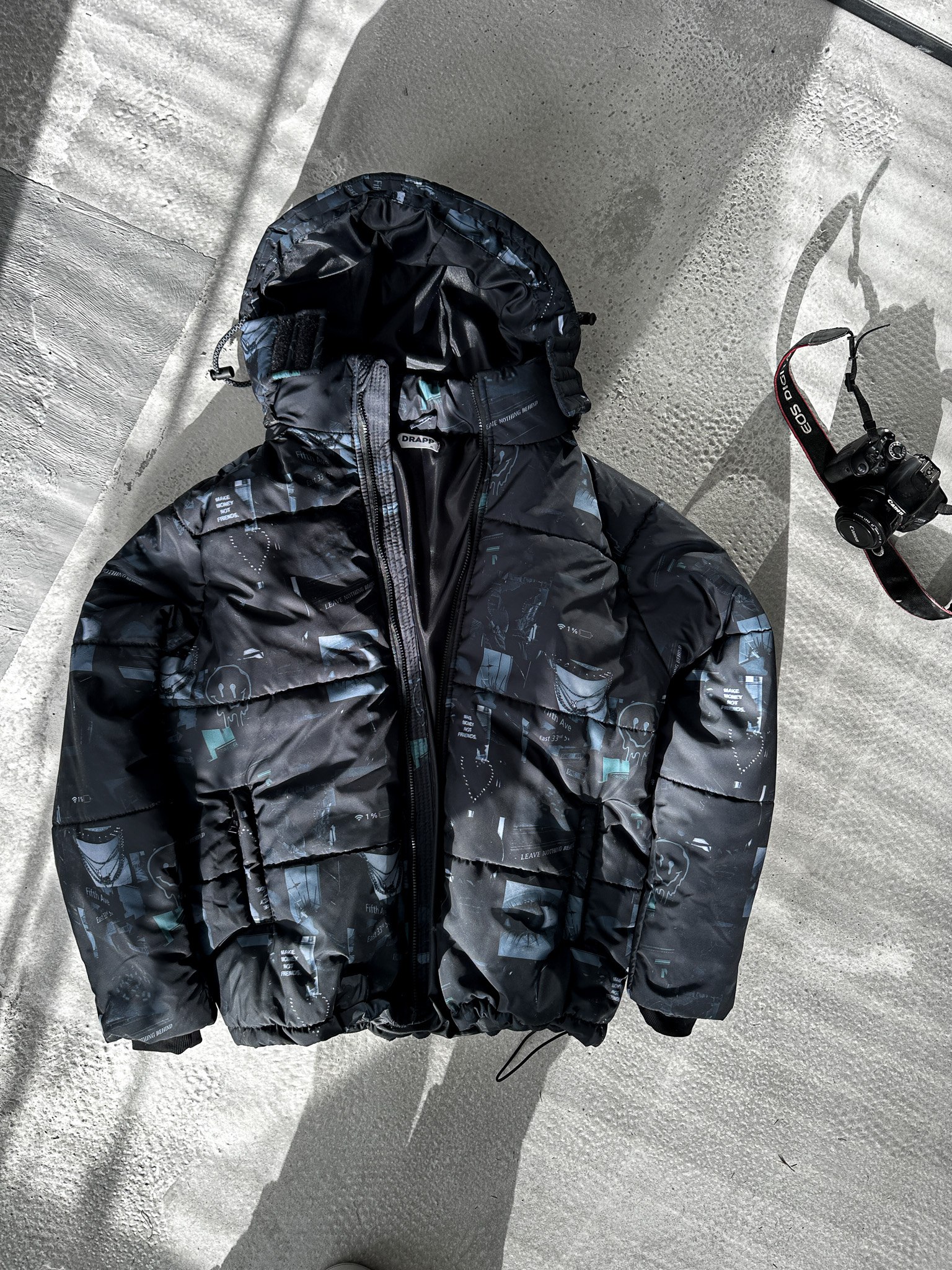 Мужская Черная Куртка на Зиму – Стеганая в Принтах со Съемным Капюшоном