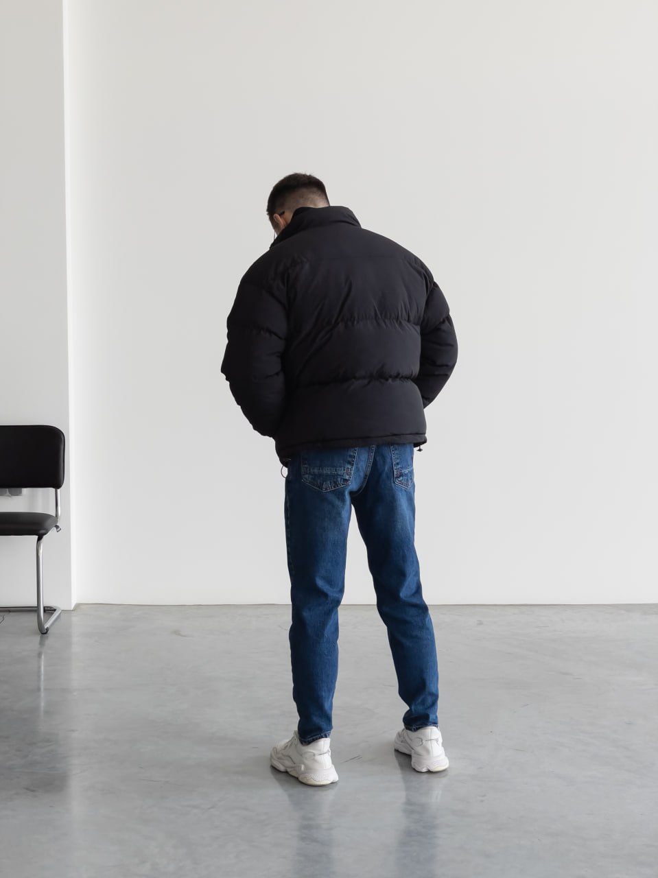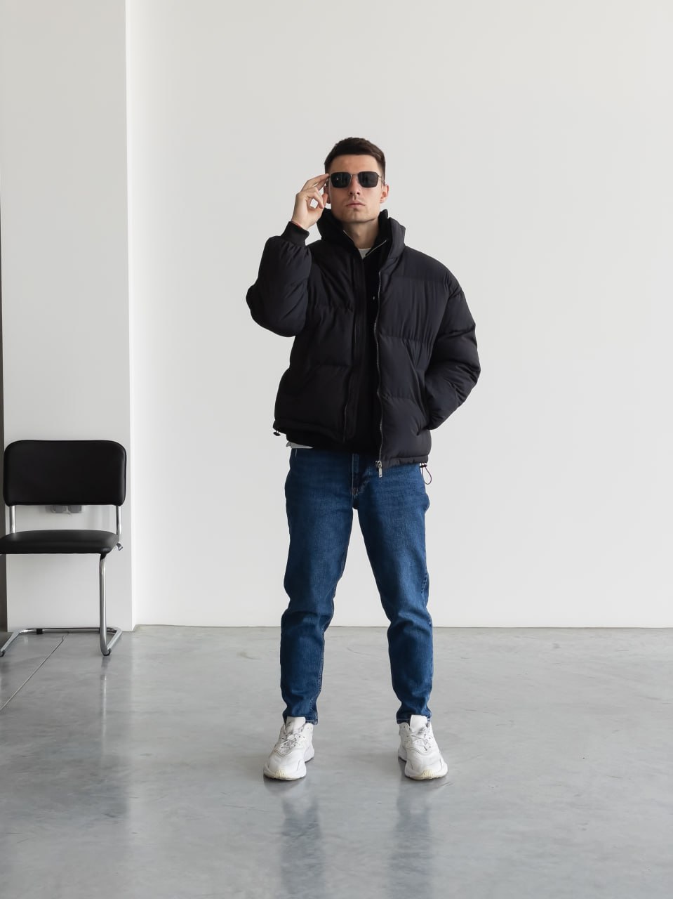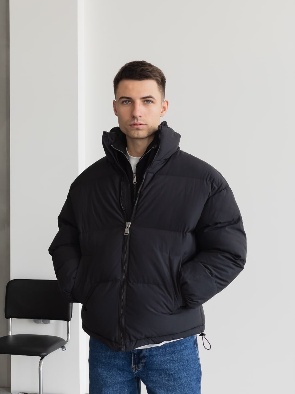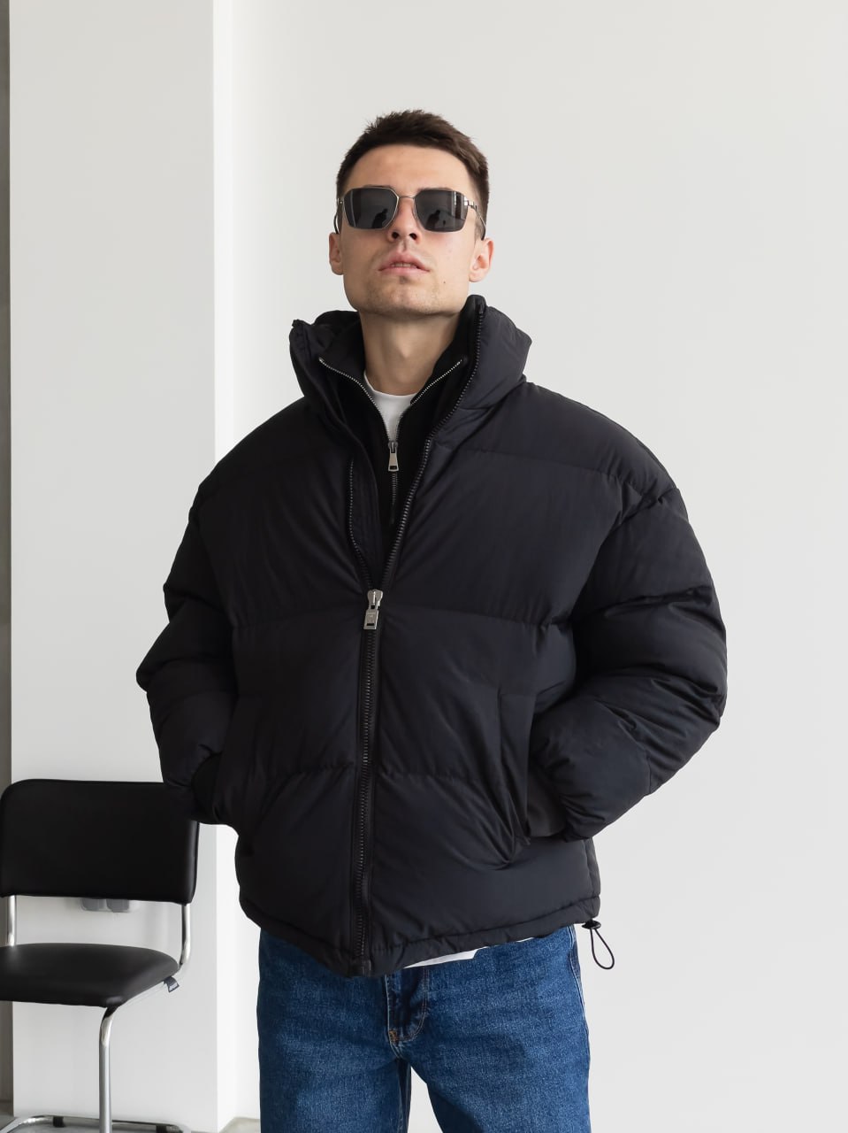 Мужская Дутая Черная Куртка Оверсайз ЕвроЗима с Кулисками и Высоким Воротником