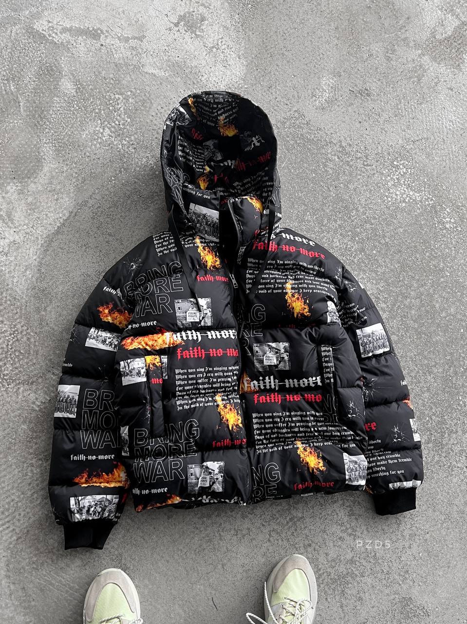Мужская Теплая Черная Куртка на Зиму под Горло с Капюшоном и Манжетами в Яркий Принт