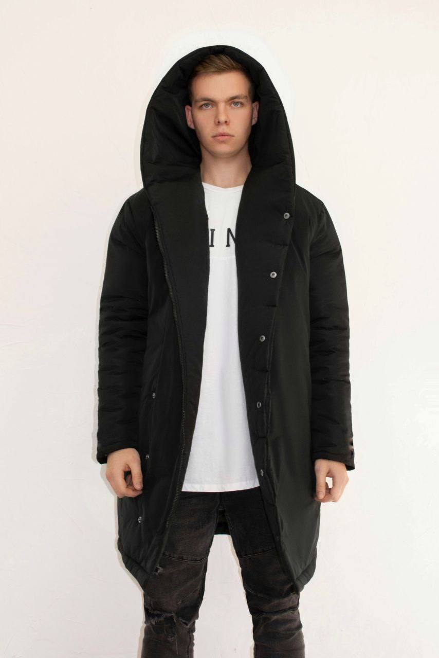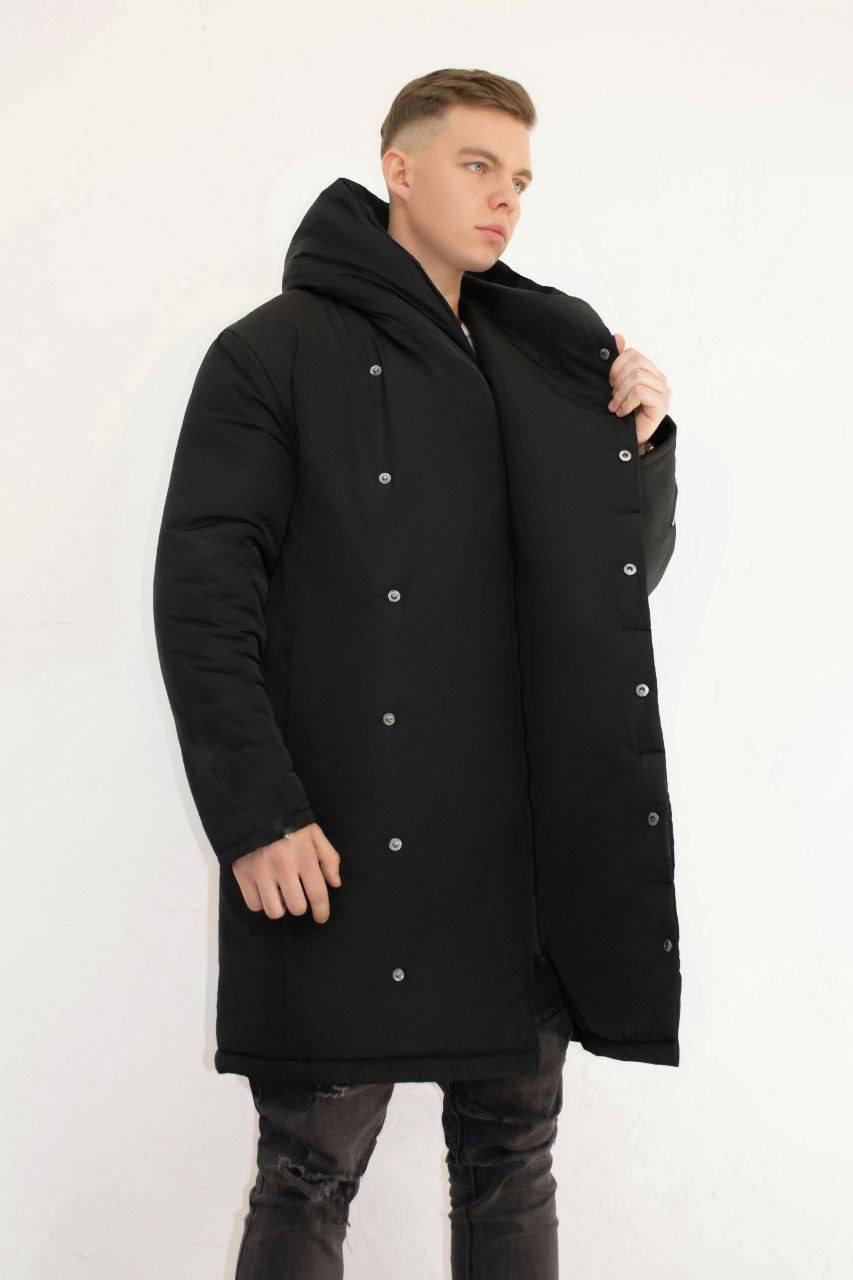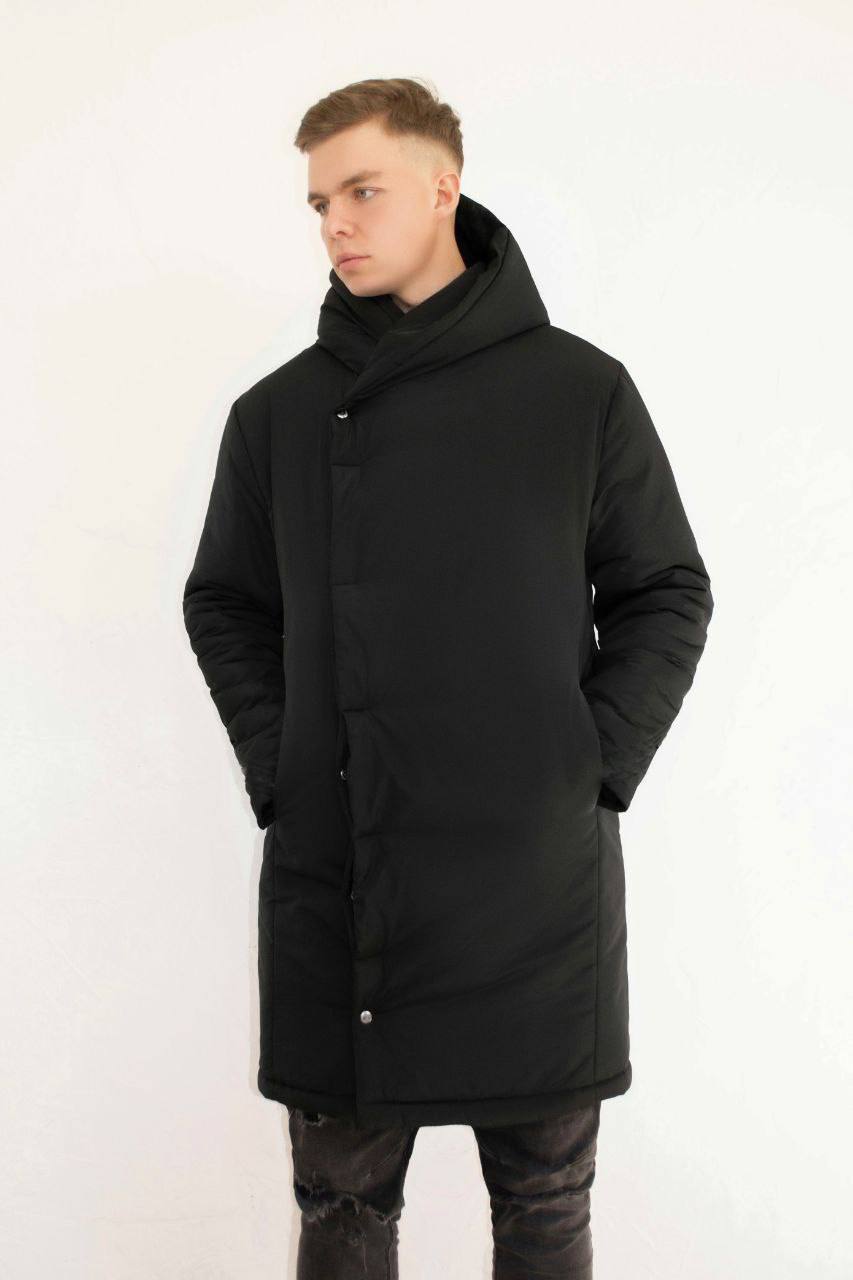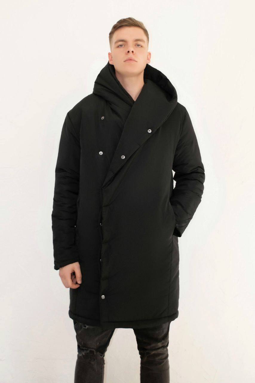 Мужская Удлиненная Зимняя Черная Куртка на Запах с Капюшоном