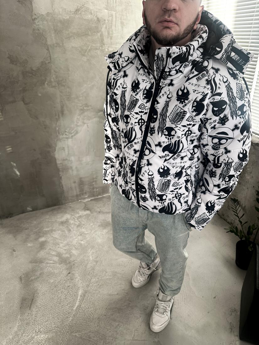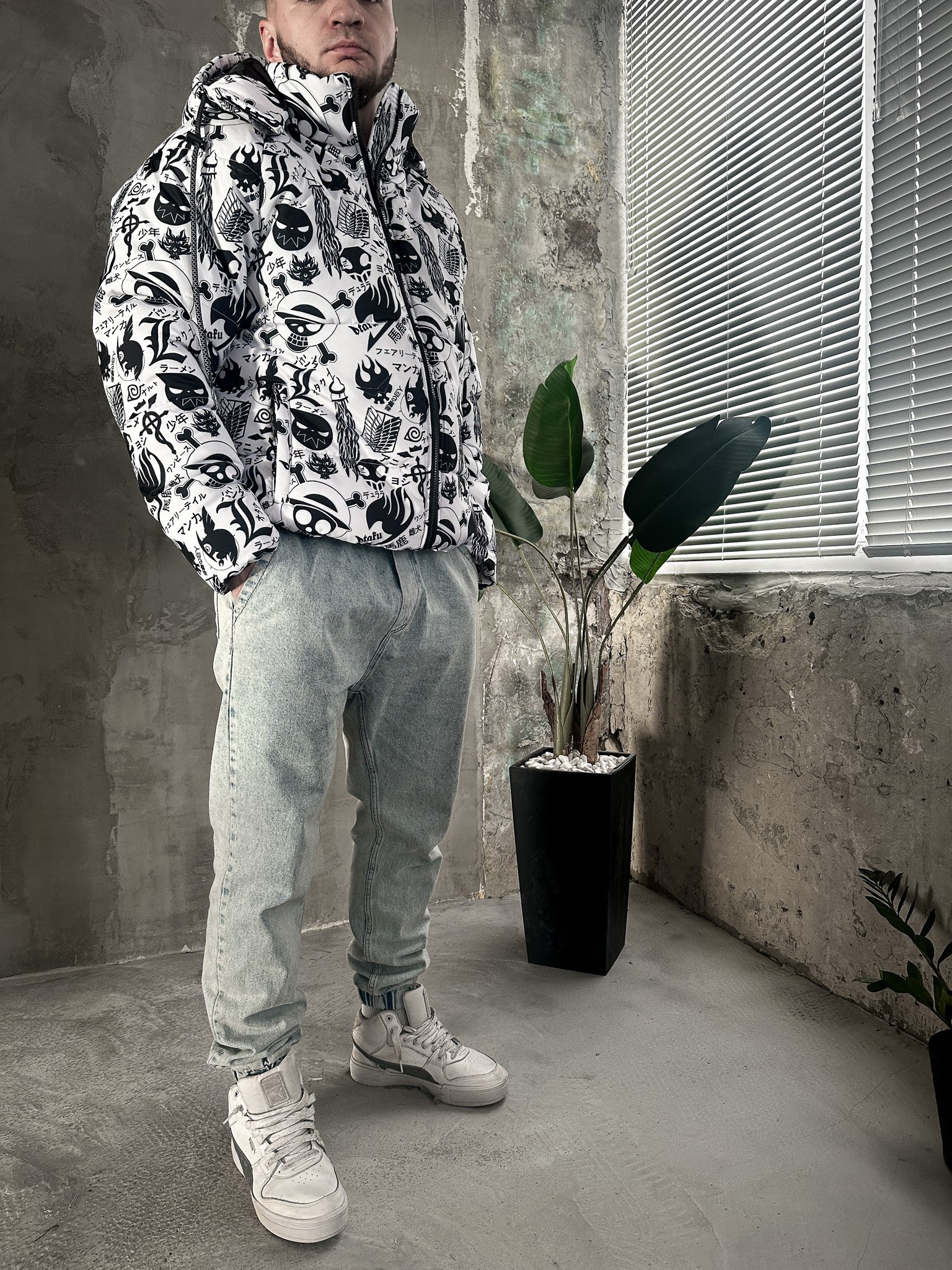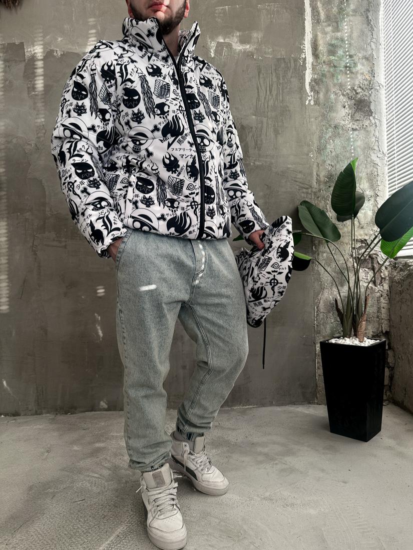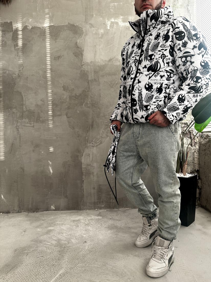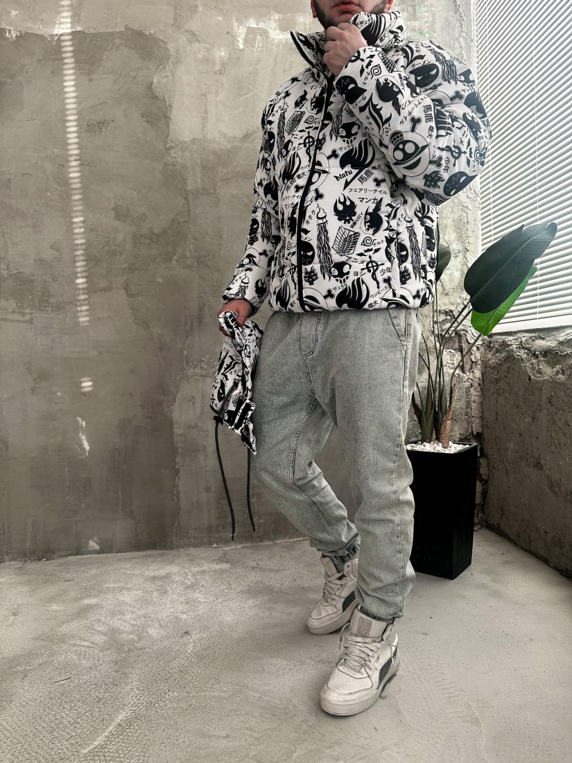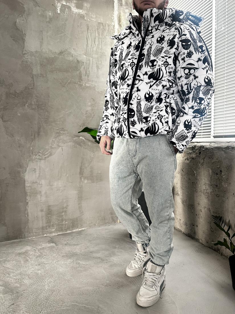Мужская Зимняя Белая Куртка в Принт с Манжетами и Съемным Капюшоном