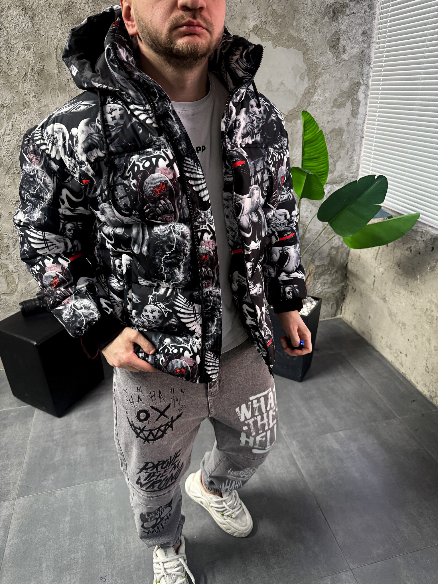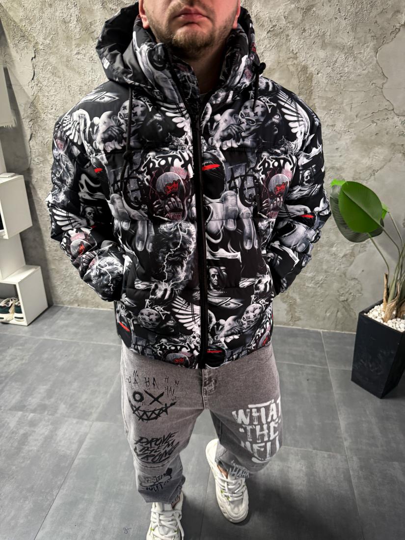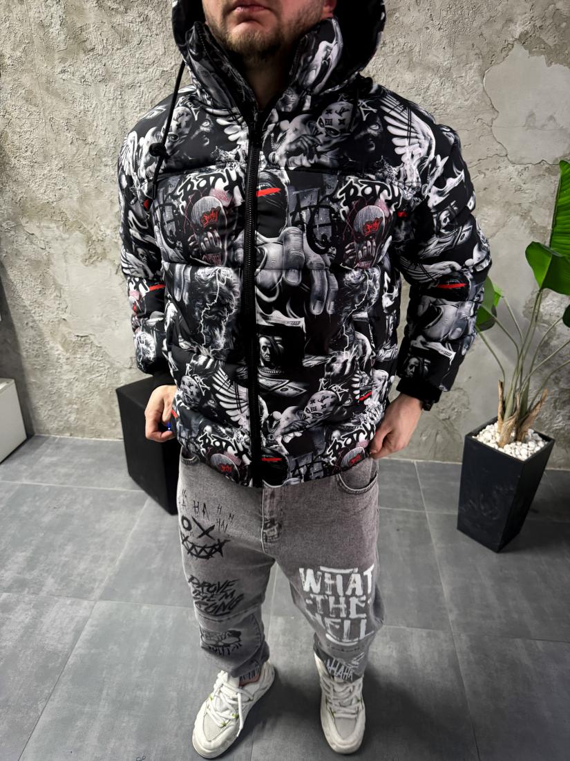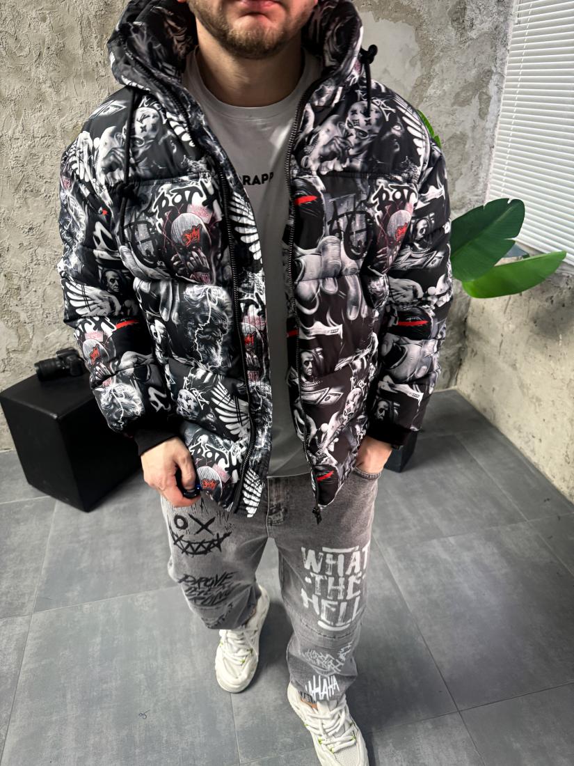 Мужская Зимняя Черная Куртка с Капюшоном и Высоким Горлом – Принтованный Пуховик