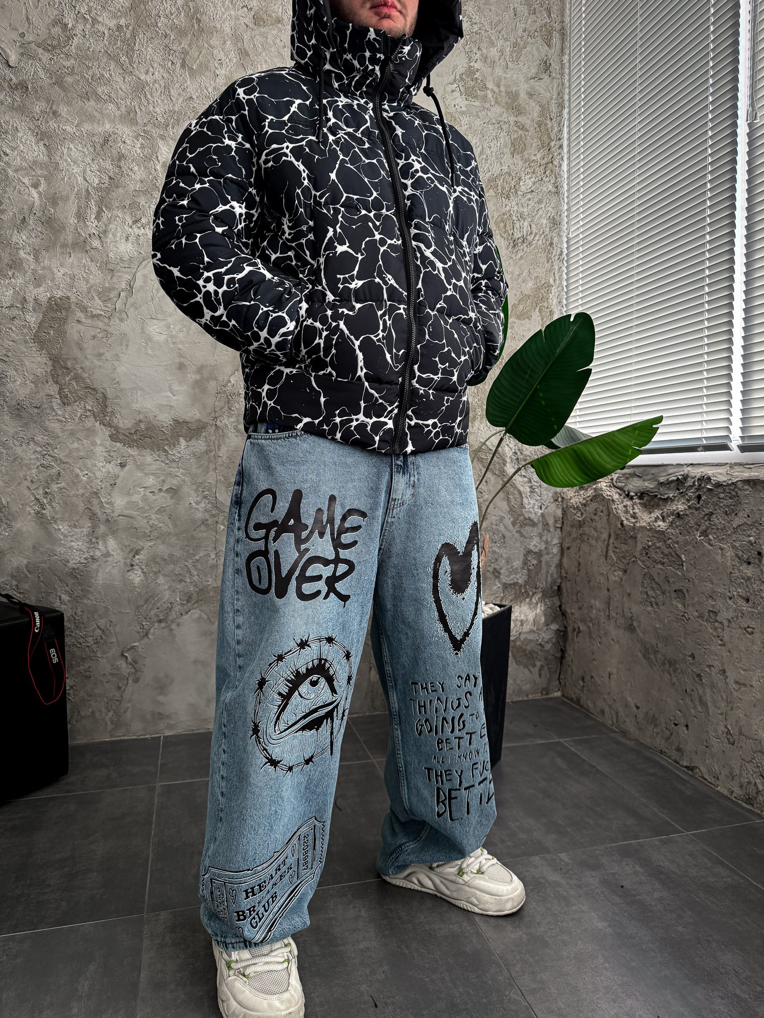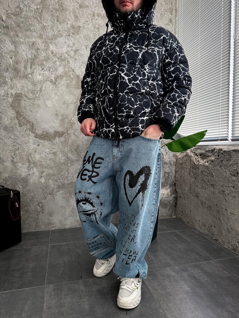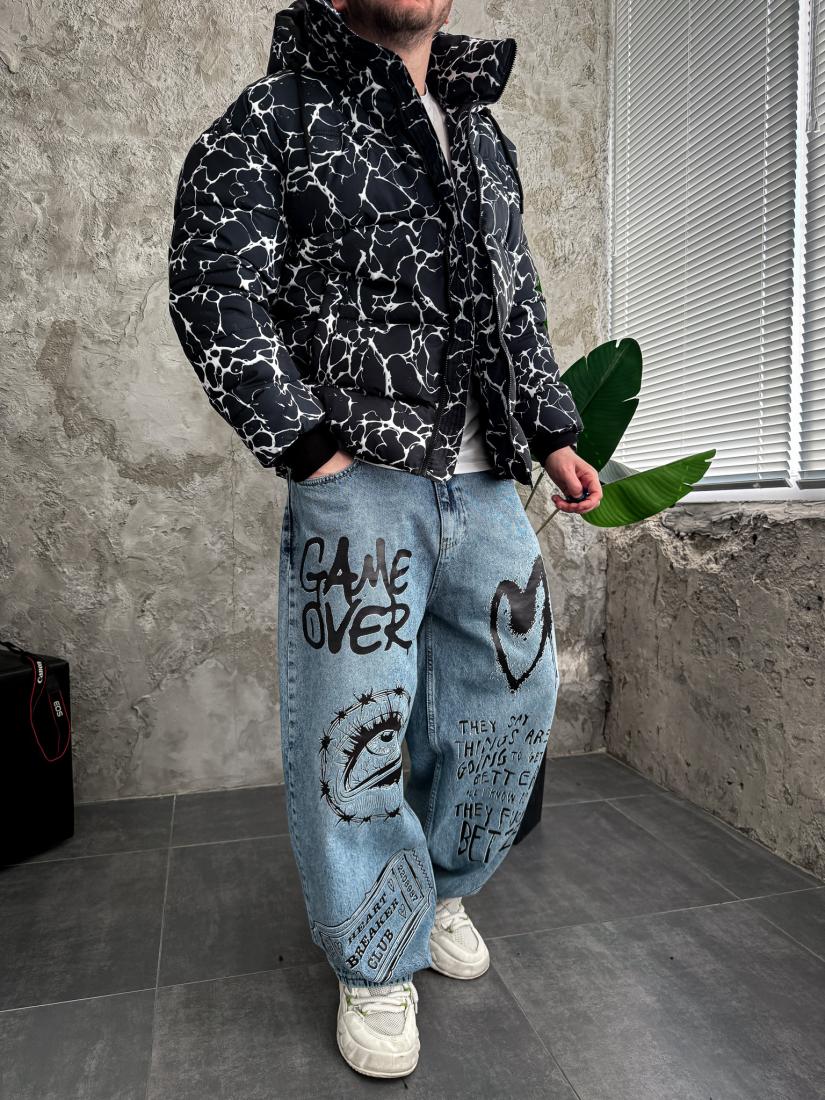 Мужская Зимняя Черная Куртка с Капюшоном и Высоким Горлом – Стебаный Пуховик в Принт