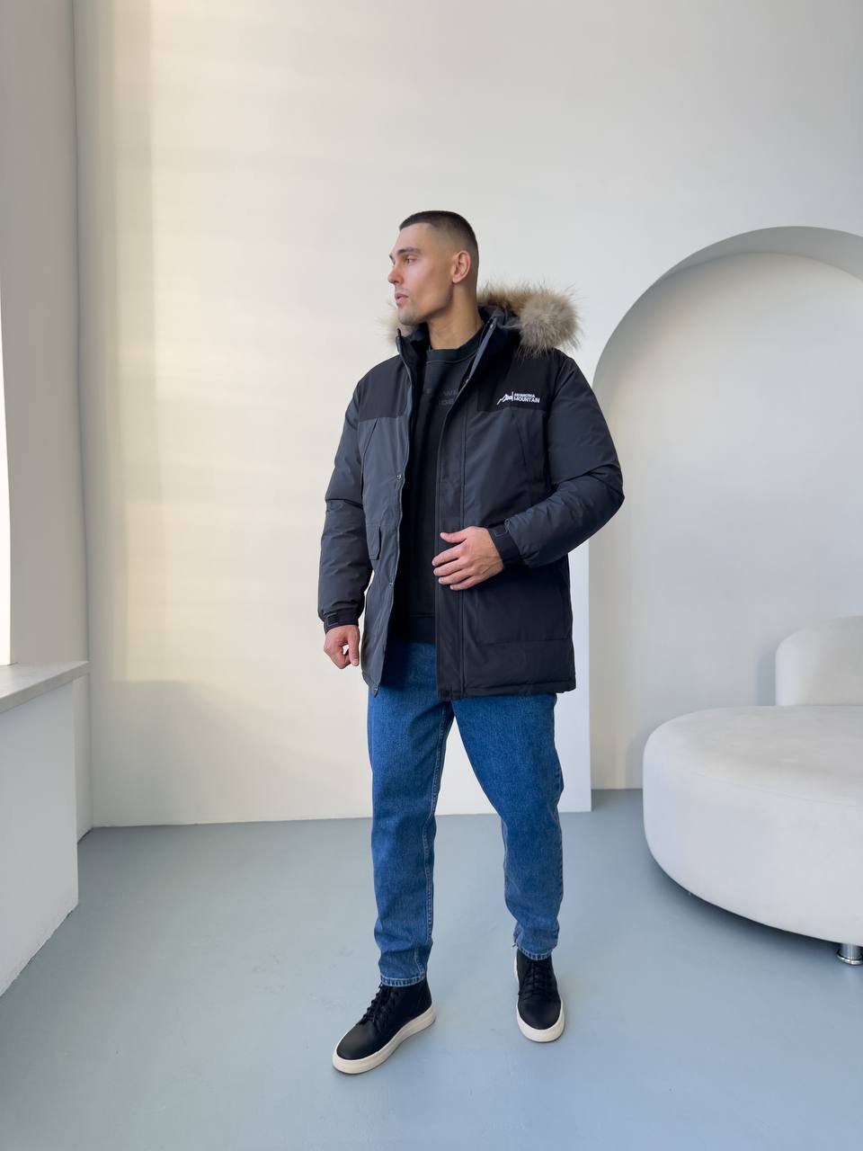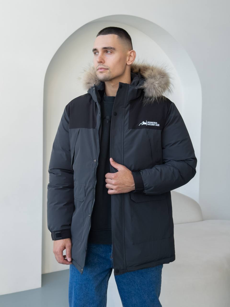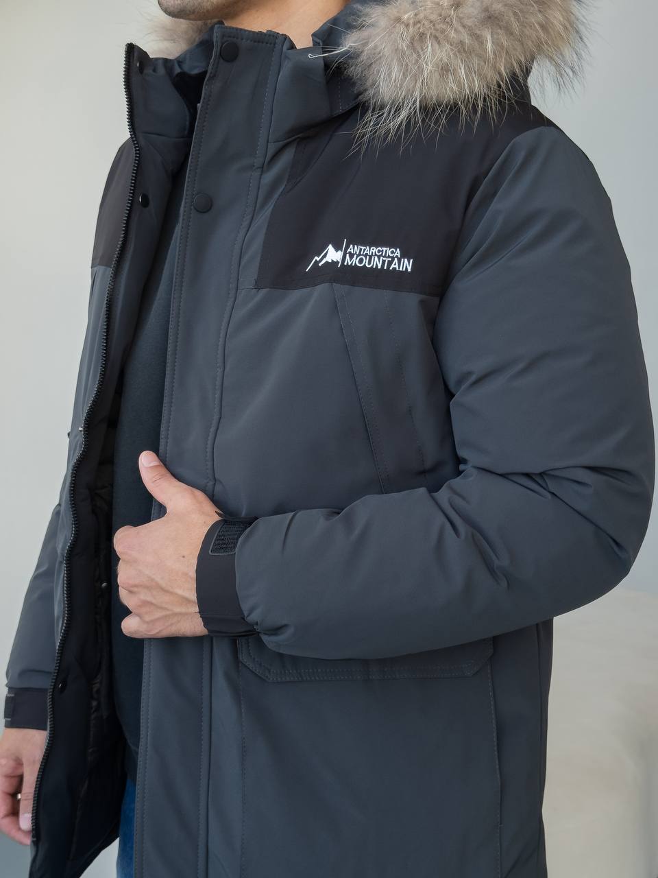Мужская Зимняя Графитовая Куртка с Мехом на Капюшоне и Фиксаторами на Рукавах